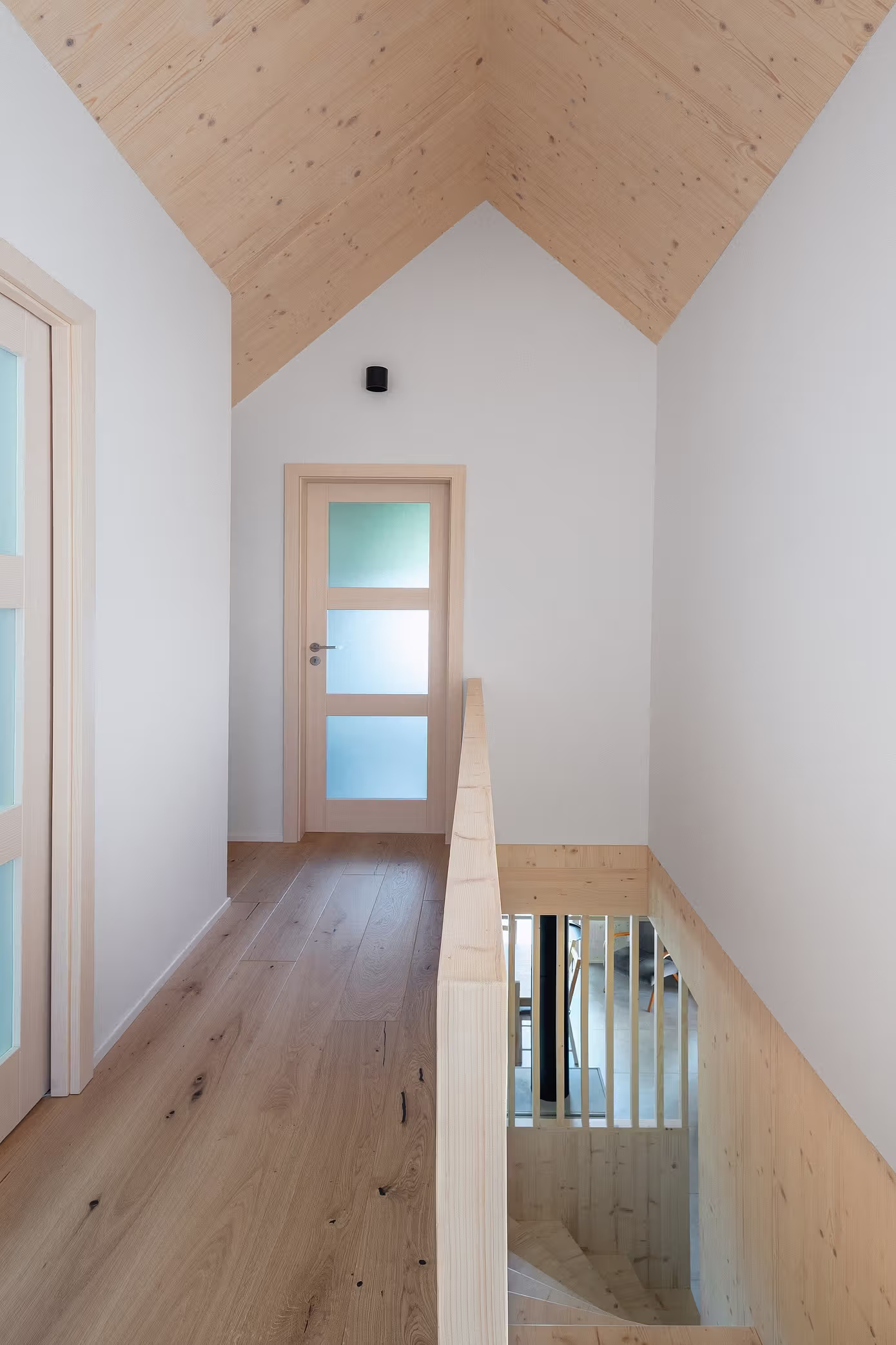 Dom został wykonany w technologii CLT (cross-laminated timber), co gwarantuje trwałość konstrukcji i energooszczędność. Widoczna we wnętrzu drewniana struktura w połączeniu z elewacją z modrzewia i metalowym dachem tworzy wyjątkową estetykę, wpisującą się w ideę nowoczesnej stodoły. Przemyślana integracja przesuwnych okiennic pozwala na regulację ilości światła i prywatności. Całość powstała przy ścisłej współpracy projektantów z rodzinną firmą budowlaną 3AE, dbającą o wysoką jakość wykonania.
