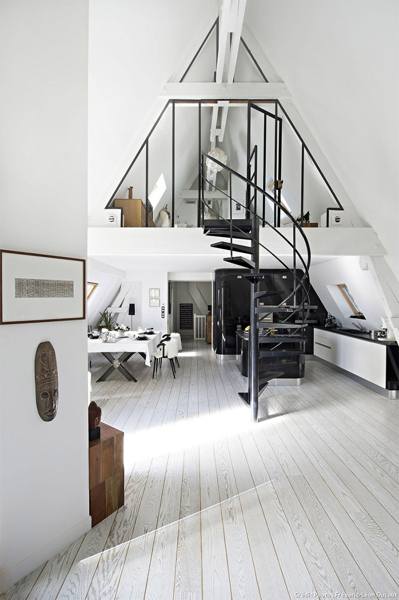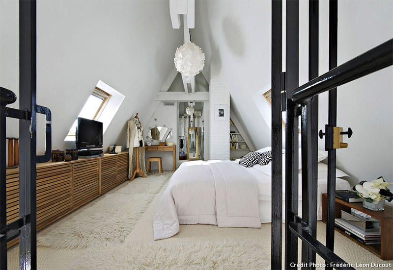 Ten niewielki, nowoczesny loft powstał w miejscu dawnej, niewykorzystanej przestrzeni poddasza i dziś funkcjonuje jako stylowy penthouse w sercu Paryża. Aranżacja oparta na kontrastowym połączeniu czerni i bieli nadaje wnętrzu elegancki, ponadczasowy charakter, typowy dla współczesnych loftów miejskich. Drewniane podłogi, dekoracyjne ściany, miękkie tkaniny oraz dywany wprowadzają do wnętrza ciepło i przytulność, równoważąc surową estetykę loftu. To przykład przemyślanej adaptacji poddasza, w której funkcjonalność spotyka się z wysmakowanym designem.