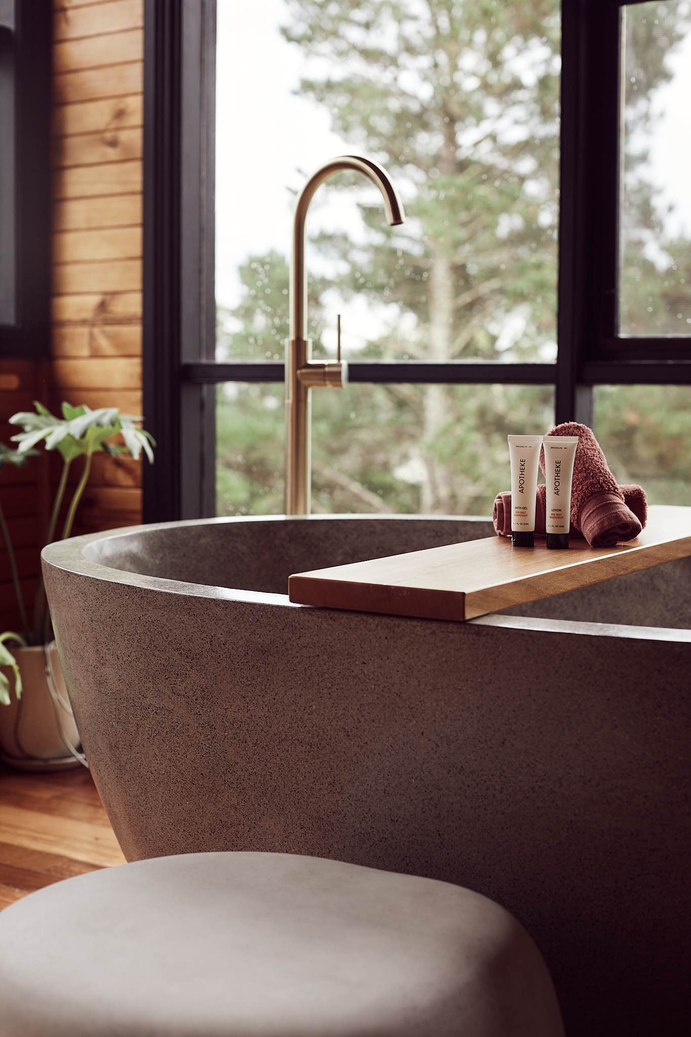 Woodland Cabin oddaje klimat gór i otaczających ją formacji skalnych. Z zewnątrz zachowuje swoją drewnianą, pierwotną fasadę, podczas gdy wnętrze wprowadza luksus w mineralnej, głęboko ziemistej tonacji. Kamienne ściany i wolnostojąca wanna przypominają o skalistym otoczeniu, tworząc przestrzeń zmysłową i spokojną, idealną do medytacji i odpoczynku.