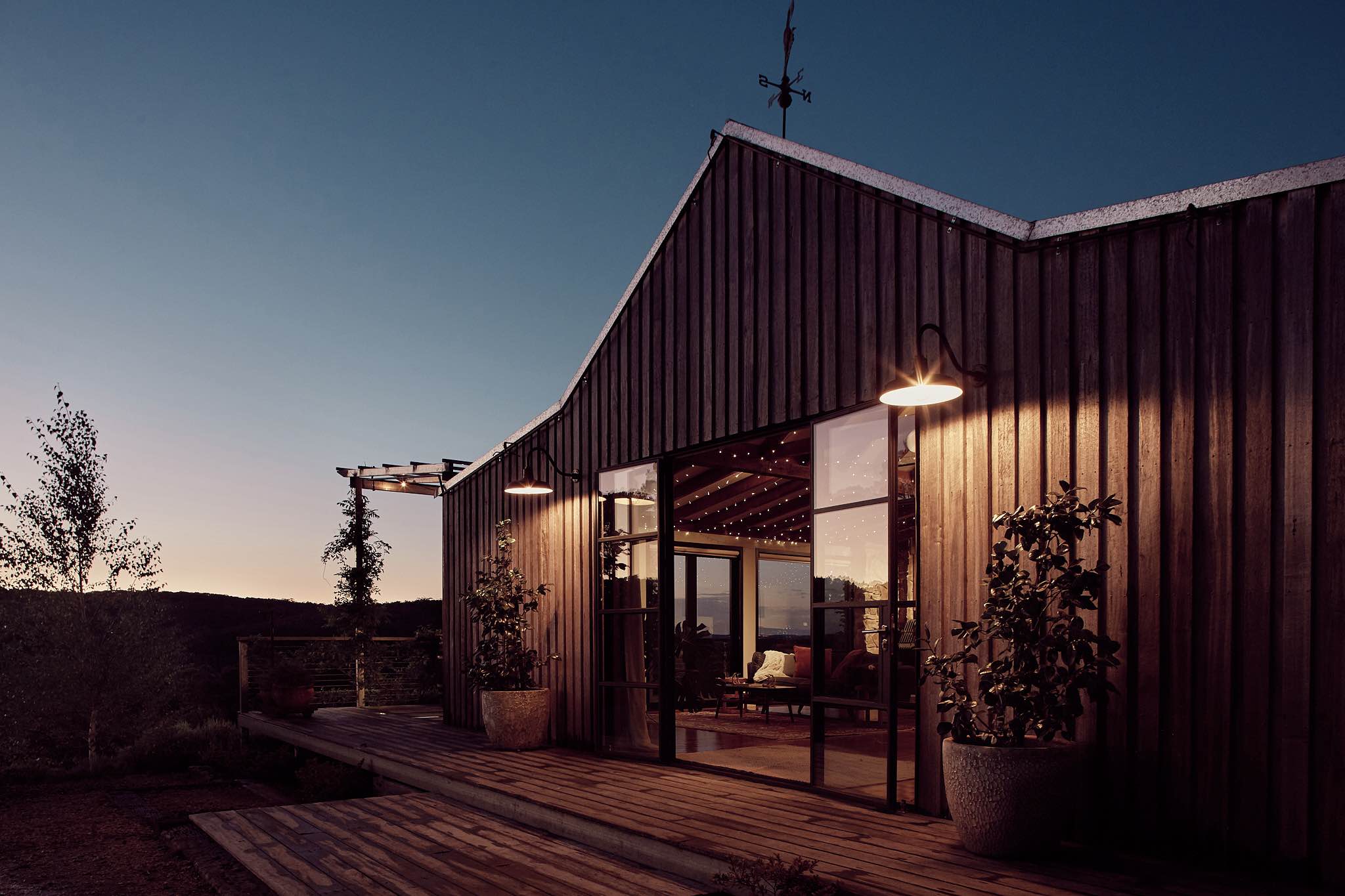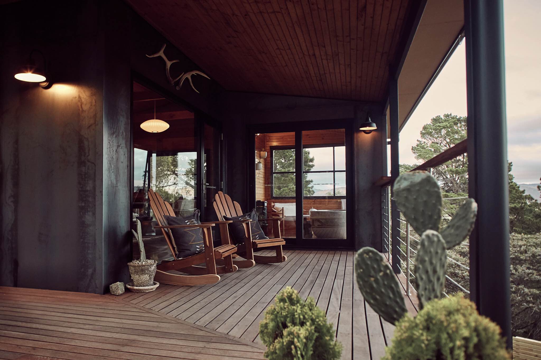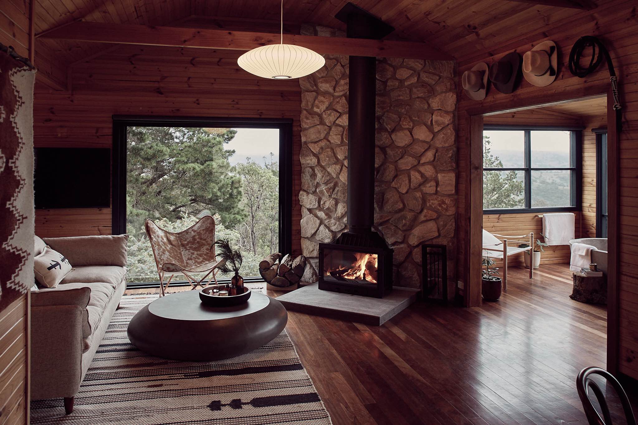 Hilltop Cabin to transformacja ciasnej, blaszanej chatki w pełną światła i luksusu przestrzeń inspirowaną amerykańskimi domkami z bali. Zachowano oryginalną bryłę i kształt dachu, wymieniając jednak ściany i okna, dodając nowe materiały, a także wprowadzając elementy takie jak kamienna wanna czy zewnętrzny plunge pool. Efekt to miejsce romantyczne, lekkie i dopieszczone, idealne dla par.