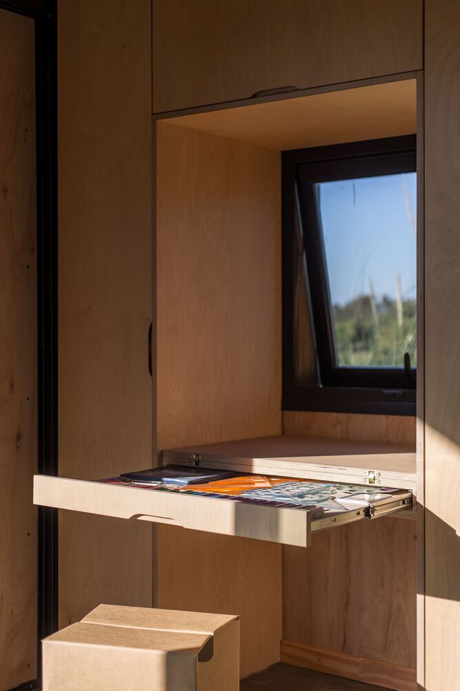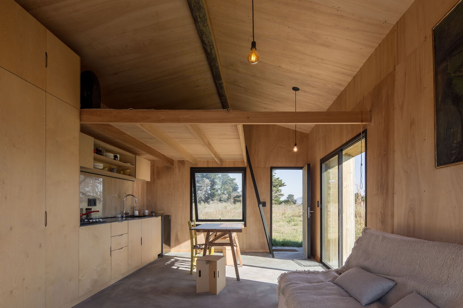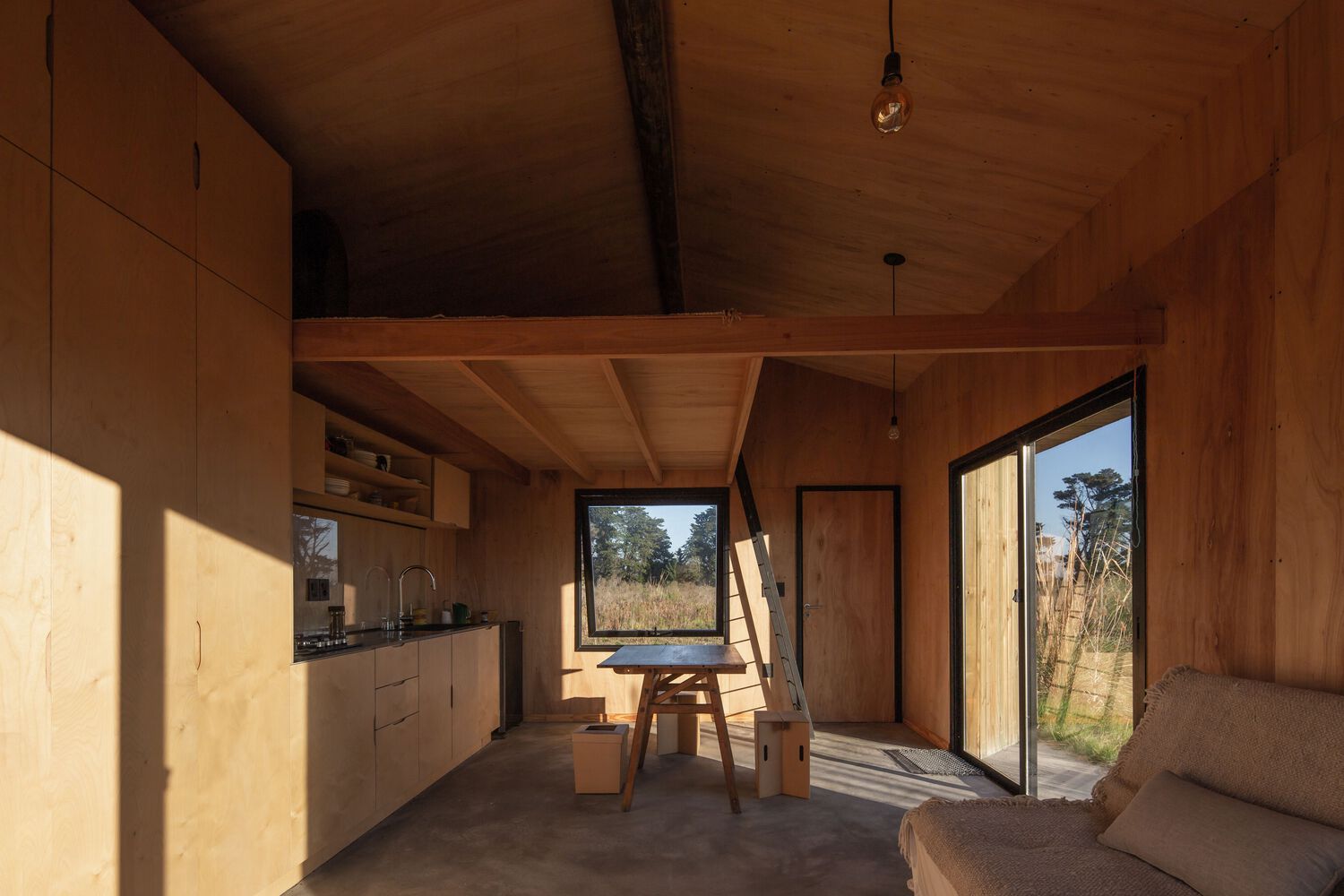 We wnętrzu znalazły się: zabudowana kuchnia, antresola z częścią sypialną oraz naturalne materiały i ziemista kolorystyka. Dostęp do strefy usługowej poprowadzono z zewnątrz – w nawiązaniu do tradycyjnych domów wiejskich.