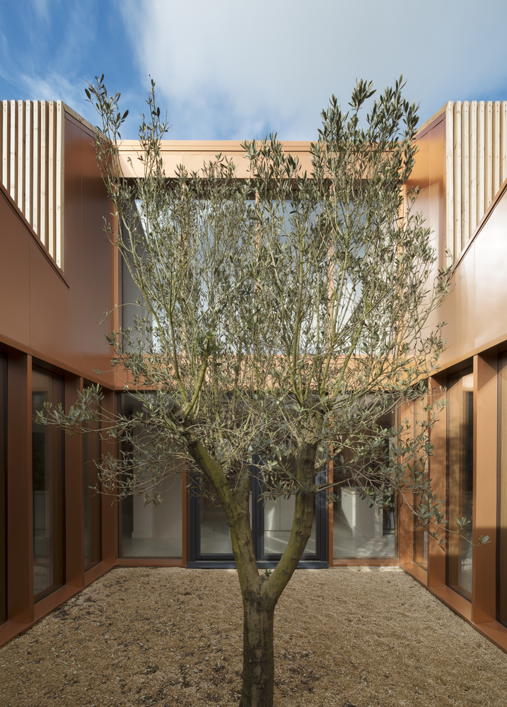 Dom bazuje na formach dwóch 30-metrowych drewnianych kurników, które wcześniej znajdowały się na działce. Projekt opiera się na tradycyjnych bryłach stodół, które zostały „przesunięte” i „rozciągnięte”, aby spełnić potrzeby właściciela. Centralnym punktem wnętrza jest patio, wykończone miedzią, które wprowadza do przestrzeni światło i naturę.