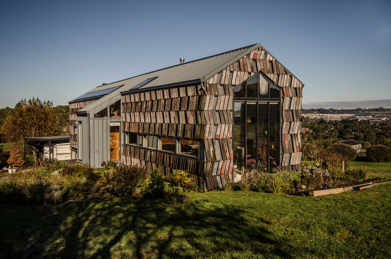 Z zewnątrz dom pokryty jest oryginalną elewacją. Niebiesko-szara blacha łączy się na ścianie północnej, wschodniej i południowej z drewnem modrzewiowym pochodzącym z odzysku, które ułożono na metalowej konstrukcji w sposób skośny, która nadaje całości efekt dynamiczny.