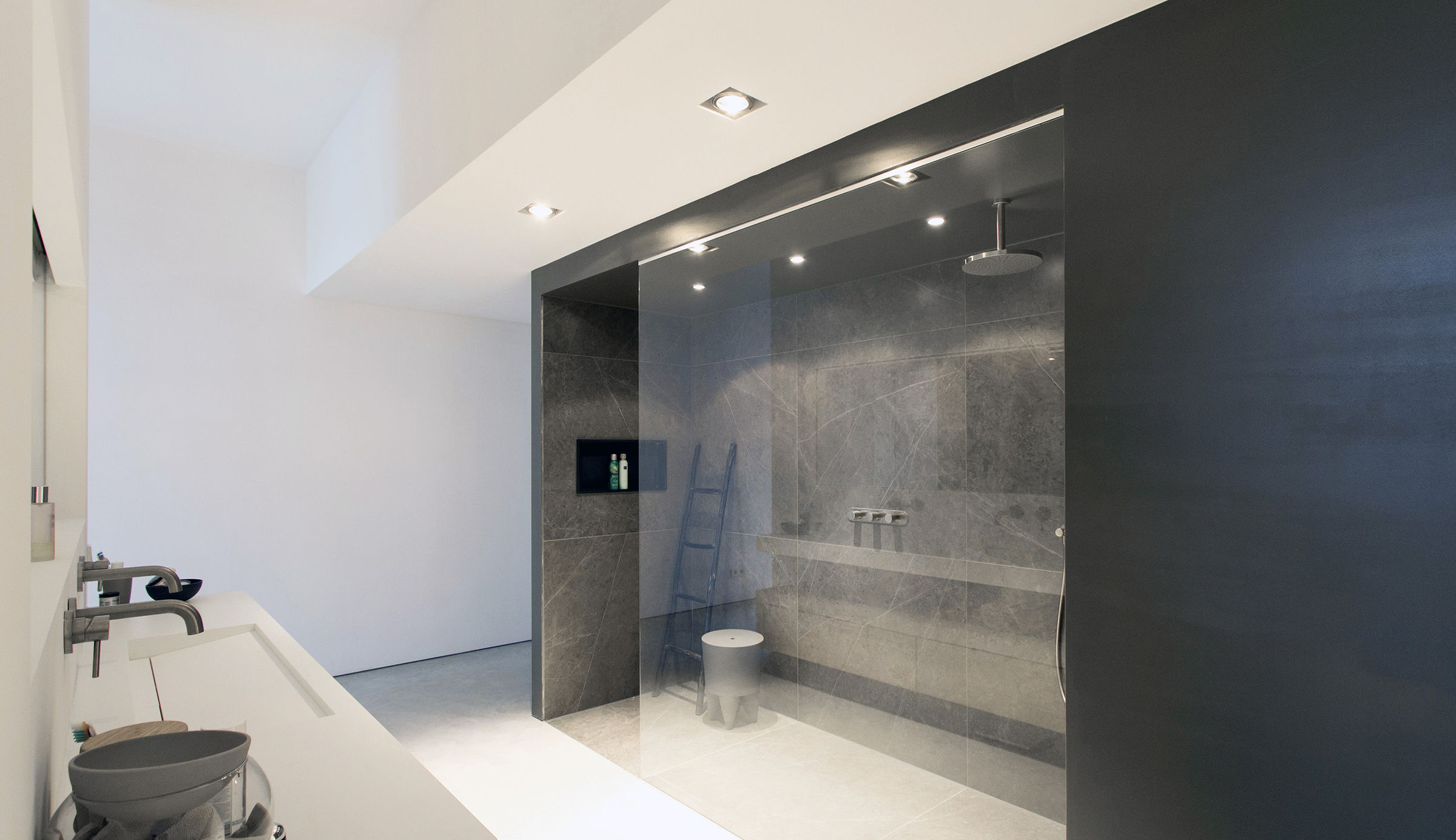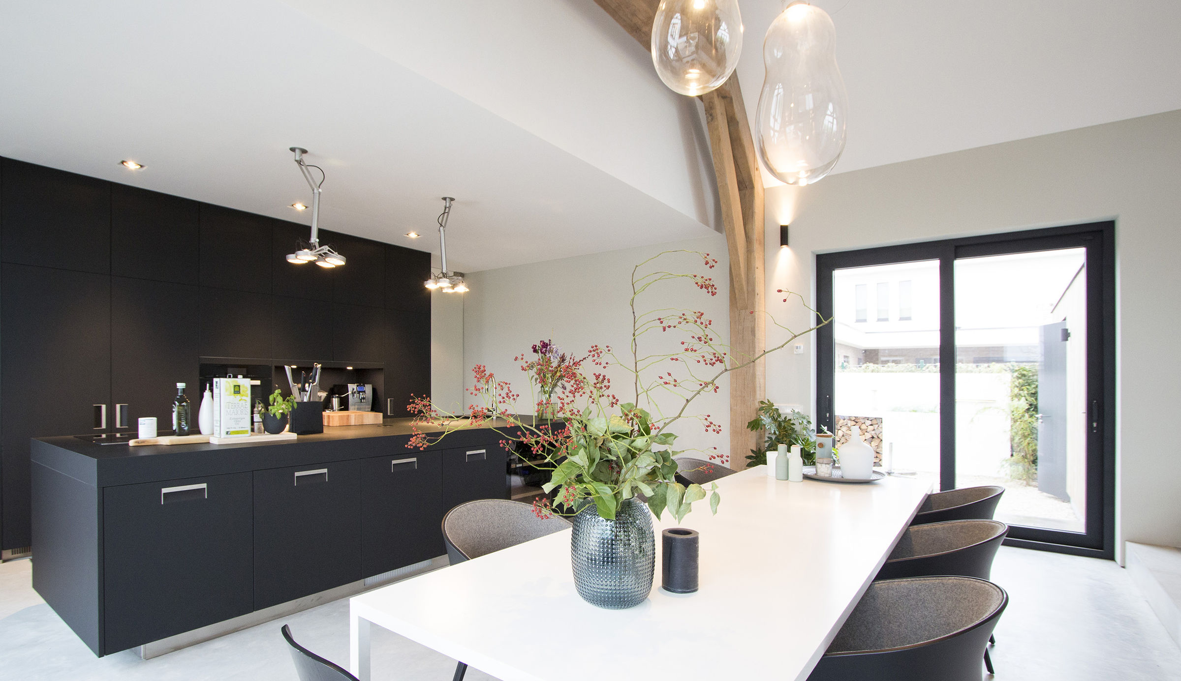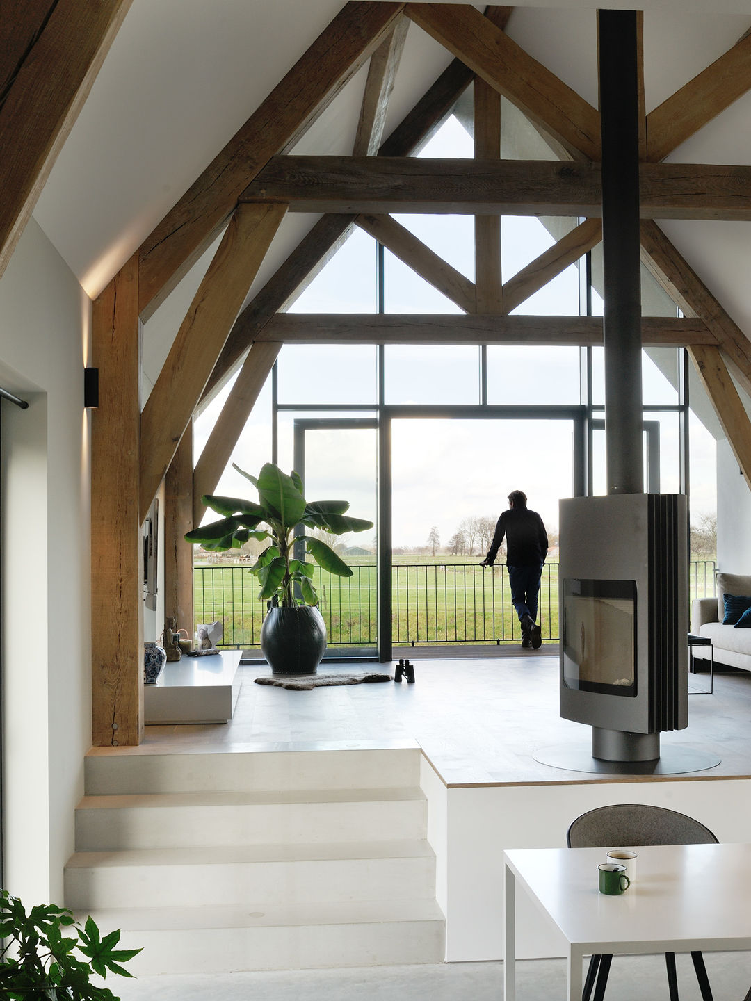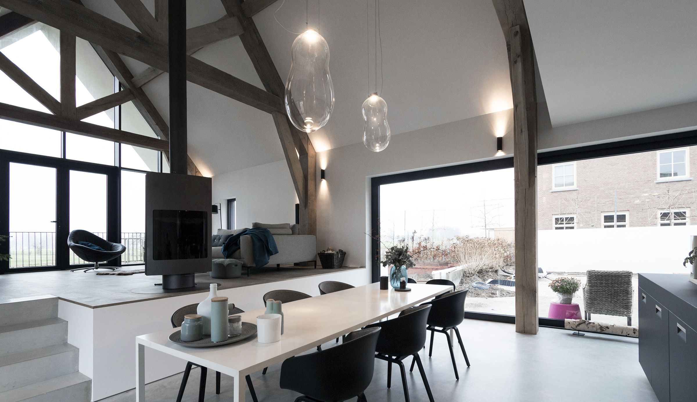 Projekt nabrał szczególnego kształtu dzięki ścisłej współpracy z właścicielką, wykształconą projektantką wnętrz. Z licznych rozmów zrodziła się koncepcja kontrastu: surowa i klarowna bryła kryje bogate, wielowarstwowe wnętrza. Wejście do Longhouse można porównać do doświadczenia rodem z „Alicji w Krainie Czarów” – nagle otwierają się widoki na krajobraz, a skośny dach wznosi się wysoko ponad głową, podparty dębową konstrukcją. Ciepło drewna zestawione jest tu z betonową posadzką oraz czarnymi, stalowymi elementami – jak rzeźbiarskie schody czy nowoczesna kuchnia. Całość uzupełniają miękkie dodatki, rośliny i dekoracyjne oświetlenie, które równoważą industrialny charakter przestrzeni.