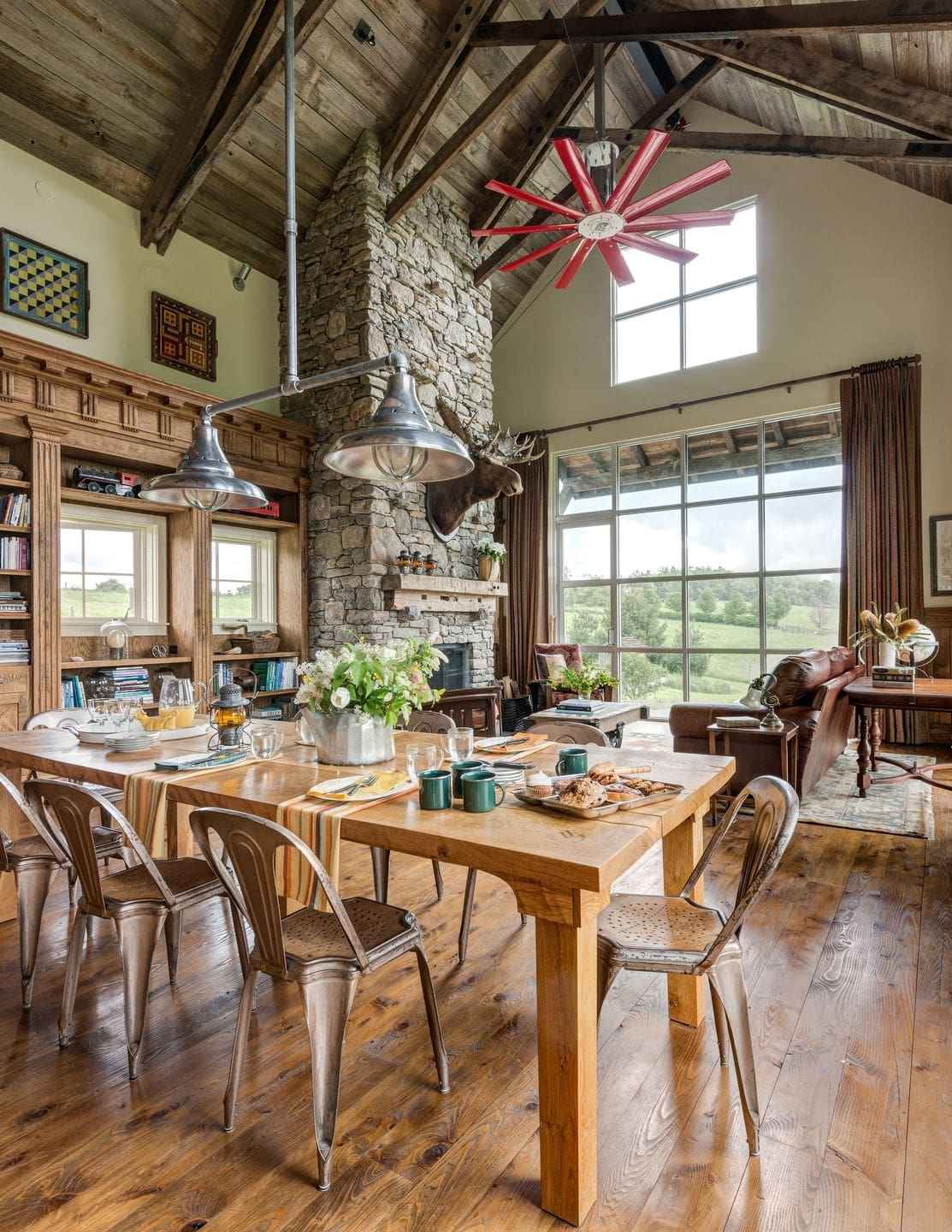 Architekci z JLF słyną z projektów inspirowanych architekturą wiejską, co doskonale widać i tutaj – dom zbudowano z poszanowaniem lokalnej tradycji, krajobrazu i historii miejsca. Kluczowym założeniem było wykorzystanie materiałów z odzysku, które nadają przestrzeni autentyczności. Wnętrze zdobi drewno ze starej stodoły Amiszów, a także elementy wykonane z 300-letniego dębu rosnącego niegdyś na tej samej farmie. Te materiały zostały wkomponowane w nowoczesny układ funkcjonalny, w którym światło, przestrzeń i naturalne tekstury odgrywają główną rolę.