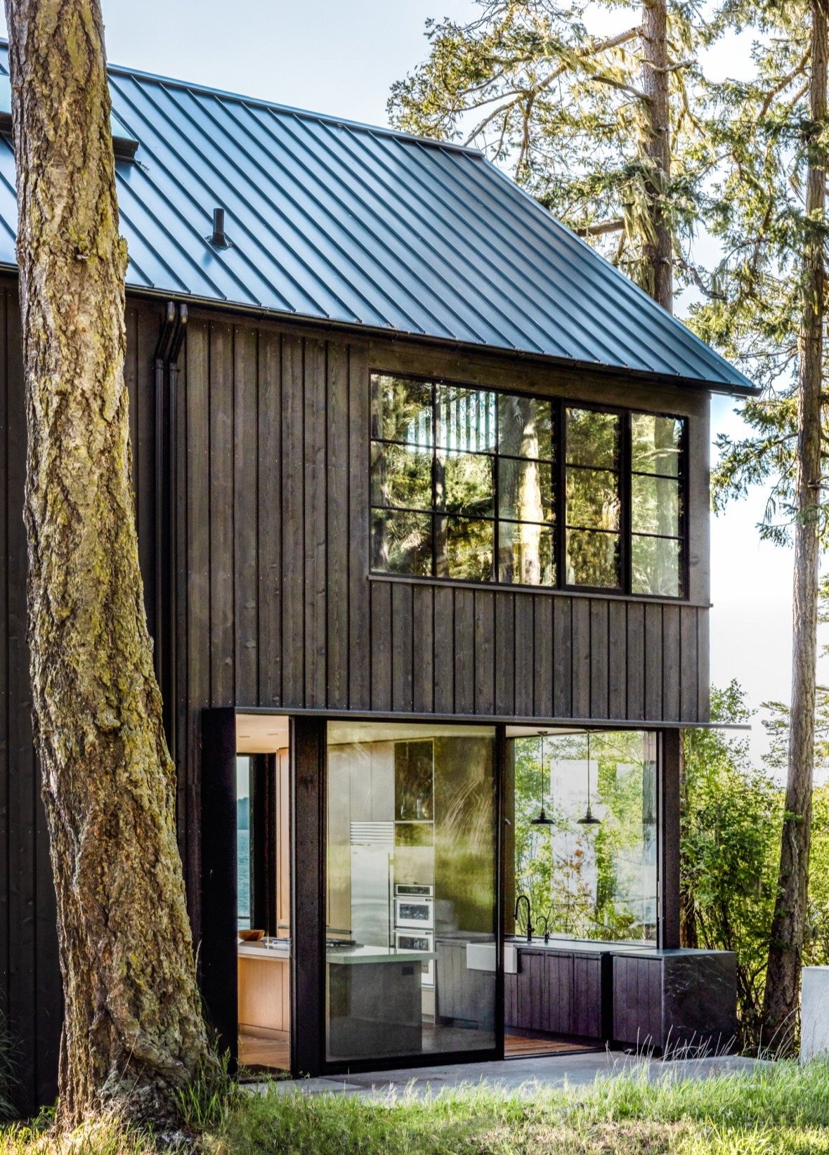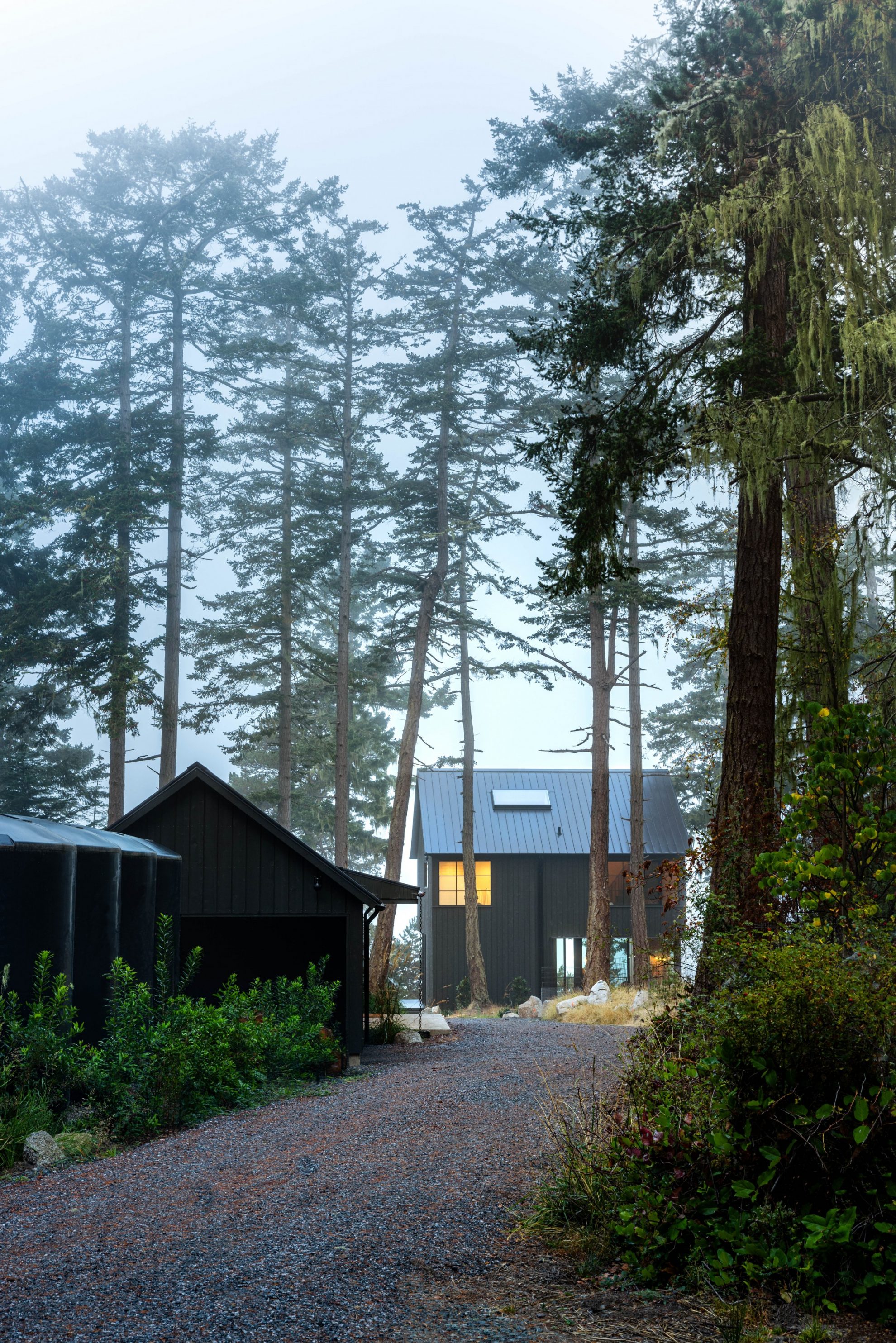 Duży świetlik nad klatką schodową pełni funkcję studni świetlnej, zapewniając naturalne oświetlenie dla niższych pięter. Dzięki czarnej elewacji, dom staje się dyskretnym elementem krajobrazu, niemal niewidocznym z publicznej linii brzegowej. To oaza prywatności i spokoju, której minimalistyczny charakter podkreśla zrównoważoną i współczesną interpretację tradycyjnej architektury wyspiarskiej, przypominającej nowoczesną stodołę.