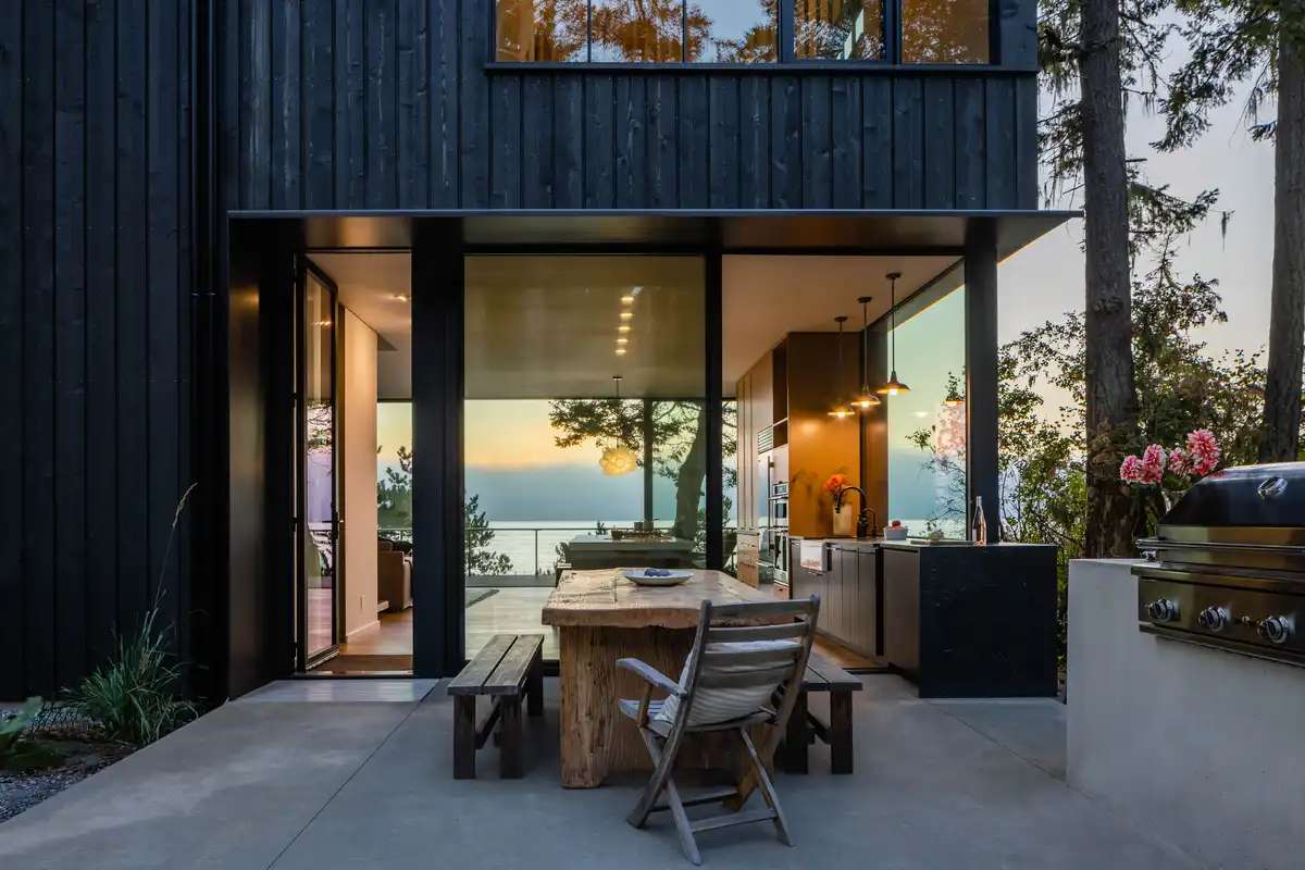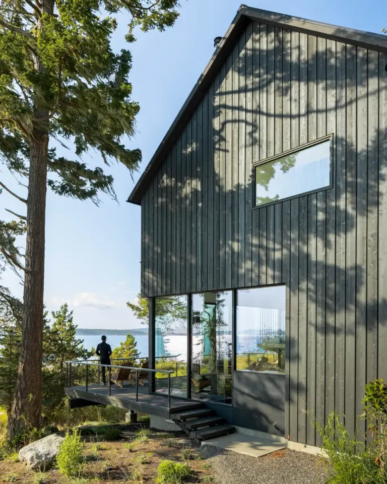 Cały dom został wykończony na czarno. Ten wybór miał bardzo konkretny cel – budynek miał pozostać jak najmniej widoczny z publicznej linii brzegowej. Ciemna elewacja pozwala bryle niemal zniknąć na tle otoczenia i nie konkurować z naturalnym krajobrazem wyspy.