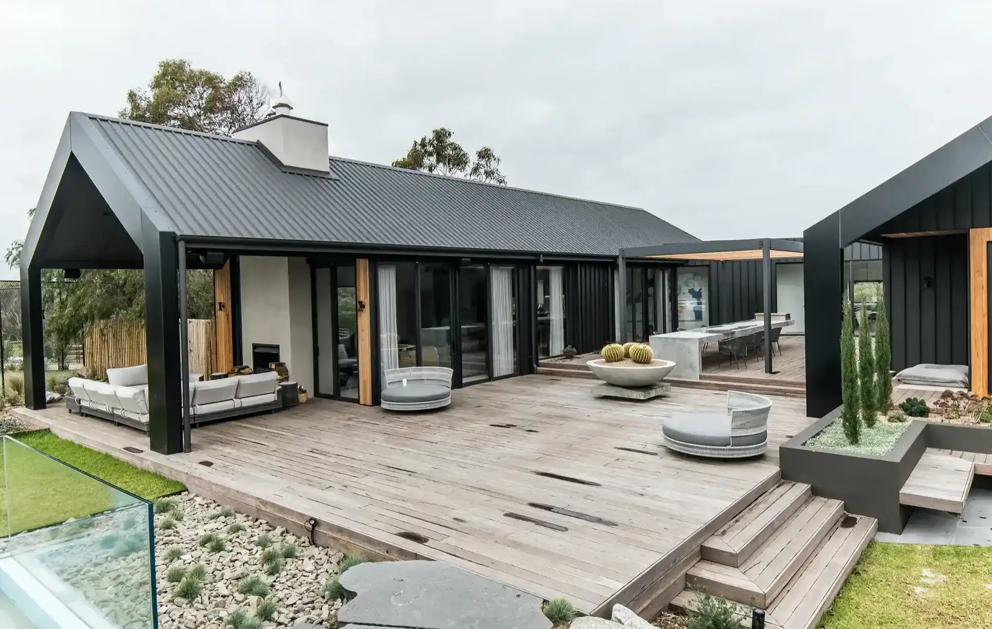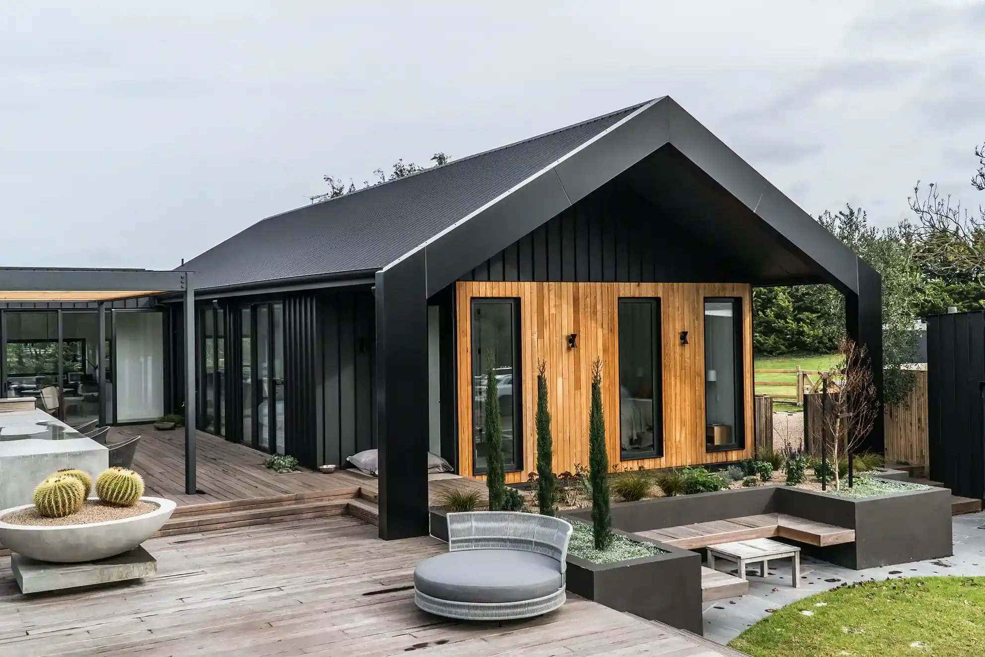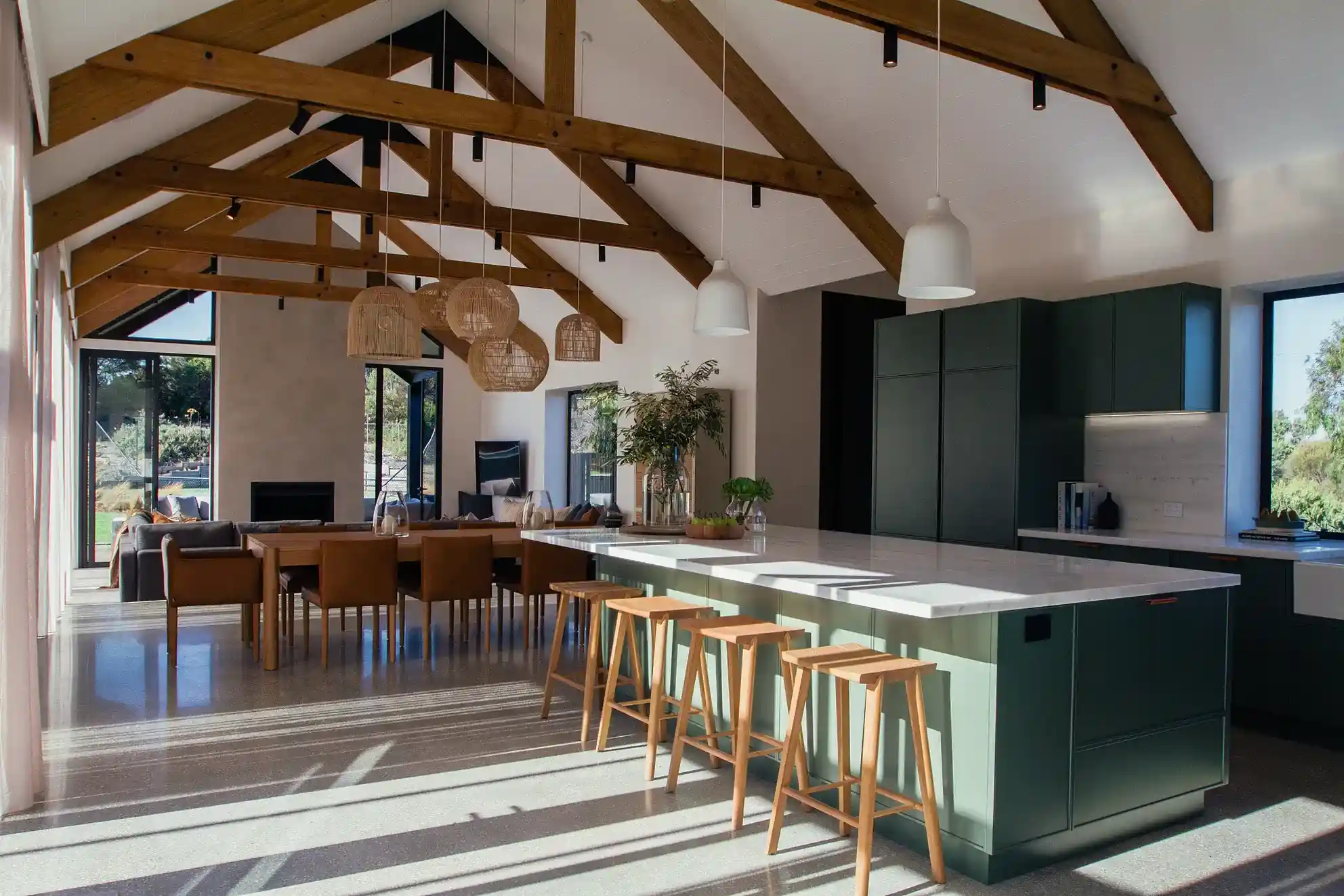 Projekt był ogromnym wyzwaniem – wymagał poszanowania wrażliwego środowiska i odporności na surowe nadmorskie warunki pogodowe. Efektem jest przestrzeń, w której nowoczesna stodoła zyskała niepowtarzalny charakter dzięki połączeniu betonu, drewna i stali Colourbond. Z zewnątrz budynek zachwyca prostotą i solidnością, a wewnątrz zachowuje przytulność dzięki naturalnym materiałom, polerowanym posadzkom betonowym i odsłoniętym drewnianym belkom.