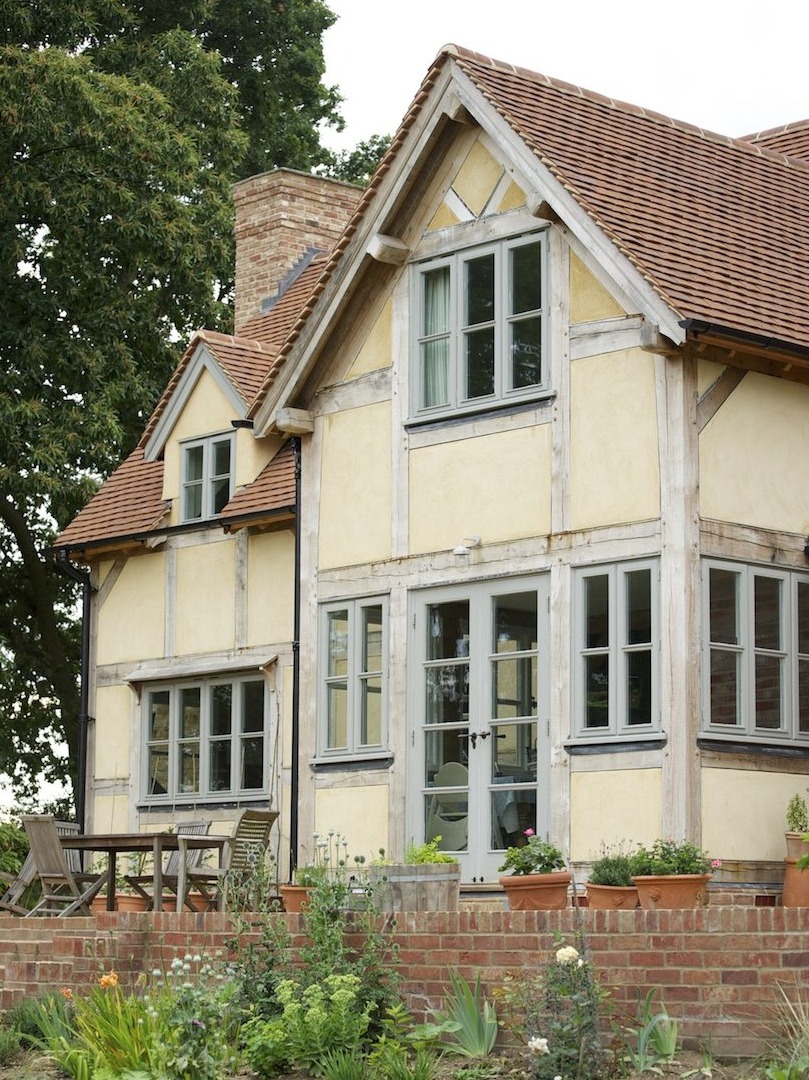 Z zewnątrz, domek wygląda jak z pocztówki – z charakterystyczną, całkowicie odsłoniętą dębową ramą i wykończeniem z otynkowanych paneli. Wyjątkową cechą są również lukarny i duży, ceglany komin, który nadaje budynkowi rustykalnego uroku. Układ domu ma kształt litery „L”, z tylnym szczytem sięgającym w stronę obszernej działki, z widokiem na ogród warzywny oraz przyczepę kempingową.