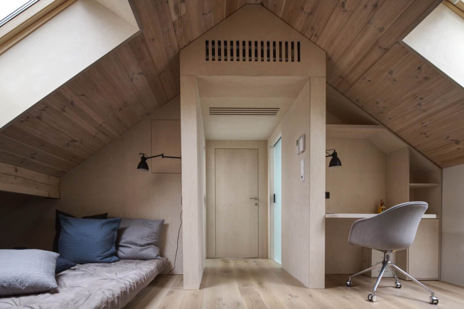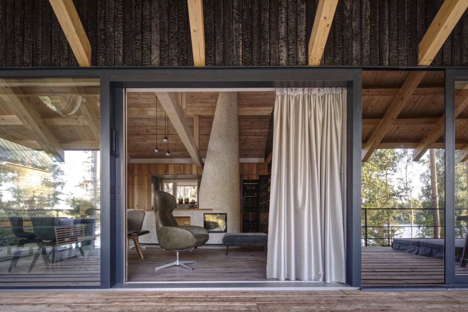 Architekci potraktowali chatę jak całościowe dzieło sztuki. Każdy element – od monumentalnych, niemal rzeźbiarskich pieców, przez lekką, spiralną klatkę schodową, aż po odsłoniętą więźbę dachową w salonie – został zaprojektowany z myślą zarówno o funkcji, jak i formie. Charakter wnętrza podkreślają detale: okrągłe okno pod stropem z widokiem na korony drzew czy subtelna gra światła odbijającego się w szklanych powierzchniach.