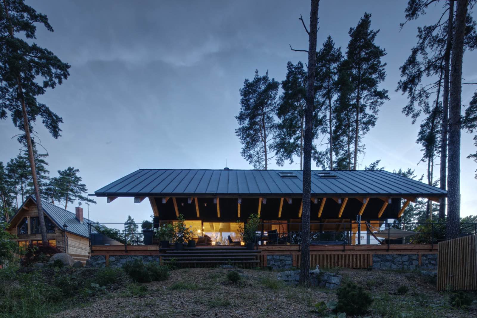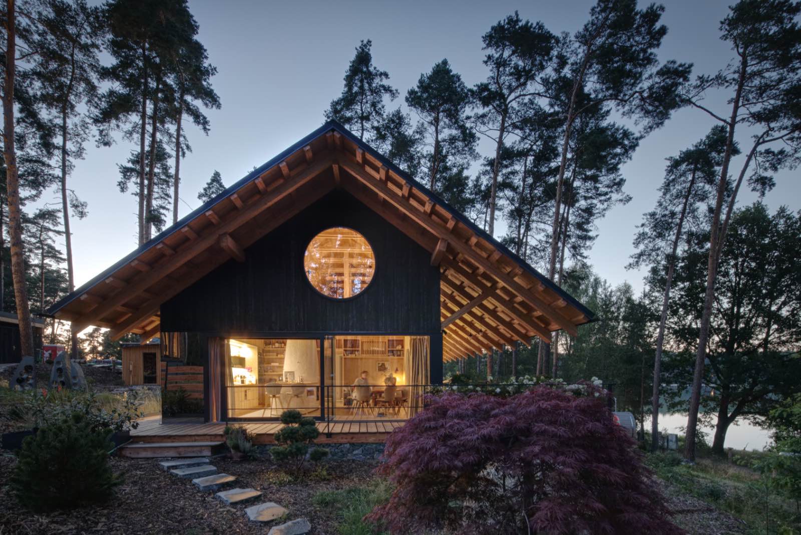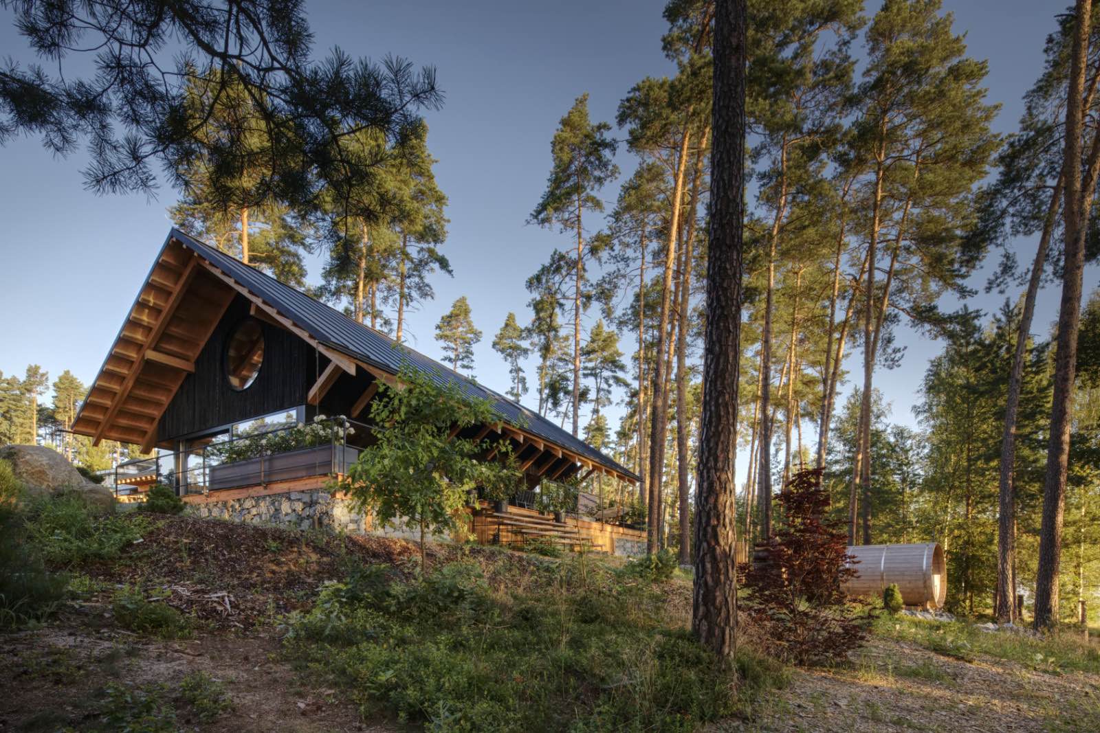 Forma budynku przywodzi na myśl skandynawską nowoczesność – prostą, oszczędną i skupioną na relacji z krajobrazem – z delikatnym kalifornijskim luzem, wyczuwalnym w otwartości przestrzeni i płynnym przechodzeniu wnętrza w zewnętrzne tarasy. Choć inspiracje są międzynarodowe, chata jest głęboko zakorzeniona w miejscu: w północnych Czechach, nad jeziorem w miejscowości Hamr na Jezeře, z widokiem na taflę wody i sylwetkę Ještěd w oddali.