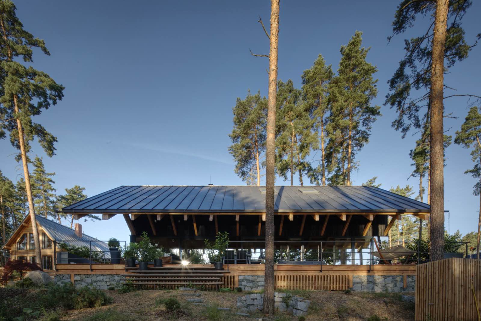 Kluczowym materiałem projektu jest szkło – nie tylko w postaci wielkoformatowych przeszkleń o lekko lustrzanym charakterze, które odbijają las, niebo i wodę. Recyklingowane szklane kruszywo pojawia się również jako zasyp na dachu wiaty garażowej, a także w formie charakterystycznego skloterrazzo zastosowanego na podłodze kuchni, schodach i obudowie kominka. Dzięki temu materiał ten spaja cały projekt – estetycznie i ideowo.