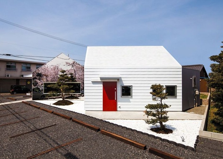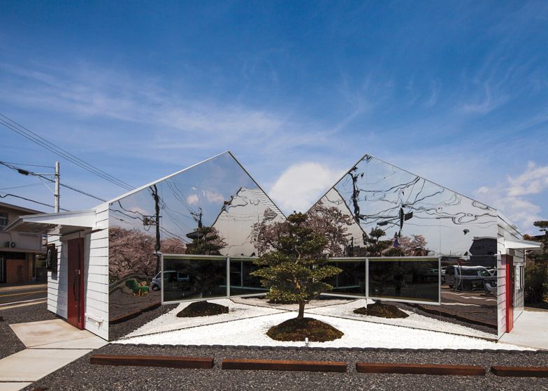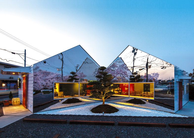 Kwitnące drzewa wiśniowe stały się główną inspiracją projektu kawiarni „Lustra”, zaprojektowanej przez japońską pracownię Bandesign w mieście Gifu. Budynek powstał przy popularnym trakcie spacerowym wzdłuż rzeki i został ukształtowany jako dwie bryły otwierające się na kameralny dziedziniec z niewielkim drzewem kameliowym. Kluczowym elementem projektu są lustrzane elewacje, które odbijają nie tylko drzewo znajdujące się na dziedzińcu, lecz także cały rząd kwitnących wiśni, tworząc wrażenie zanurzenia w różowym, wiosennym krajobrazie. Dzięki temu architektura niemal znika w otoczeniu, a całość działa jak naturalna scenografia zachęcająca przechodniów do wejścia.