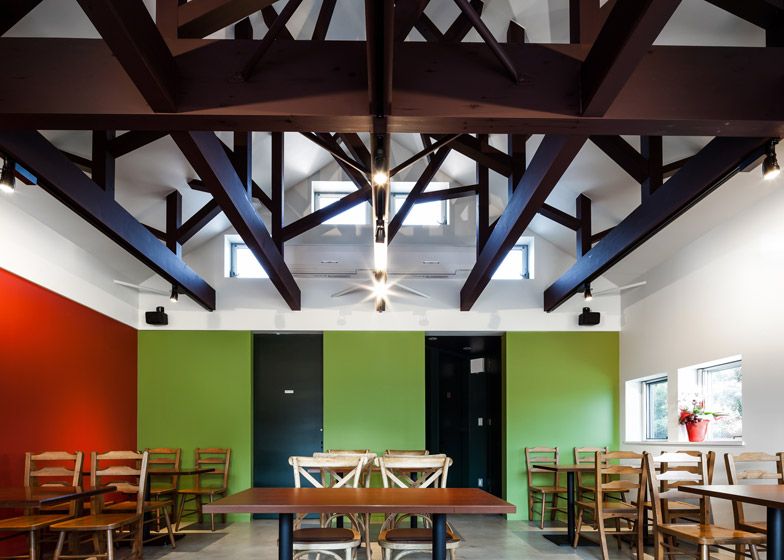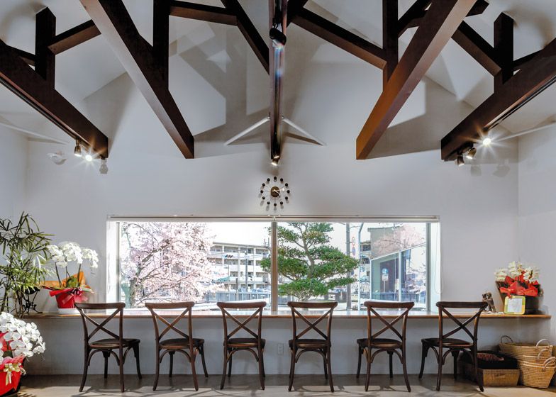 Jednokondygnacyjny budynek wykończono pasami białej stali, które subtelnie nawiązują do tradycyjnych drewnianych elewacji. Kontrastowe, czerwone drzwi oraz kolorowe wnętrza – utrzymane w bieli, zieleni i czerwieni – wzmacniają wrażenie przebywania wśród drzew. Zadaszone miejsca siedzące wykończone ciemnym drewnem oraz pionowe belki sufitowe przywodzą na myśl gałęzie, pod którymi goście mogą odpocząć. Duże okna umożliwiają jednoczesne podziwianie realnego krajobrazu i jego lustrzanego odbicia, a wspólna kuchnia umieszczona w tylnej części łączy obie części kawiarni w spójną, funkcjonalną całość, pokazując, że nawet tak odmienny projekt może dialogować z ideami znanymi z trendów takich jak nowoczesna stodoła, gdzie prostota formy podkreśla siłę otoczenia.