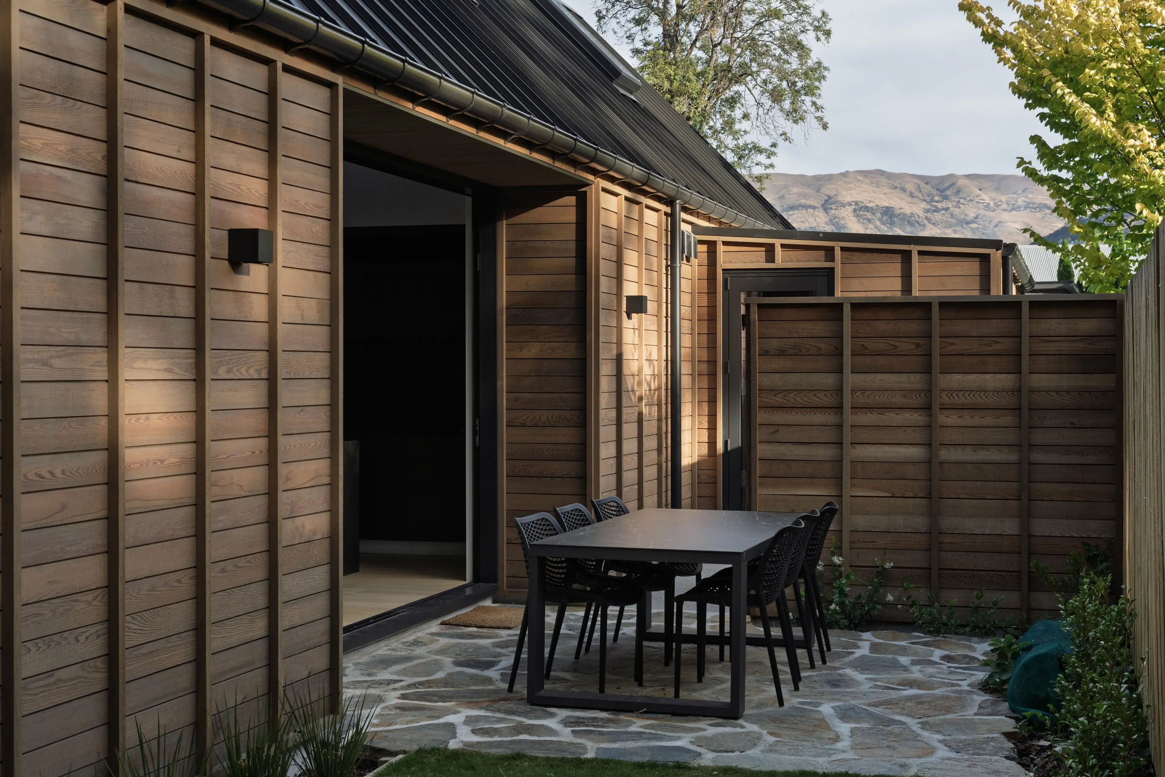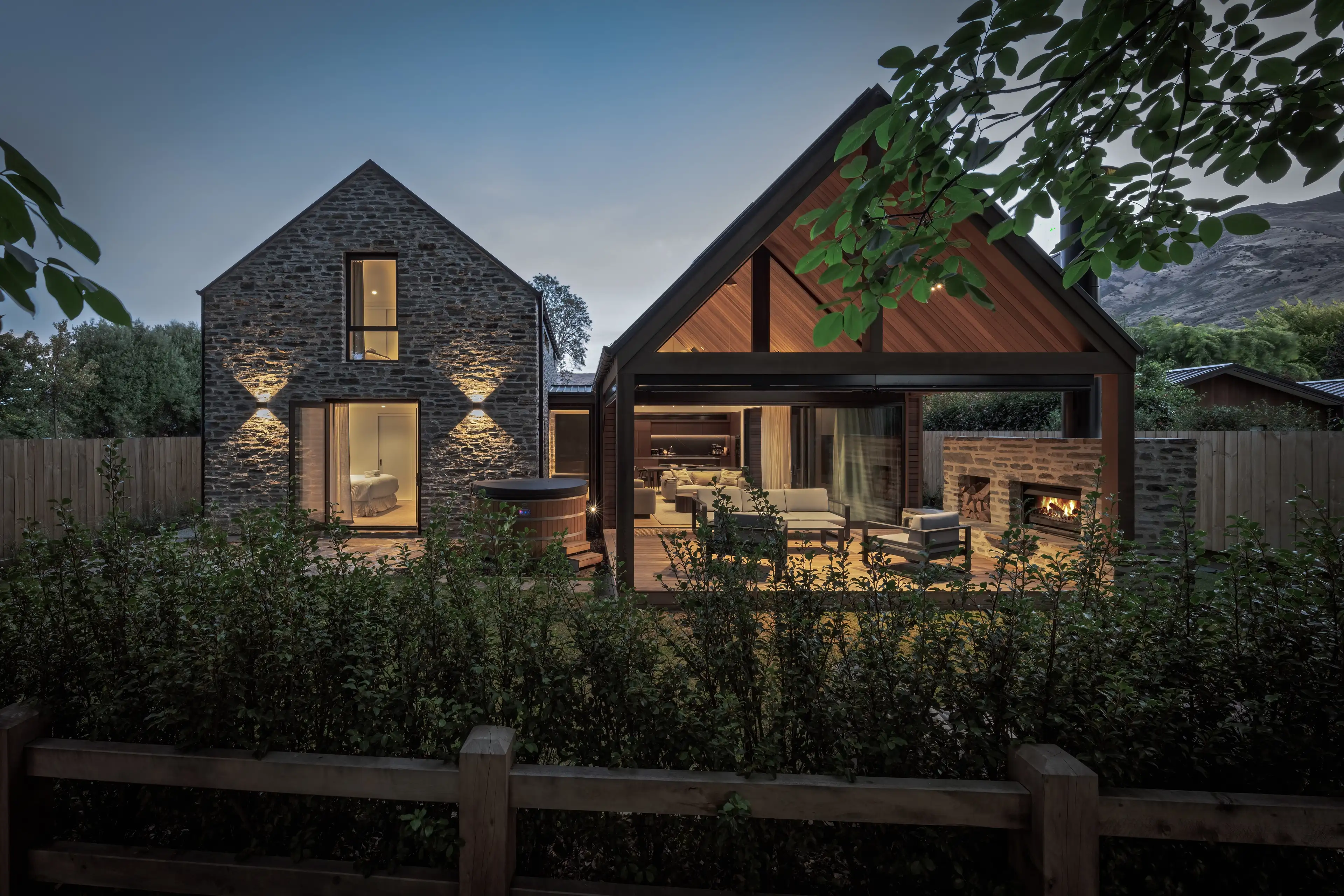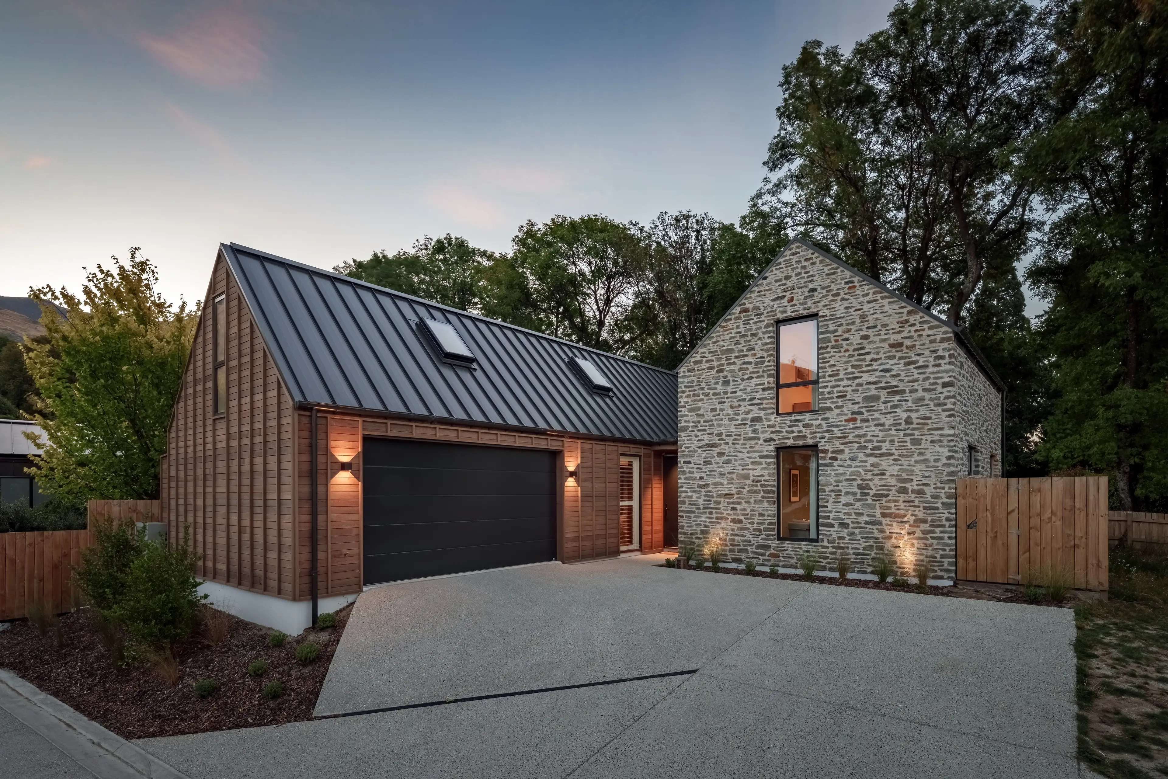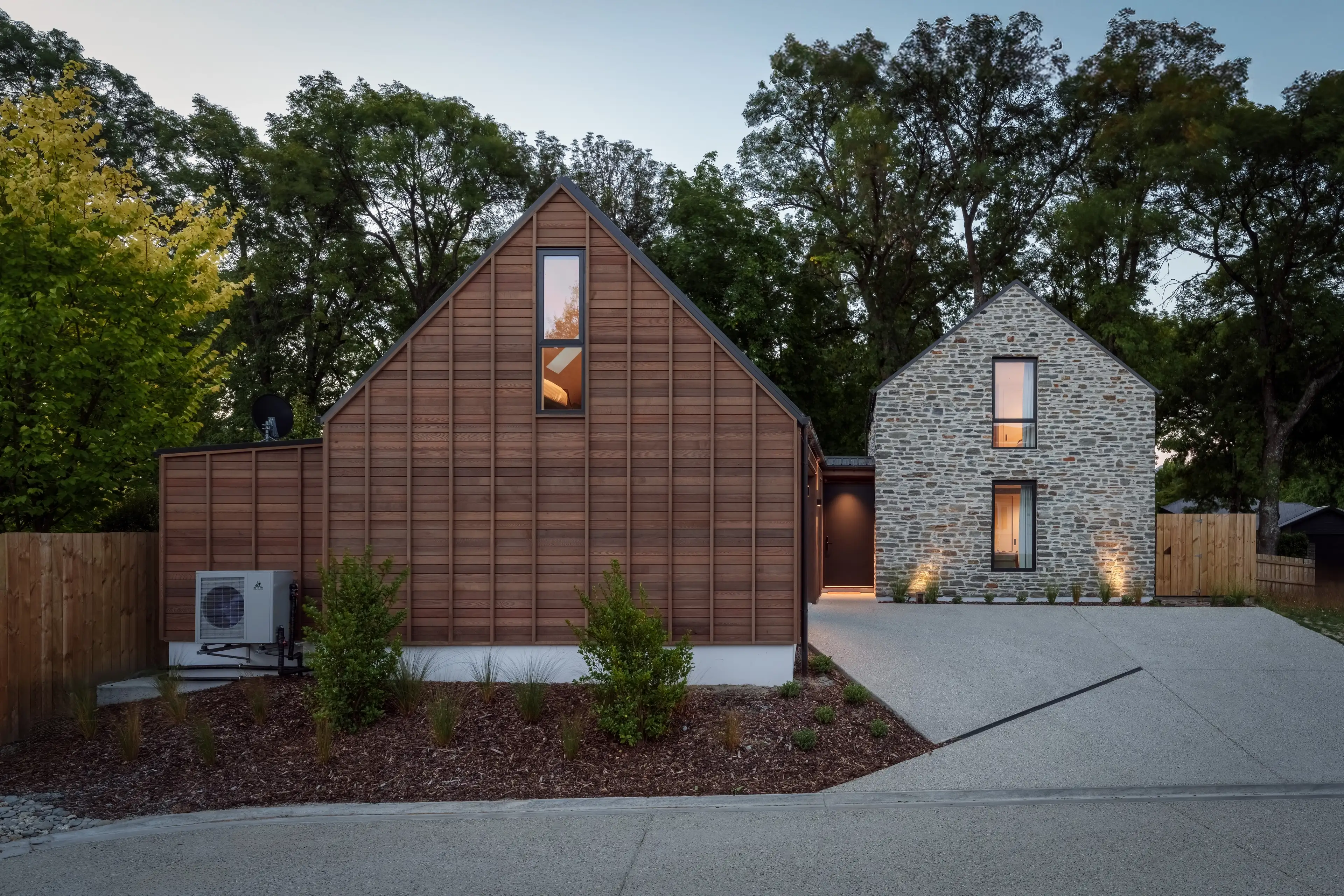 Elewacje domu łączą lokalne materiały: schist otago (skała z regionu Otago) oraz deski elewacyjne typu board & batten z cedru, co podkreśla głęboki związek budynku z miejscem i tradycją materiałową regionu.