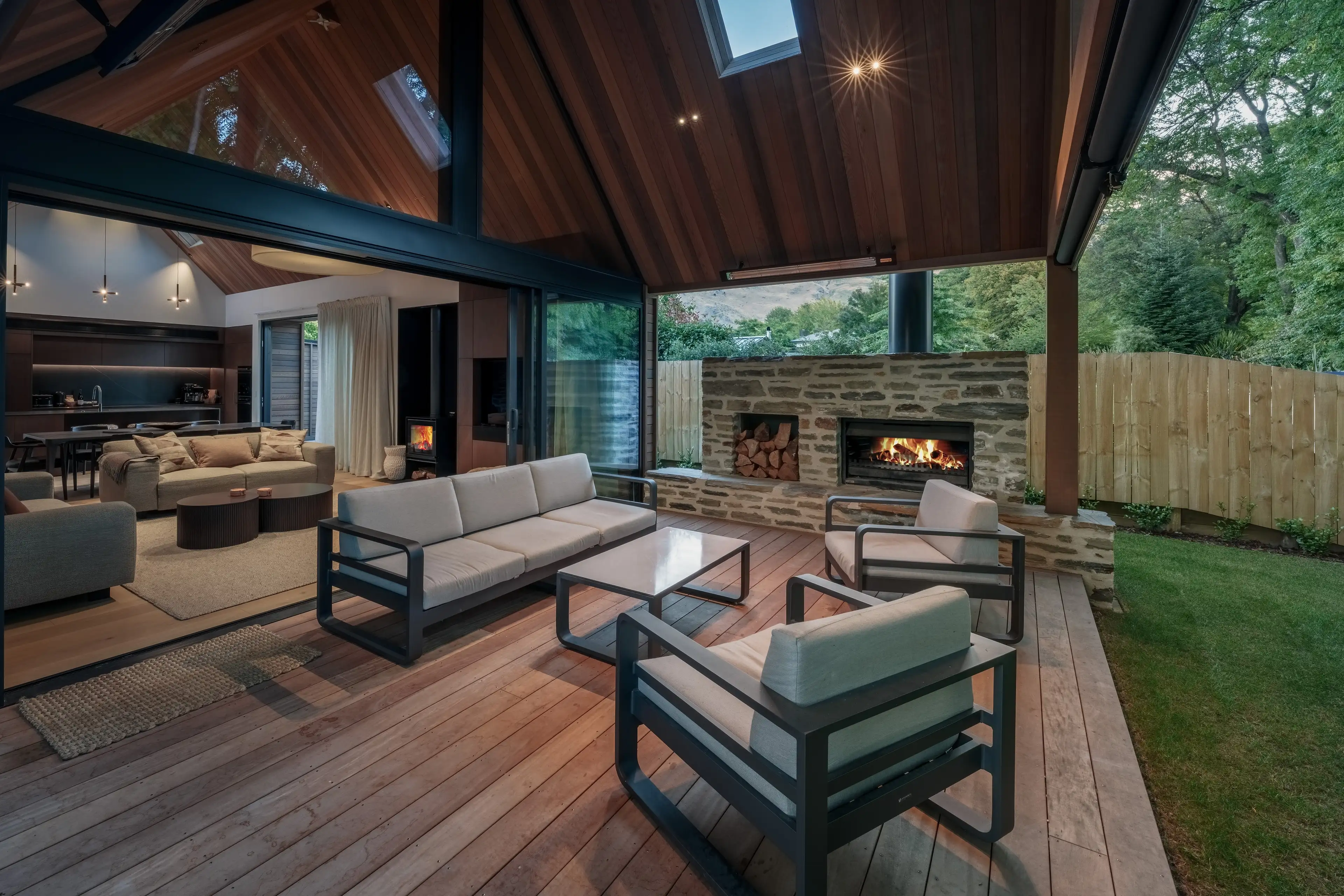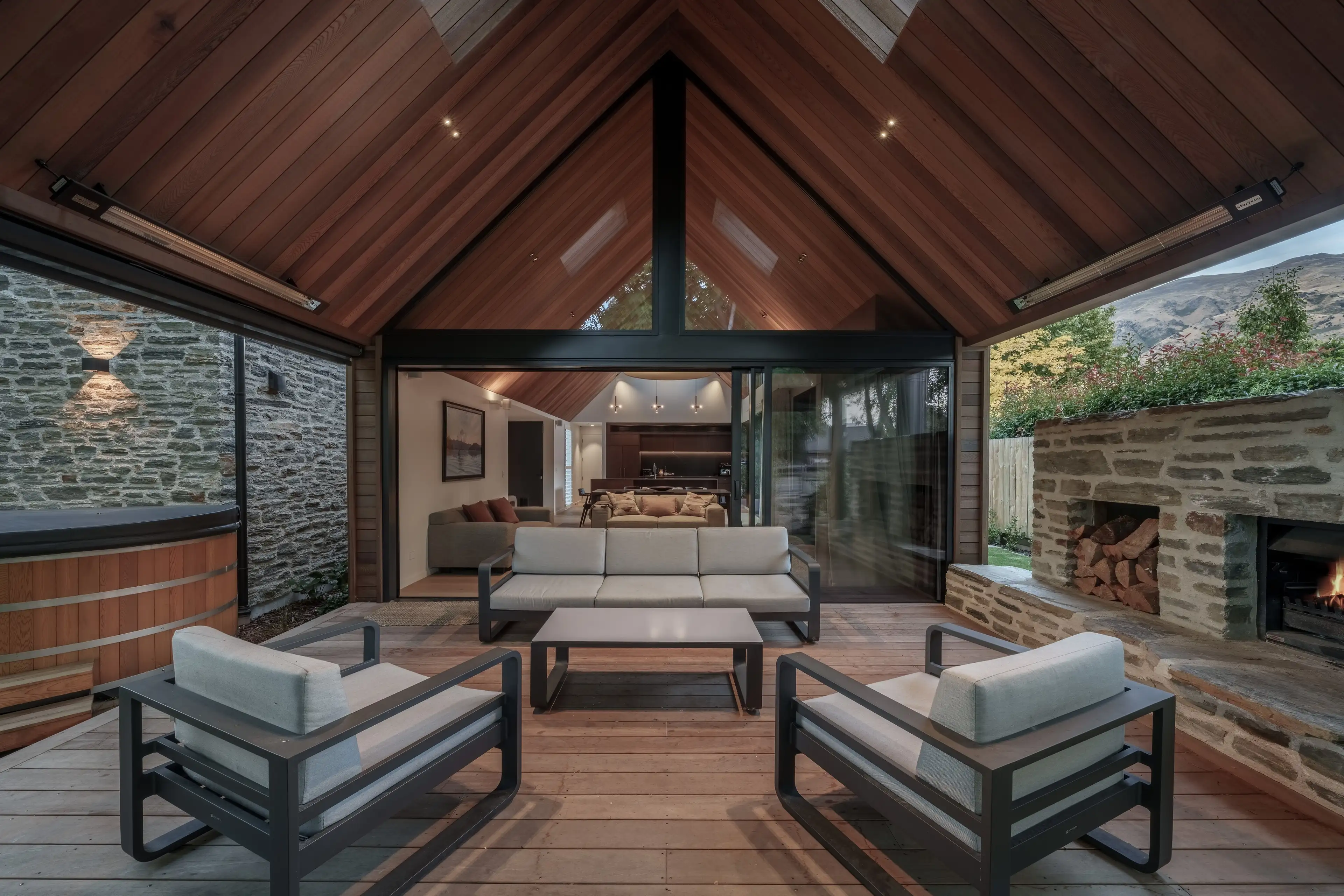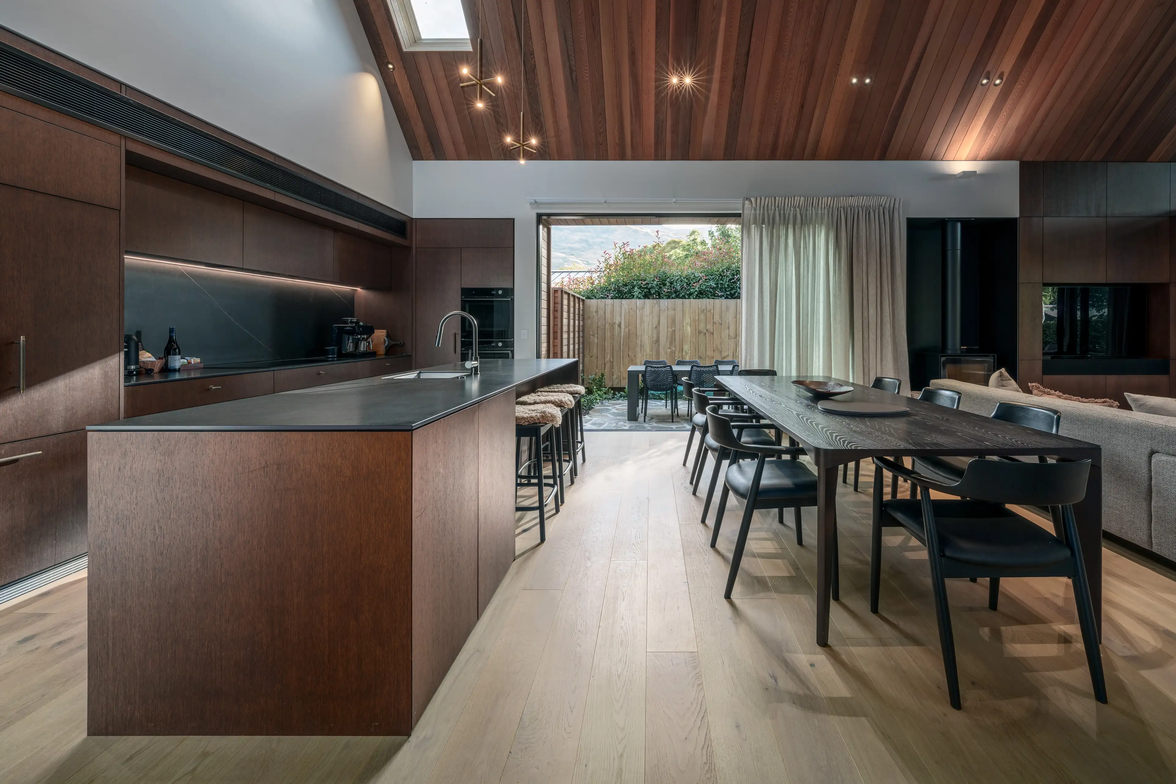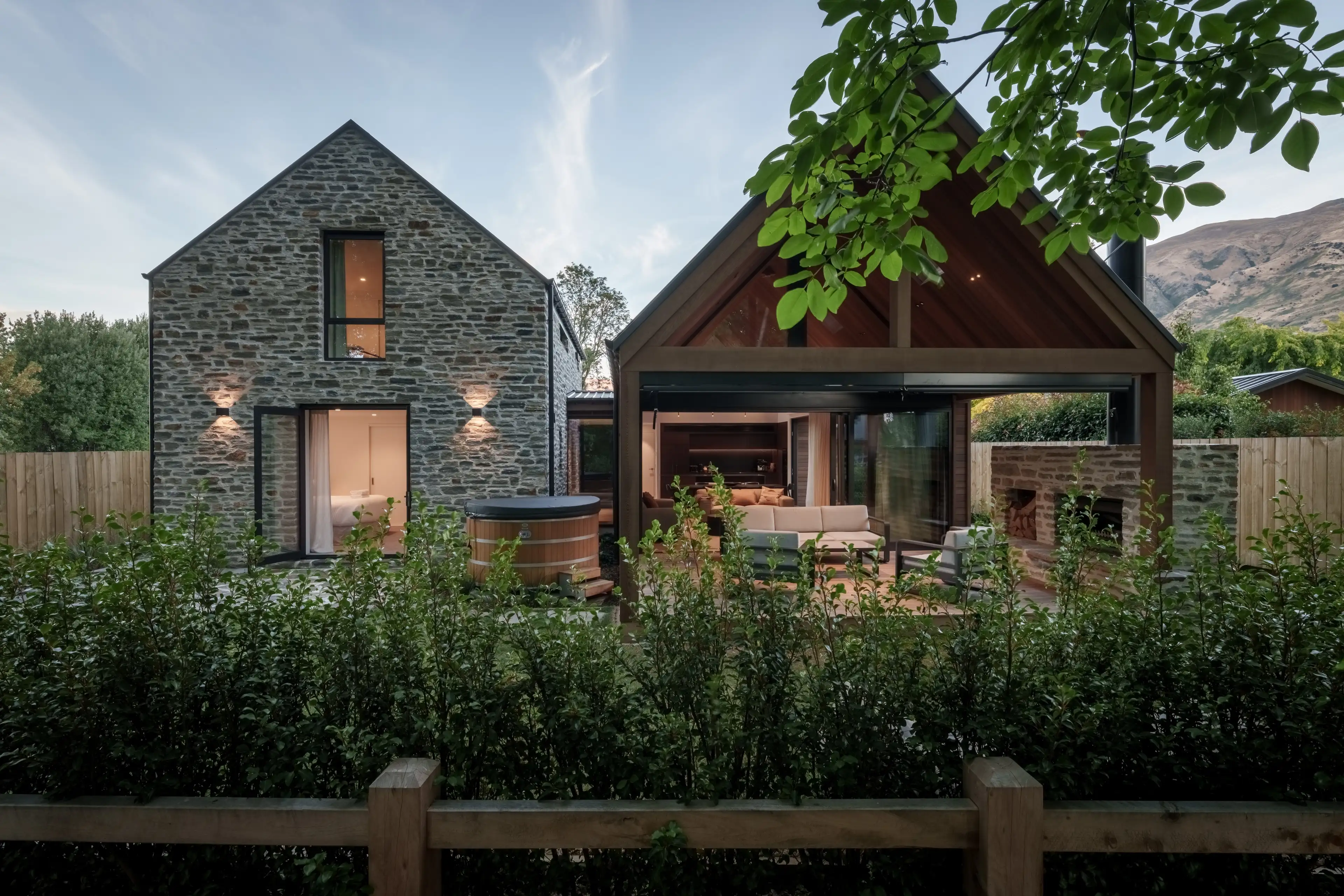 Elewacje domu łączą lokalne materiały: schist otago (skała z regionu Otago) oraz deski elewacyjne typu board & batten z cedru, co podkreśla głęboki związek budynku z miejscem i tradycją materiałową regionu.