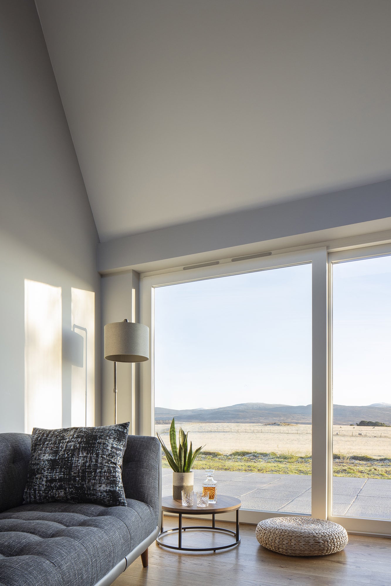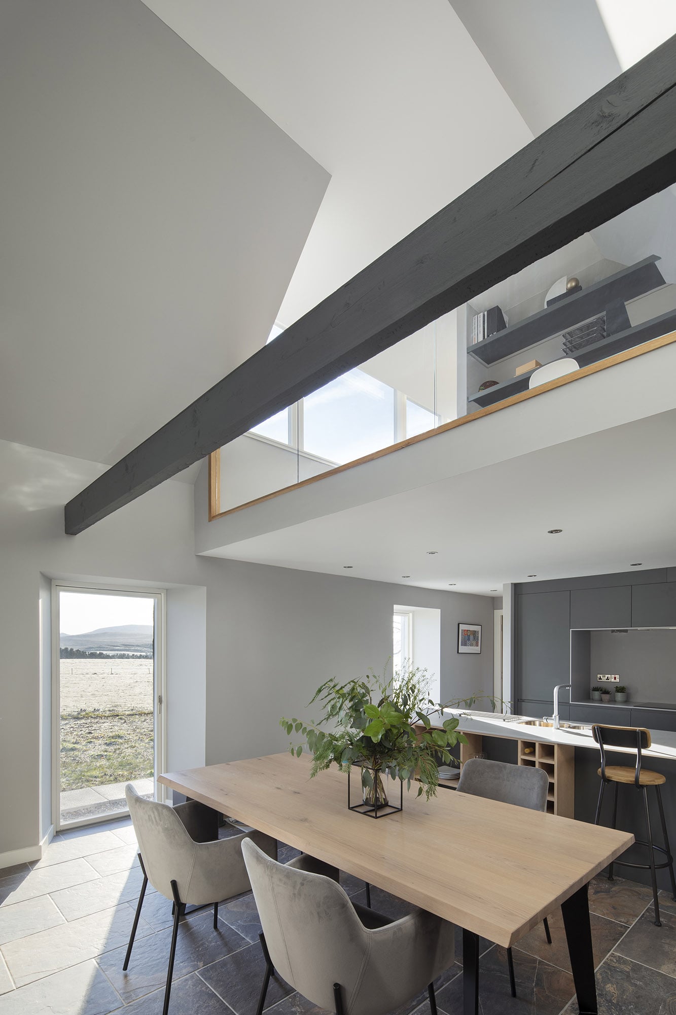 Strone of Glenbanchor to wyjątkowy dom i miejsce, które oddaje ducha szkockiego krajobrazu. Kluczową ideą projektu było maksymalne wykorzystanie widoków — okna i drzwi otwierają dom na góry, a wysokie otwory w grubych ścianach stodoły wpuszczają światło do rozbudowanych wnętrz. Zamknięte wcześniej pomieszczenia ustąpiły miejsca otwartemu planowi z wyspową kuchnią i dużym stołem jadalnym.