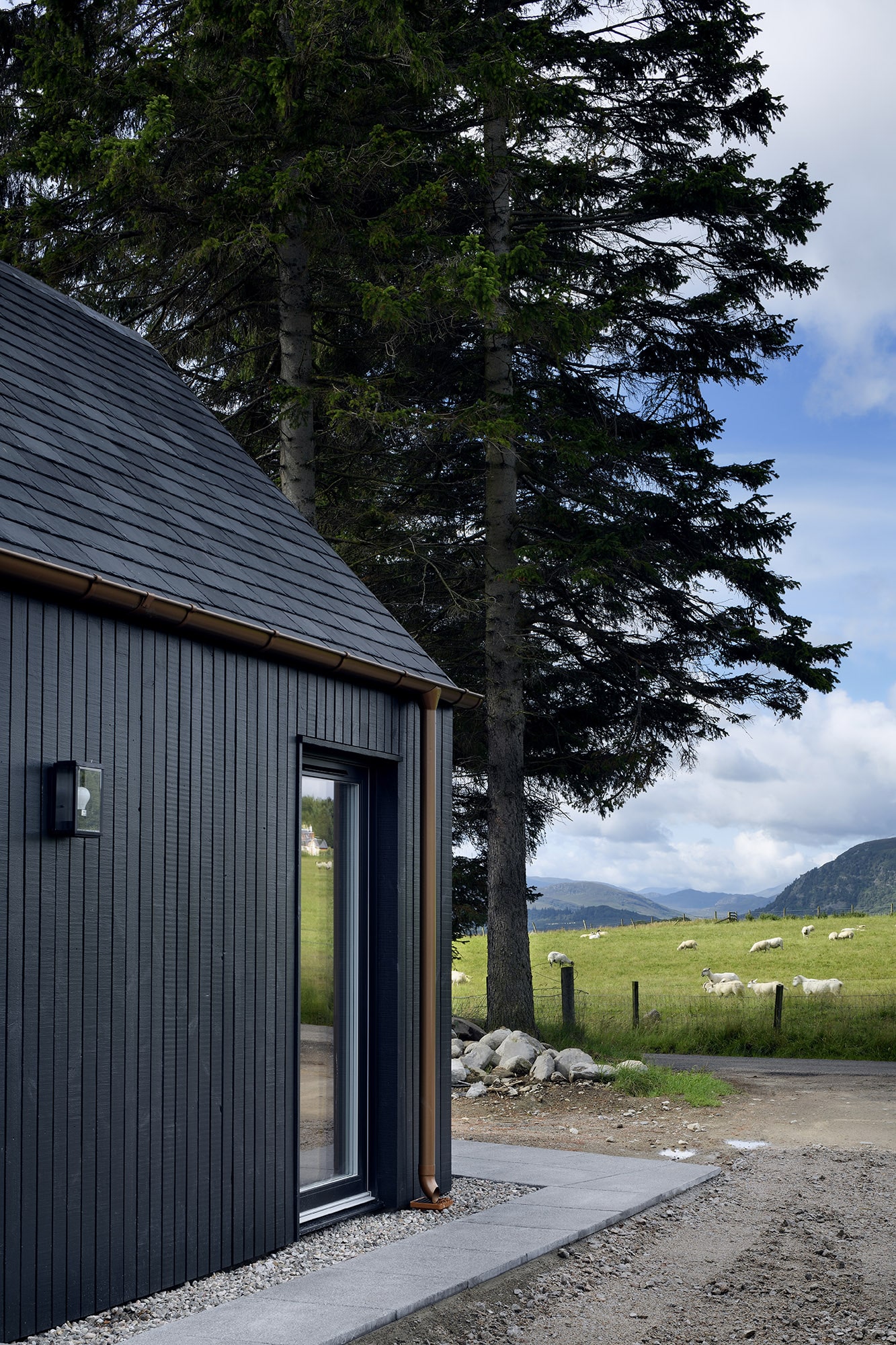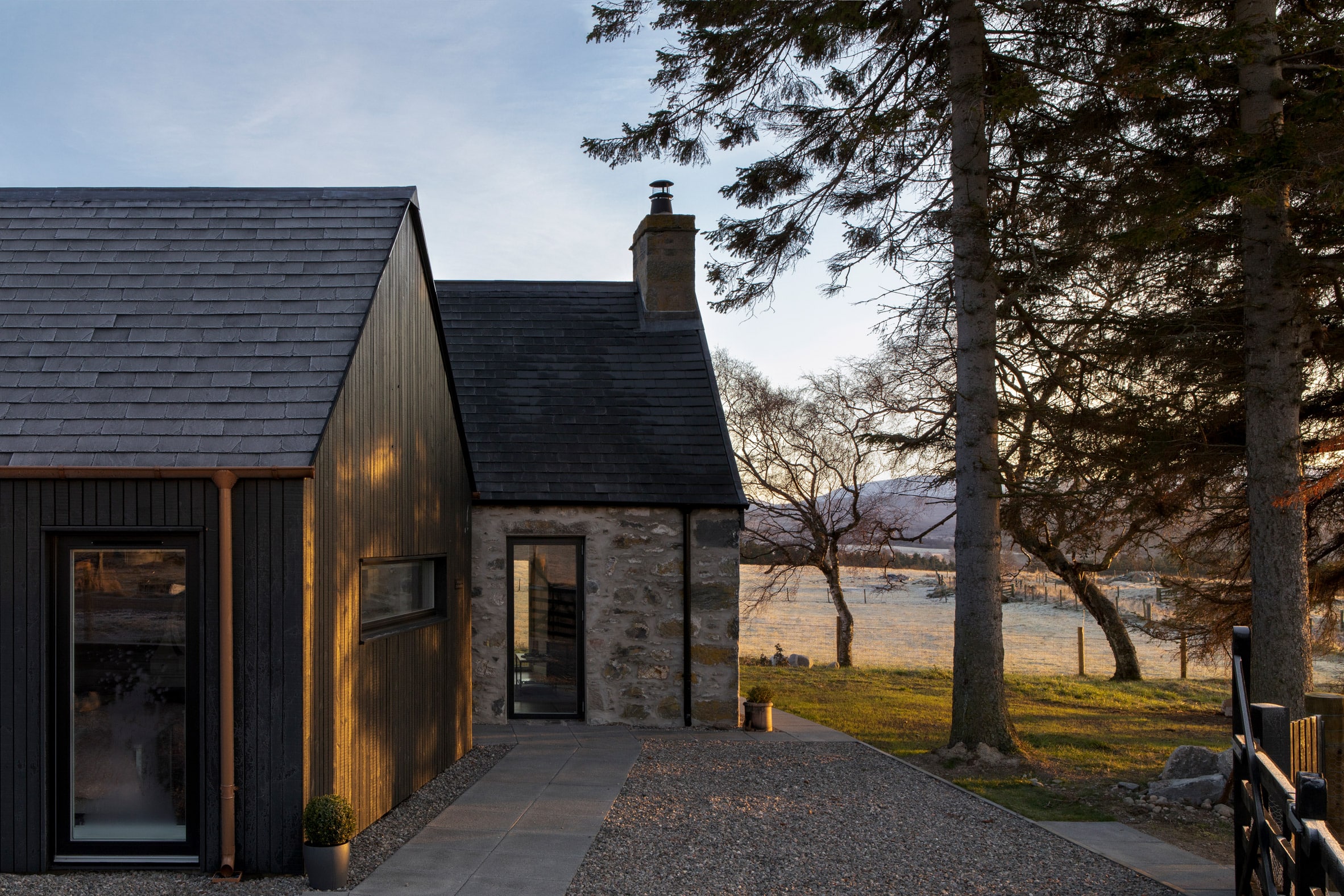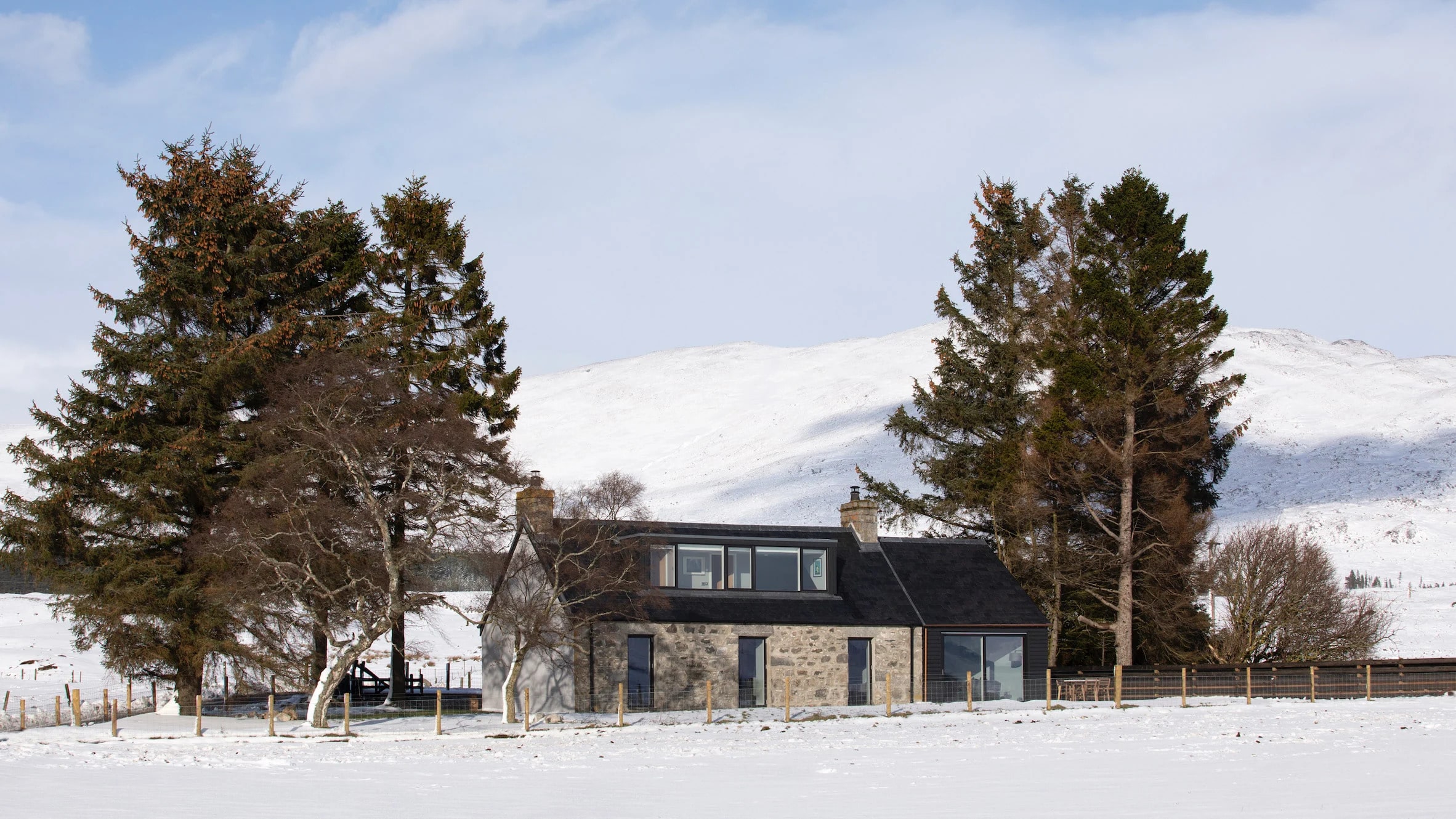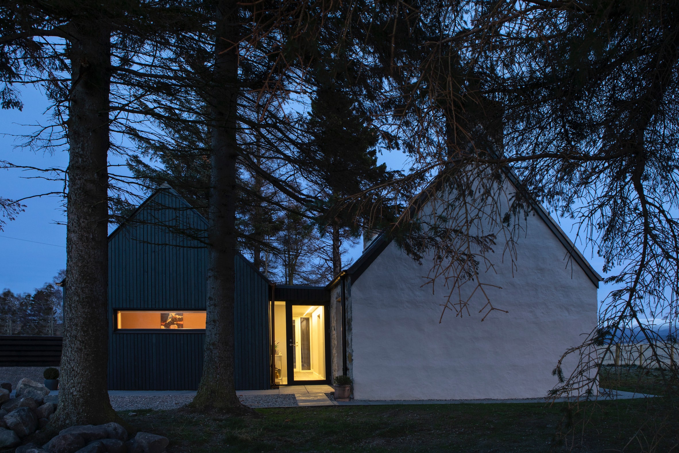 Loader Monteith z Glasgow zaprojektowali nowe formy tak, aby harmonijnie współgrały z krajobrazem i oryginalnym budynkiem. Wszystko odbyło się zgodnie z lokalnymi przepisami planistycznymi, które zabraniają, by nowe interwencje przekraczały powierzchnię pierwotnej zabudowy. Wcześniej chata była ciemna i podzielona na ciasne pomieszczenia — z małą kuchnią pośrodku i dwoma pokojami z pojedynczymi oknami po obu stronach.