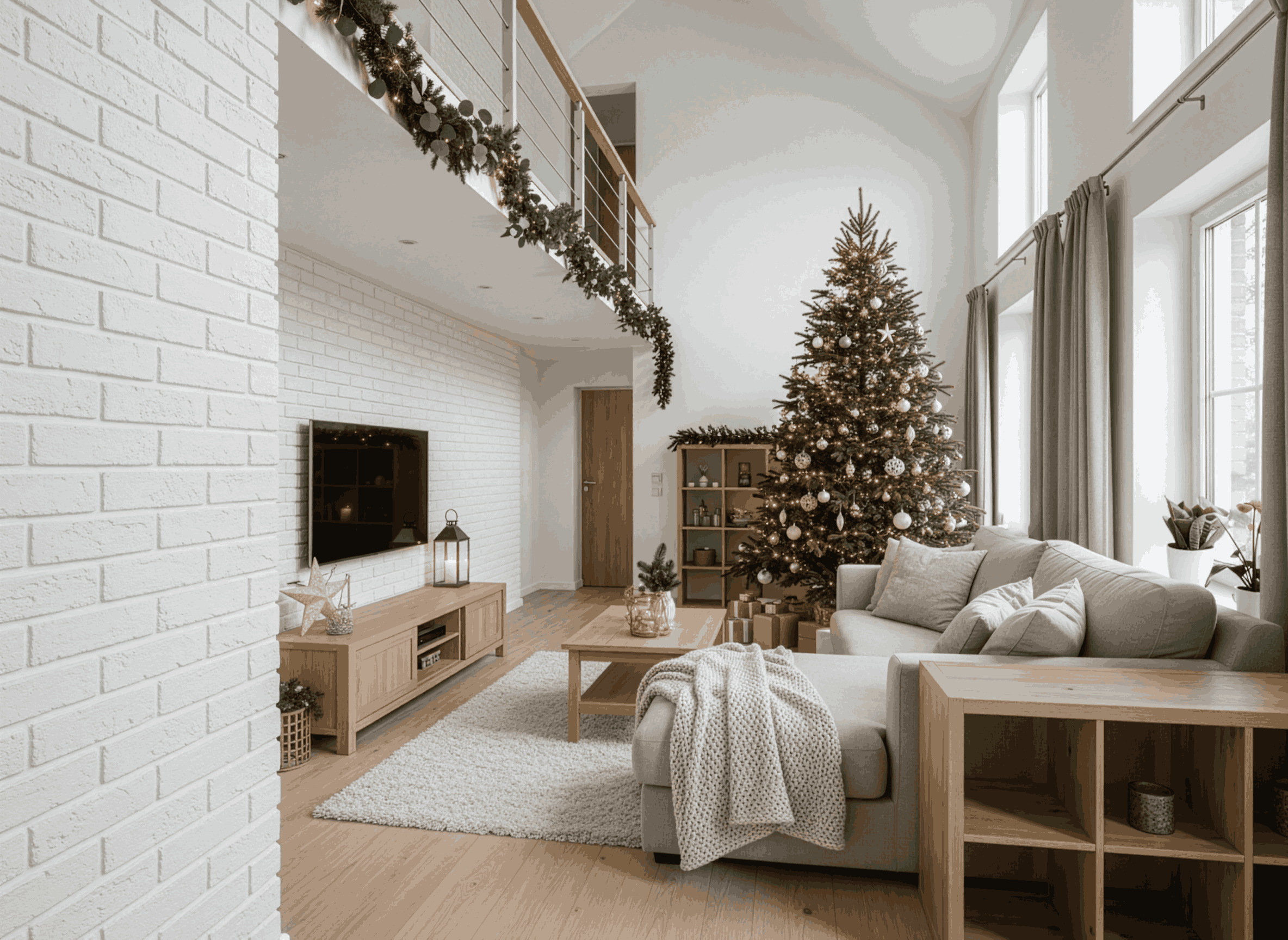 Taki salon emanuje czystością i harmonią. Biała cegła tworzy idealne tło dla naturalnych materiałów i prostych form. To wnętrze dla osób ceniących minimalizm i stylową prostotę, które podczas Świąt chcą stworzyć atmosferę spokoju i przytulności bez zbędnego natłoku dekoracji.