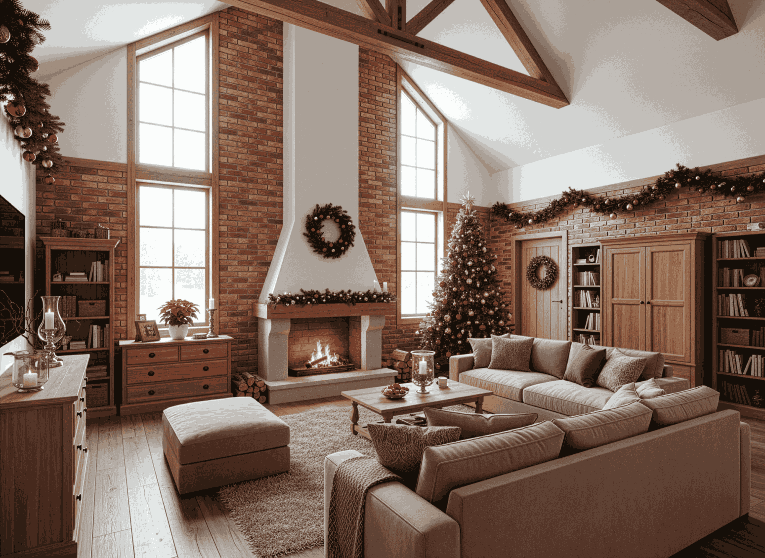 To wnętrze, które pachnie domem, rodziną i tradycją. Czerwona cegła tworzy tło pełne ciepła i przytulności, które sprawia, że każdy gość czuje się mile widziany. W takim salonie naturalnie gromadzi się rodzina, śpiewa się kolędy i dzieli opłatkiem.