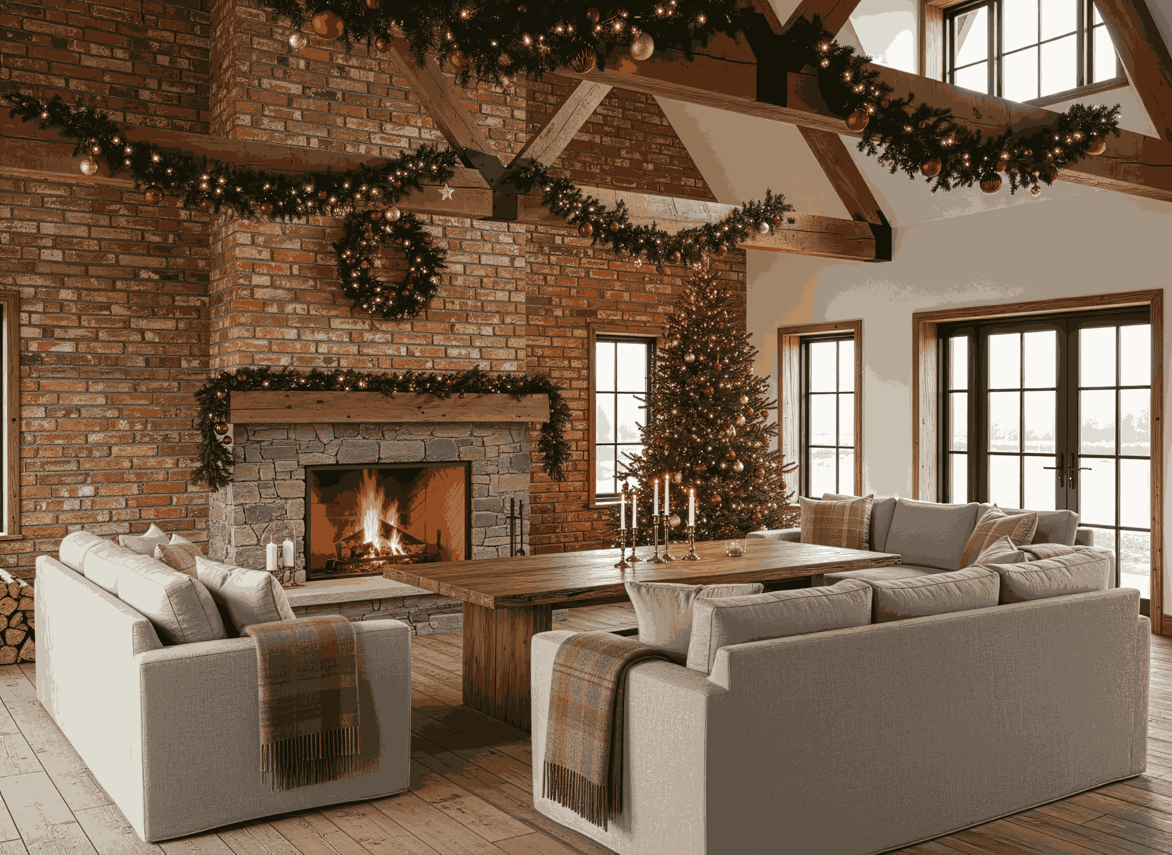 Taki salon najlepiej urządzić w stylu rustykalnym lub tradycyjnym. Drewniane belki pod sufitem, masywny stół z litego drewna, kominek obłożony kamieniem, miękkie koce w kratę – wszystko to idealnie komponuje się z ciepłem cegły. Do tego klasyczne świąteczne ozdoby: girlandy z jodły, czerwone i złote bombki, świece w mosiężnych lichtarzach, łańcuchy lampek o ciepłym, żółtym świetle.