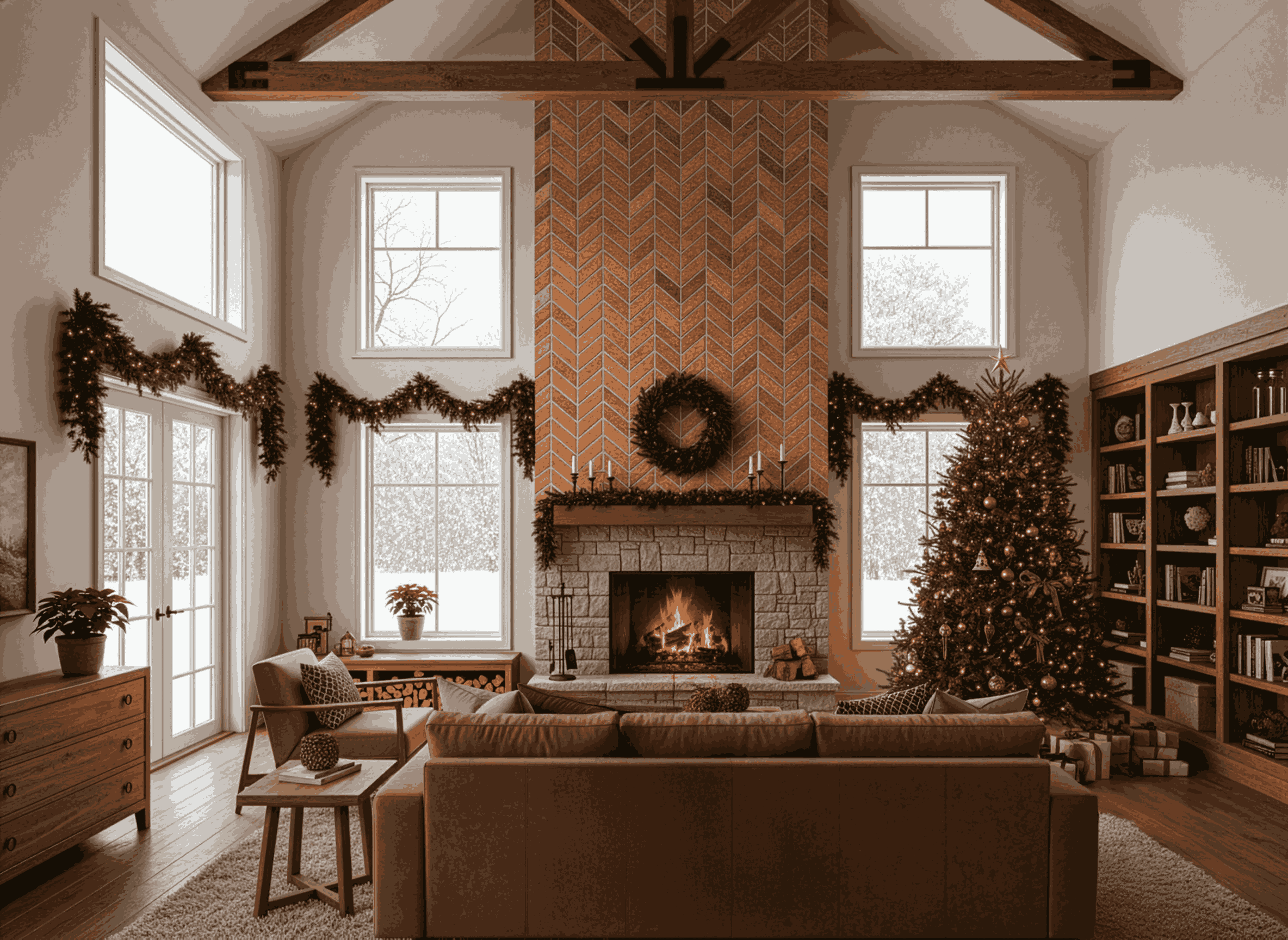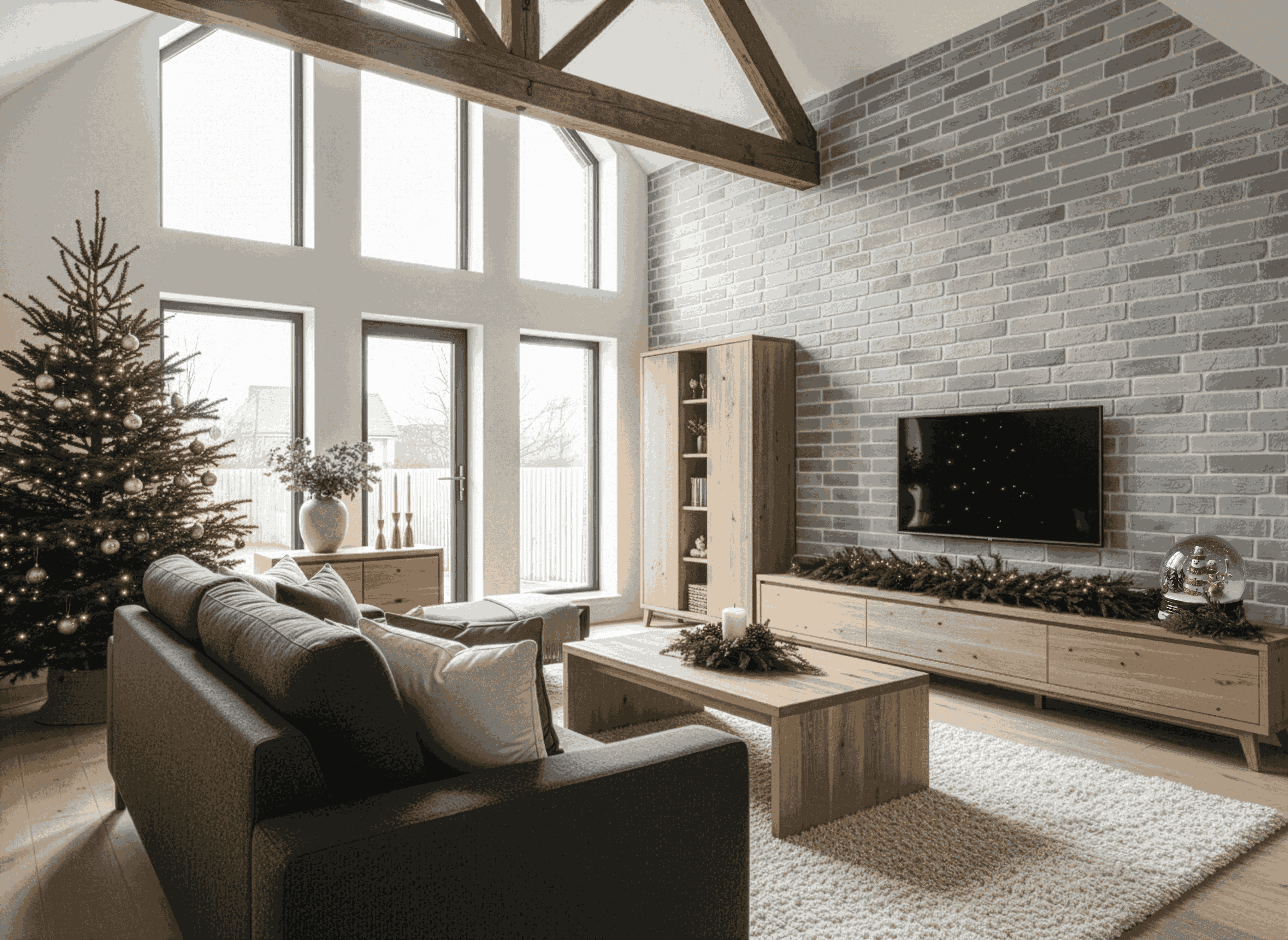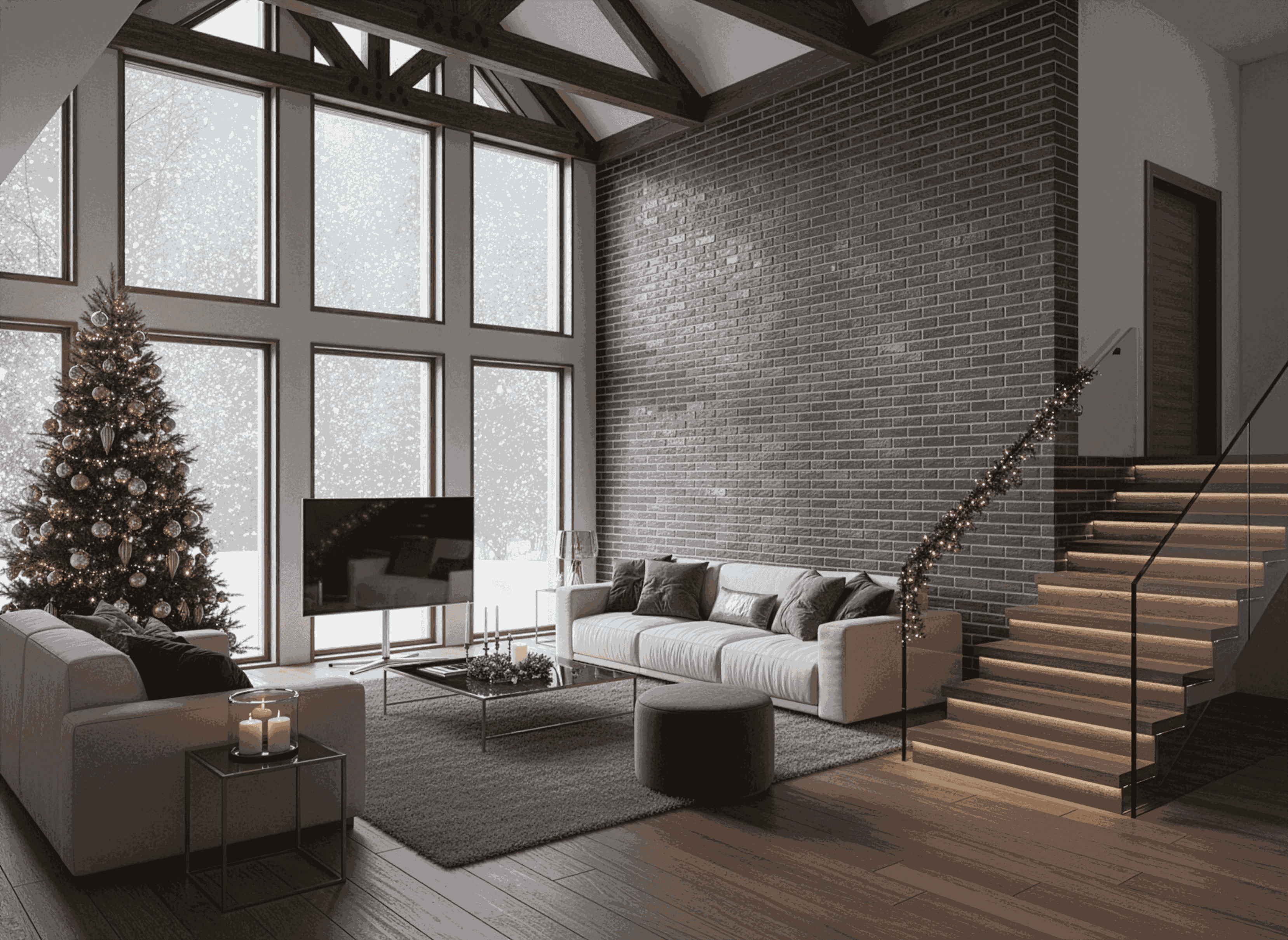 Salon z grafitową płytką ceglaną powinien być urządzony w stylu nowoczesnym, glamour lub loft elegancki. Designerskie meble, efektowne oświetlenie, złote, srebrne lub białe dodatki. Mocny kontrast z zielenią choinki i świątecznymi dekoracjami tworzy luksusową, nastrojową aranżację.
