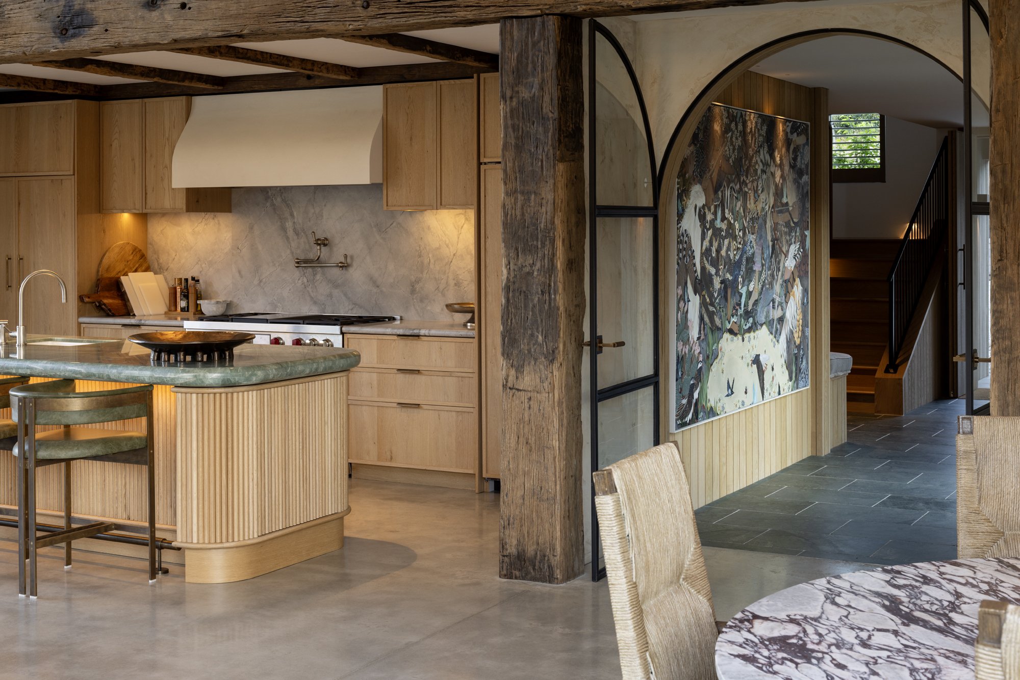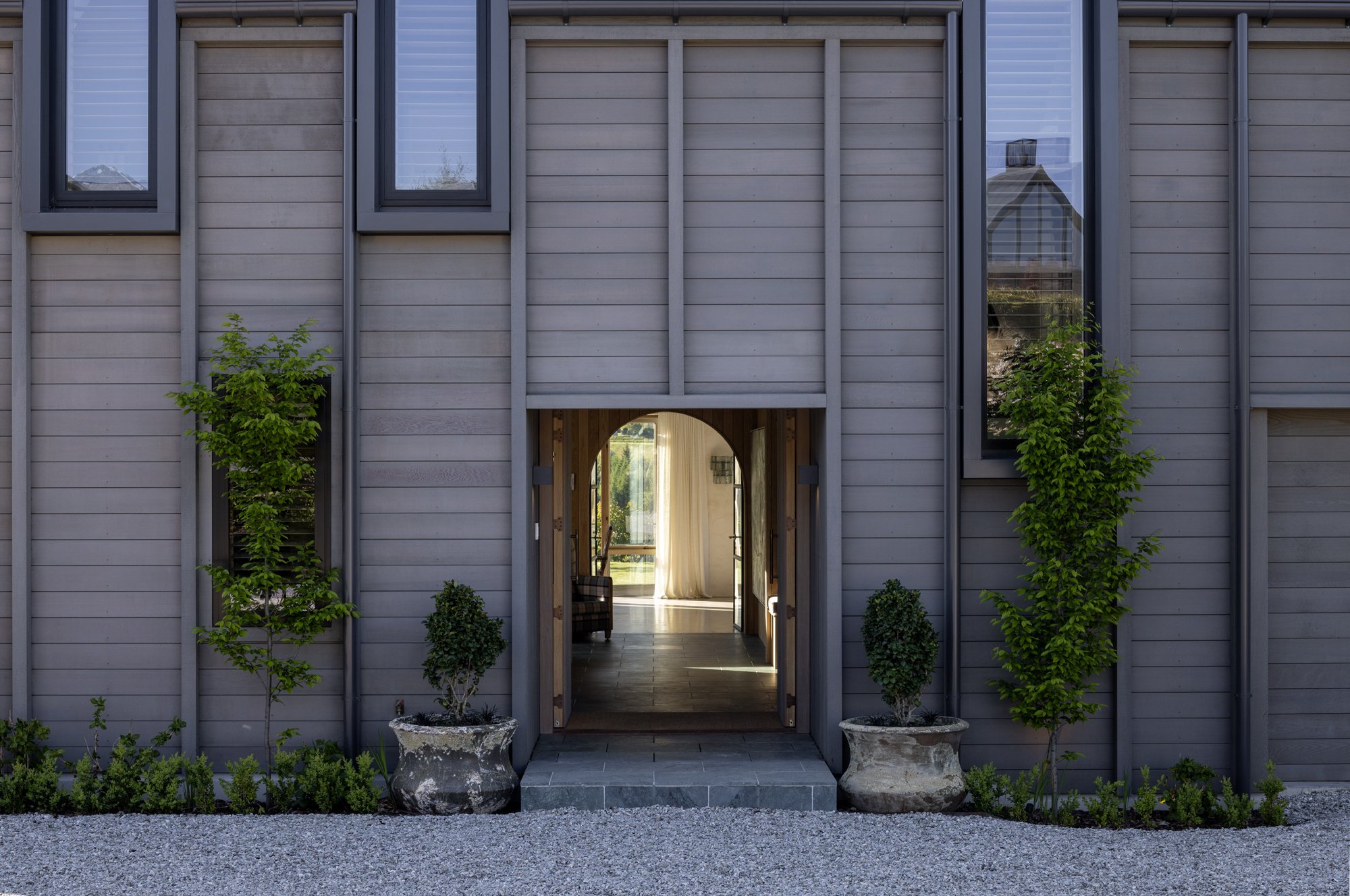 Dwupoziomowa „Barn” mieści sypialnie z łazienkami oraz garaż. Elewację zdobią rustykalne deski cedrowe z pionowymi wzmocnieniami, a współczesne okna mansardowe dodają rytmu fasadzie wejściowej. Wewnątrz cedrowa okładzina prowadzi do ciepłego lobby, które łączy się z jasnym i przestronnym łącznikiem. Przeszklone stalowe drzwi w formie łuków prowadzą do „Cottage”.