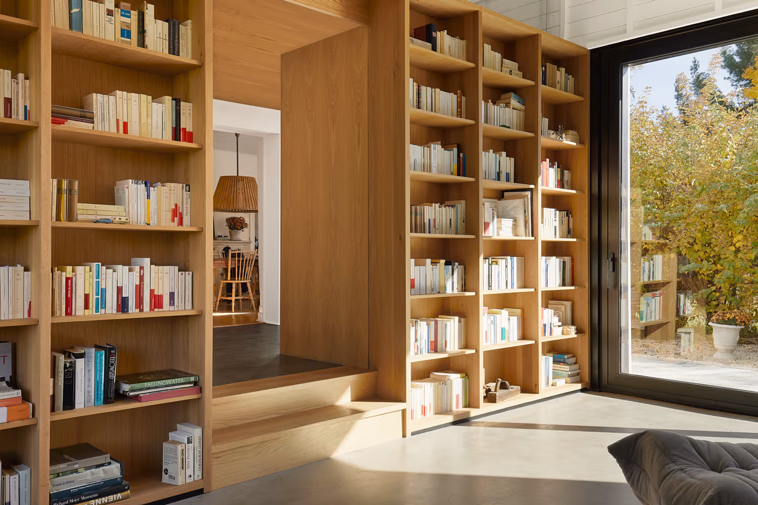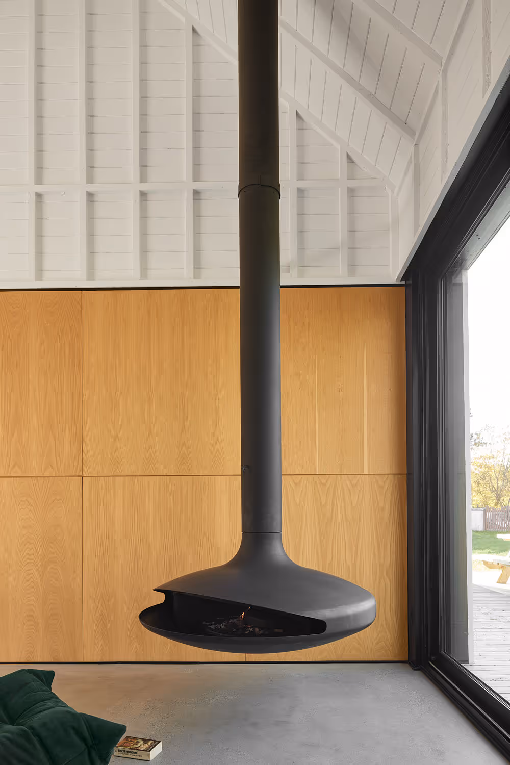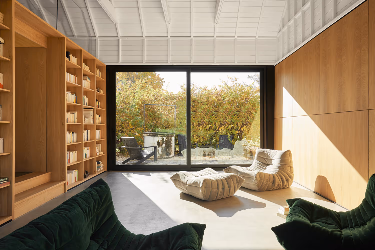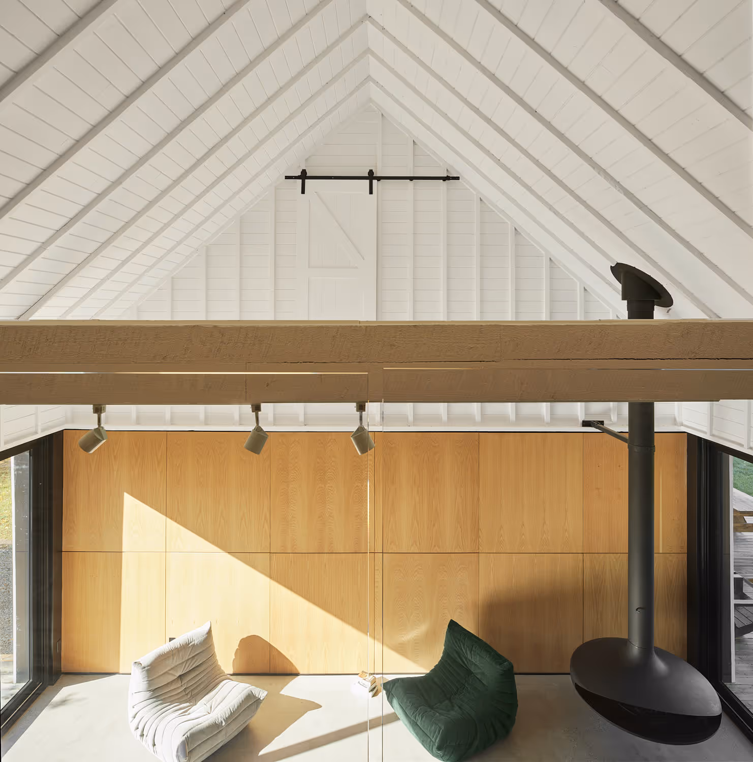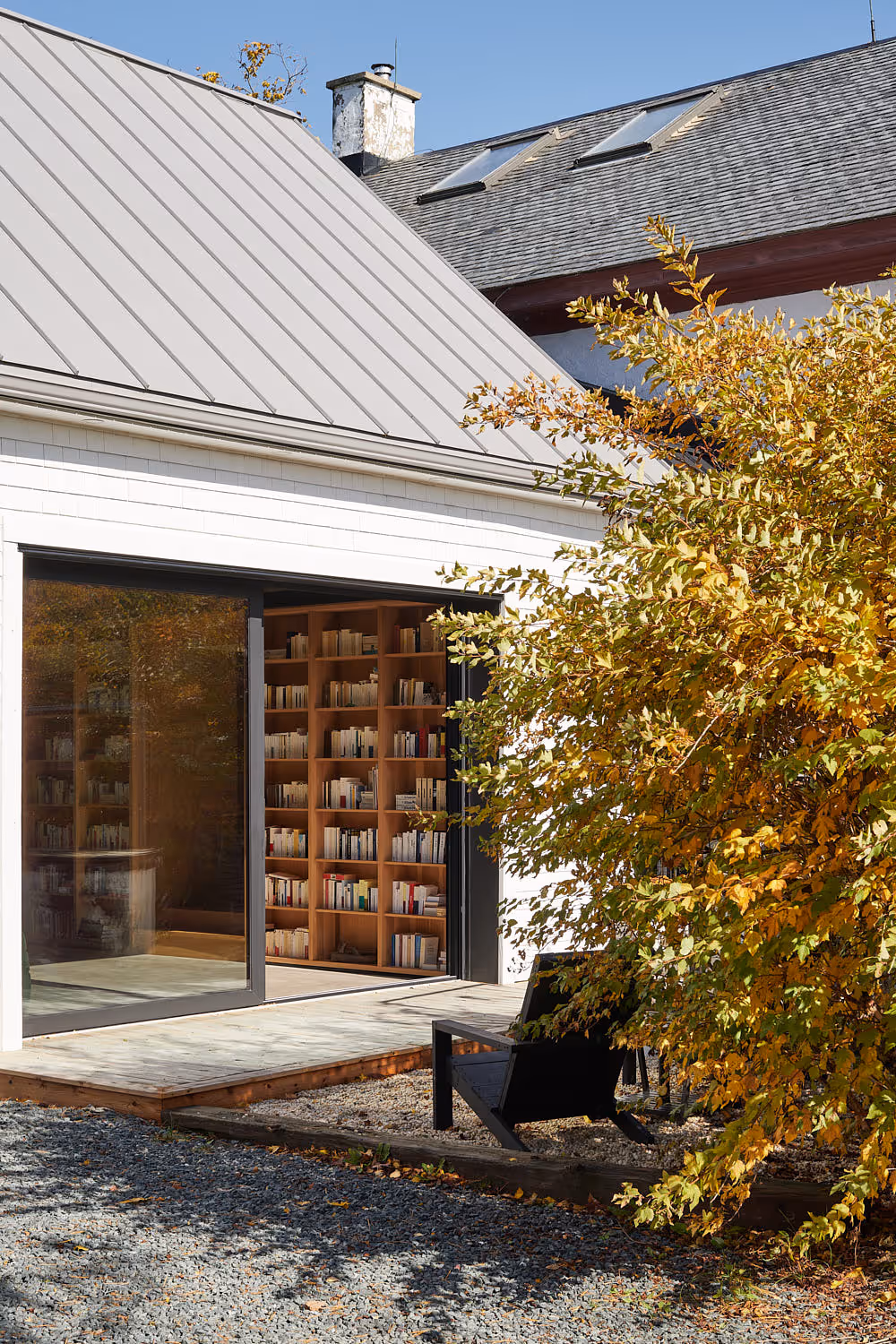 Jednym z kluczowych działań było otwarcie wnętrza – zaprojektowano dużą połacię przeszkleń, które łączą dom z otaczającym krajobrazem pól i lasów Québecu. Układ funkcjonalny adaptuje obiekt do życia domowego: nowa część aneksu obejmuje bibliotekę, przestrzeń biurową, garaż oraz możliwy w przyszłości pokój dla gości – wszystko w subtelnym dialogu z budynkiem głównym.