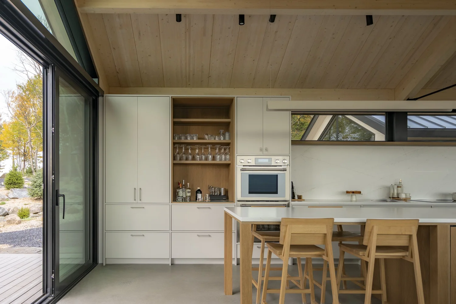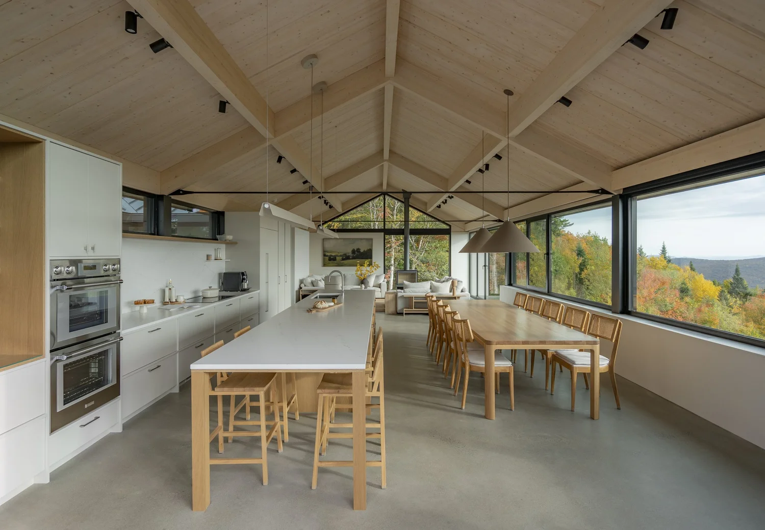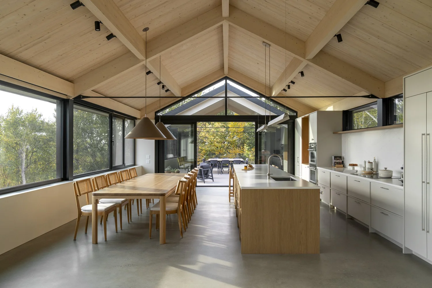 Najbardziej wyrazistym elementem Maison MONT-FOSTER jest pozostawiona na widoku konstrukcja dachu. To ona nadaje wnętrzom wyjątkową tożsamość i buduje ich przestrzenny charakter. Architekci porównują ją do korony dojrzałego drzewa – obecnej, rozłożystej, a jednocześnie lekkiej. Taka forma sprawia, że wnętrze zyskuje monumentalność bez utraty przytulności.