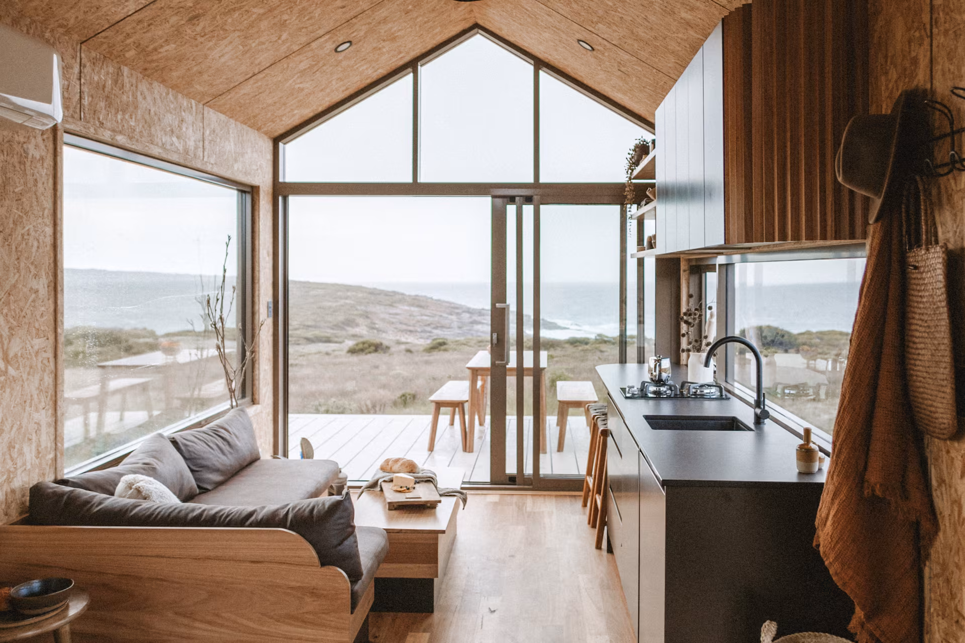 Wnętrze zostało zaprojektowane jako kompaktowa, ale komfortowa przestrzeń dla czterech osób. Znajduje się tu główna sypialnia z widokiem na ocean, antresola z dodatkowym łóżkiem oraz strefa dzienna z kuchnią i miejscem do odpoczynku. Pomimo niewielkiej skali, dom oferuje wysoki standard – w tym przestronną łazienkę z podwójnym prysznicem oraz starannie dobrane materiały i wyposażenie.