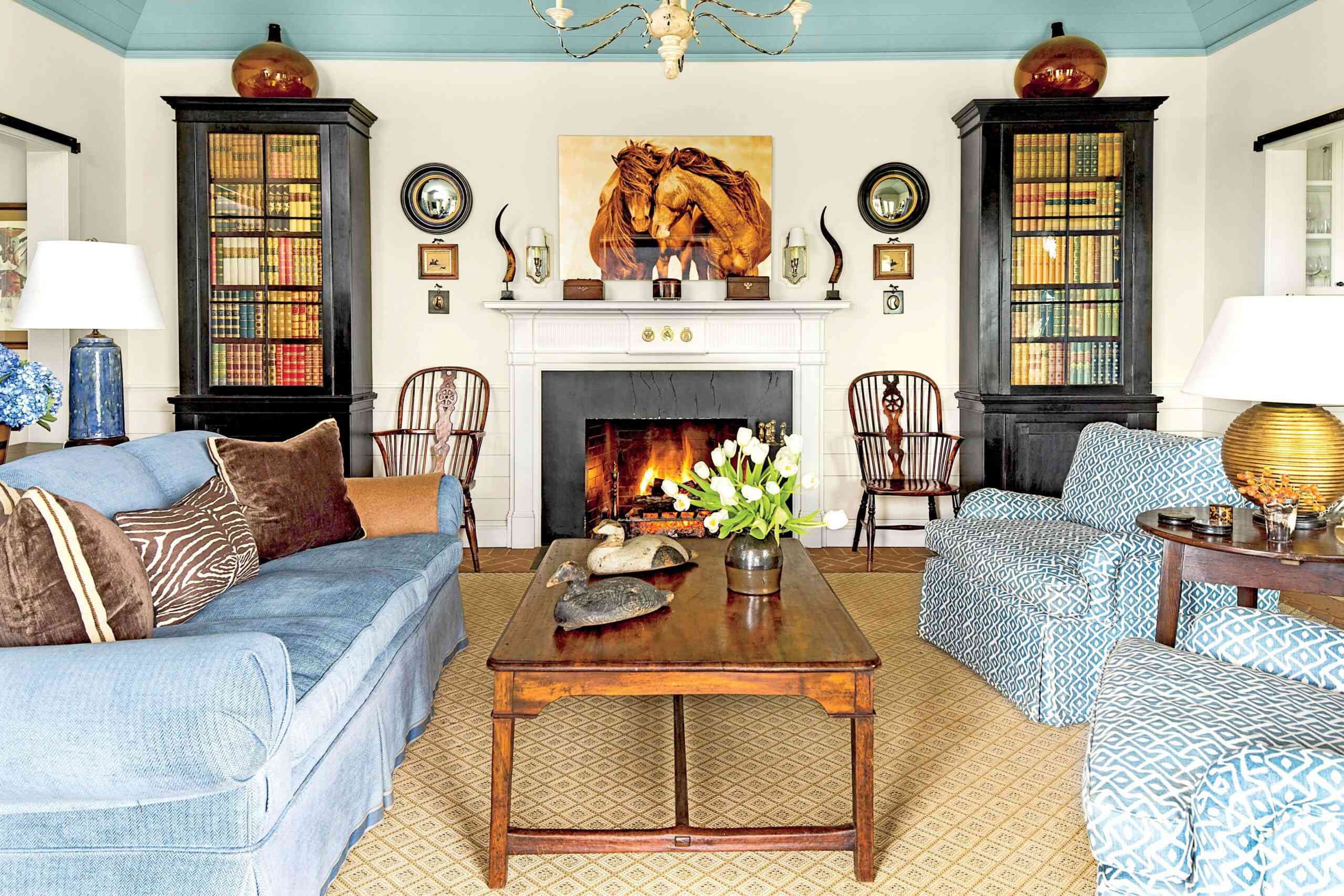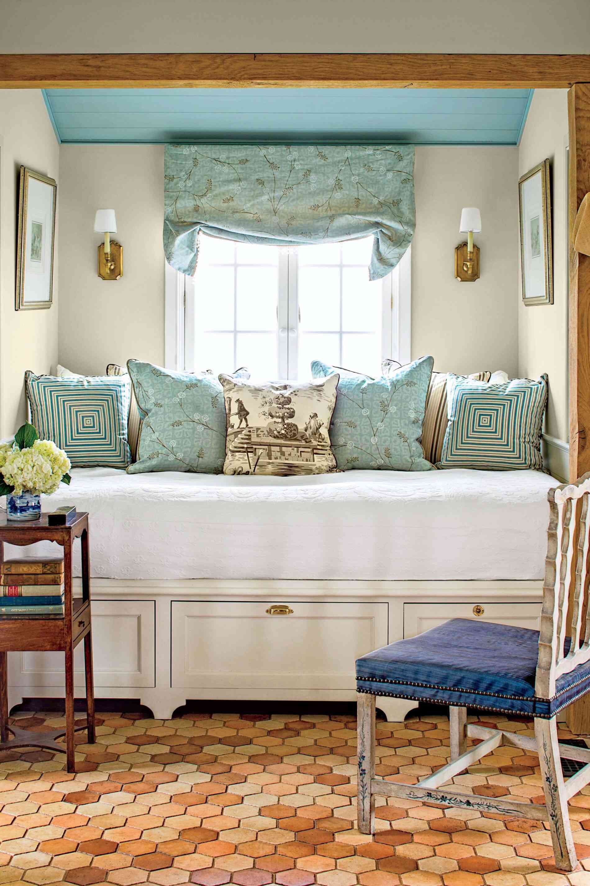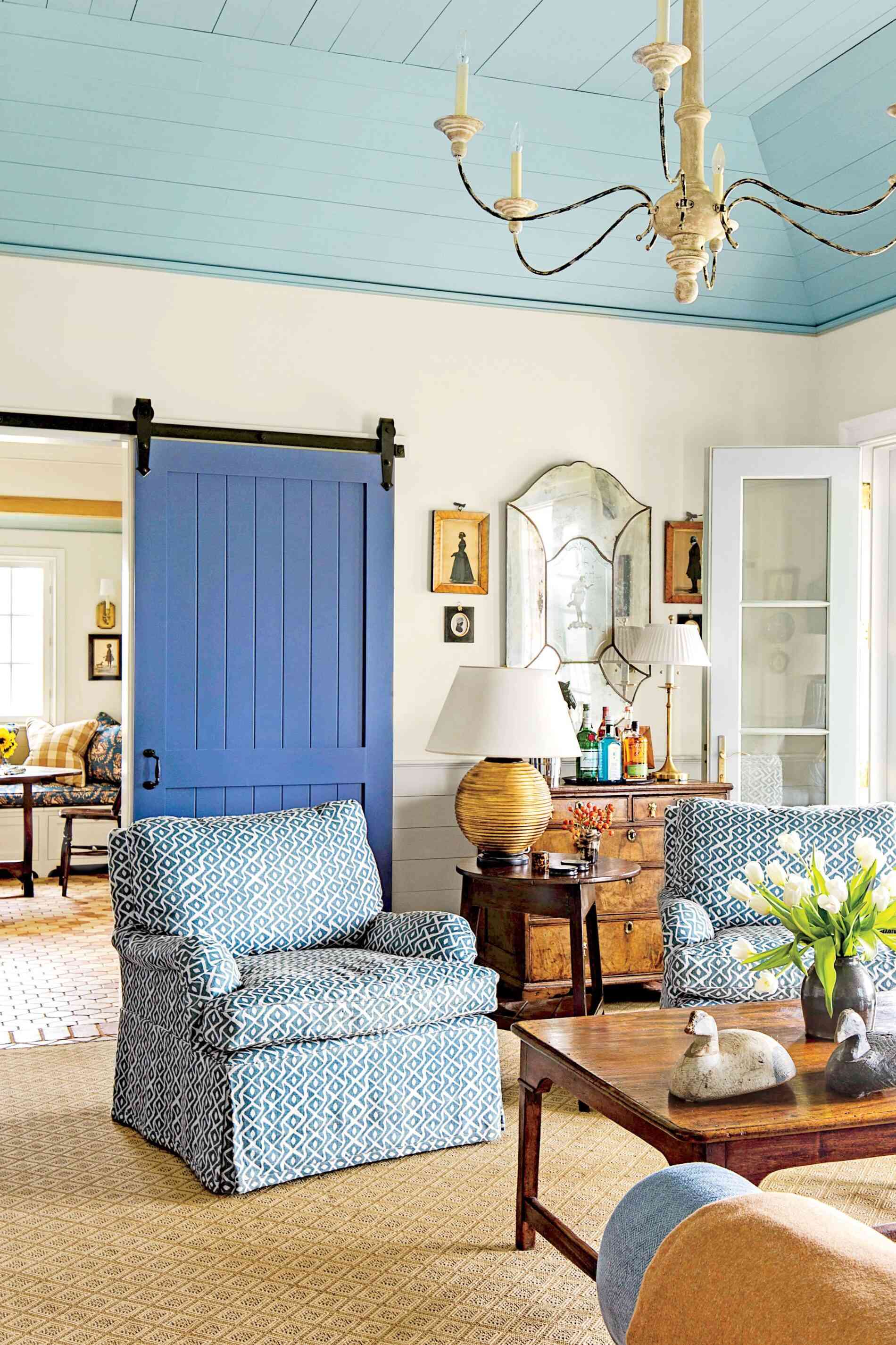 Salon i sypialnia również pokazują, jak sprytnie zaprojektować małą przestrzeń mieszkalną. Duży dywan optycznie scala salon, a przesuwne drzwi w stylu stodoły w intensywnym niebieskim kolorze oszczędzają miejsce i stanowią wyrazisty akcent aranżacyjny. Niebieski sufit wizualnie podwyższa wnętrze, a ograniczona paleta barw – biel i odcienie niebieskiego – zapewnia spójność i lekkość. W sypialni łóżko zostało wsunięte we wnękę, a szuflady pod nim pełnią funkcję praktycznych schowków. Całość tworzy funkcjonalny, jasny i przytulny dom, który udowadnia, że mała powierzchnia nie musi oznaczać kompromisów.