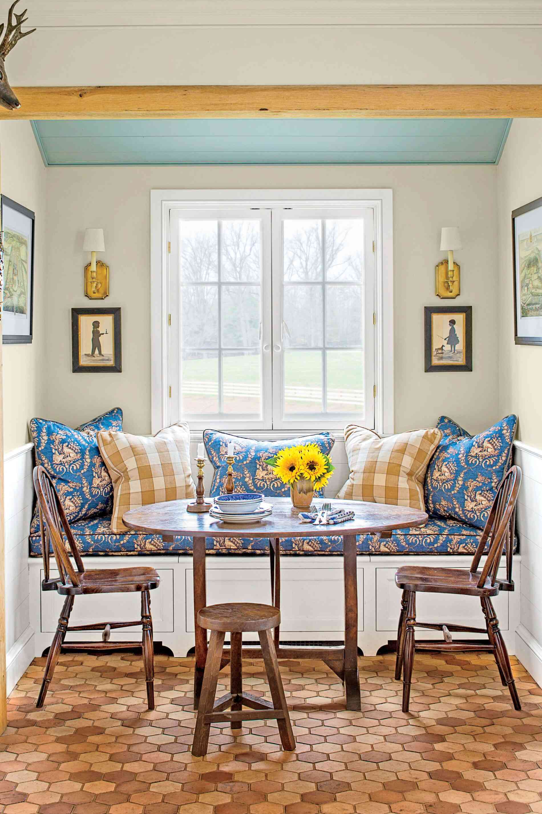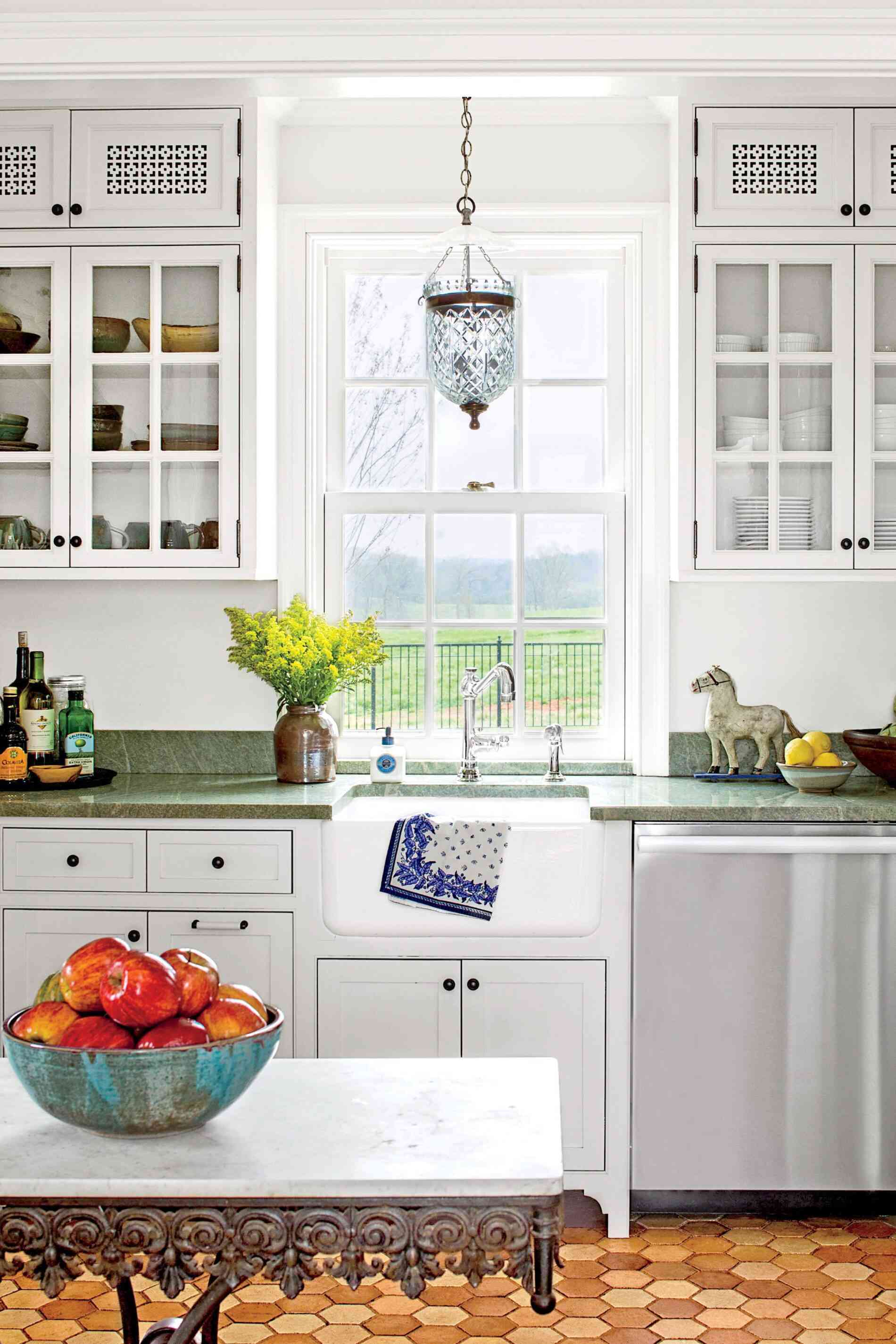 Kuchnia w małym domu została zaprojektowana tak, aby maksymalnie wykorzystać dostępną przestrzeń. Biała zabudowa kuchenna została uzupełniona o blaty z zielonego steatytu (soapstone) oraz przeszklone górne szafki, które dodają lekkości i koloru, nie przytłaczając wnętrza. Wielofunkcyjny stół z marmuru i metalu pełni rolę blatu roboczego, stołu jadalnianego i miejsca spotkań. Kącik jadalniany oparto na zasadzie symetrii, która – jak podkreśla projektant – porządkuje przestrzeń i uspokaja odbiór wizualny, co jest kluczowe w aranżacji małych wnętrz.