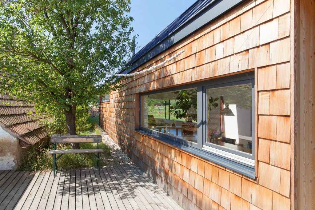 Dobudówka otworzyła wnętrze na otaczający krajobraz, wprowadzając do salonu światło, przestrzeń i widok, którego wcześniej brakowało. Całość spaja naturalna drewniana elewacja z gontu, która harmonijnie wtapia budynek w krajobraz. To przykład, jak szacunek dla tradycji i lokalnych materiałów może współistnieć z nowoczesnym podejściem do projektowania, tworząc ponadczasowy dom – ciepły, rodzinny i pełen charakteru.
