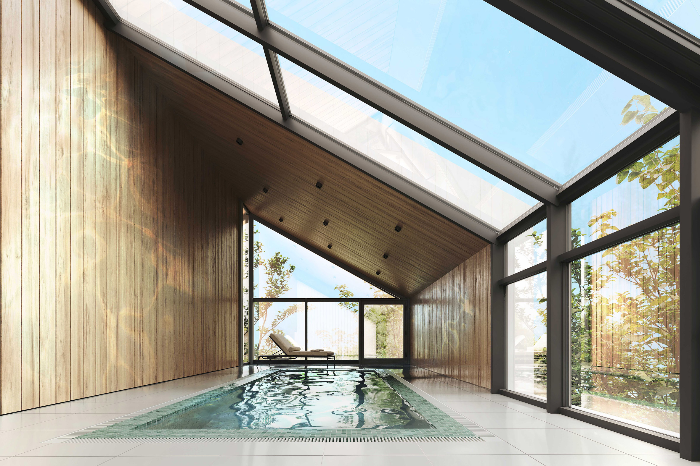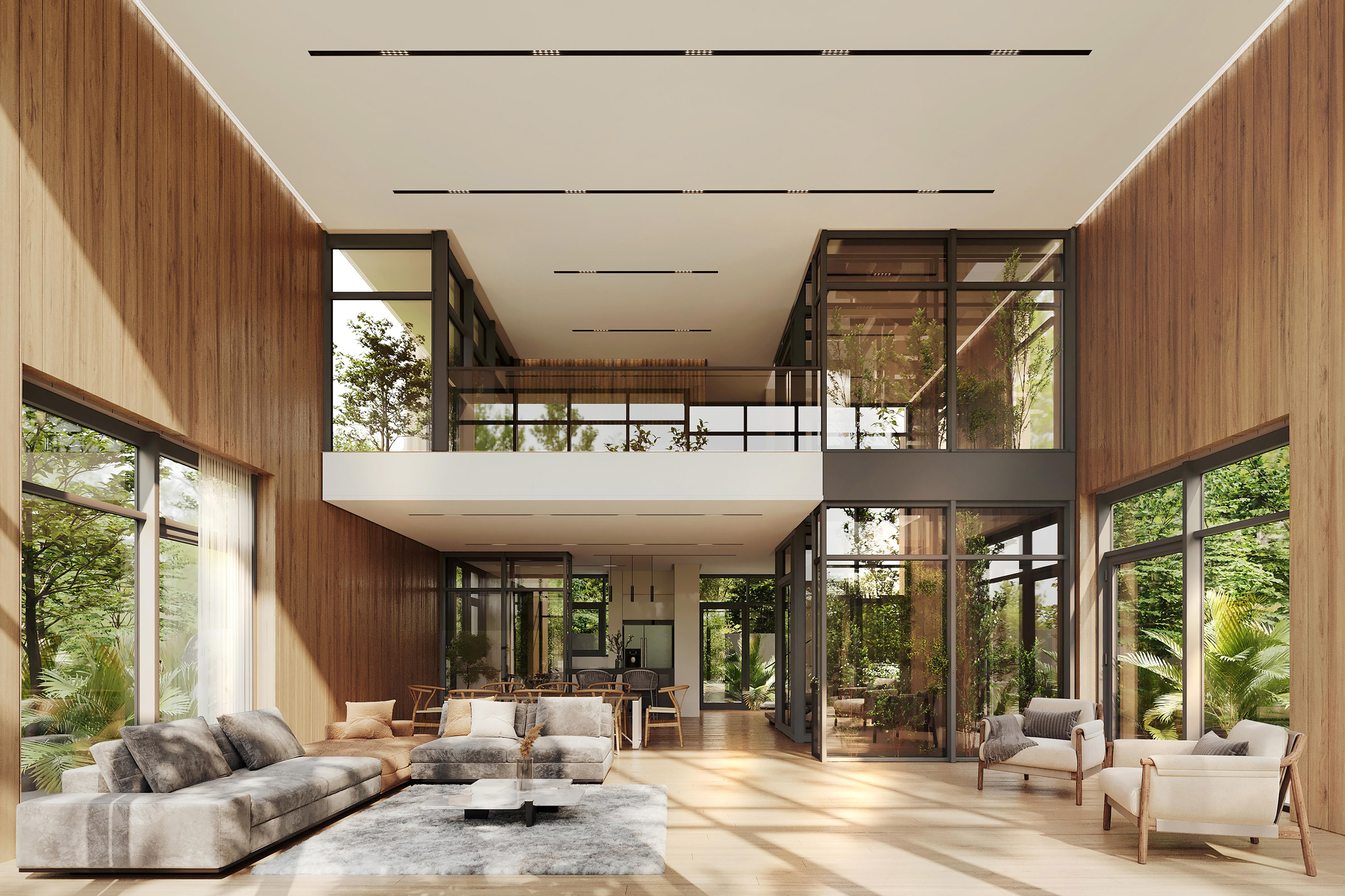 Wizualizacje wnętrz ukazują przestronne, drewniane przestrzenie mieszkalne z podziałami szklanymi i antresolami, a także prywatnymi basenami. W ramach kompleksu wprowadzone zostaną rozwiązania ekologiczne, takie jak zbieranie i oczyszczanie deszczówki.
