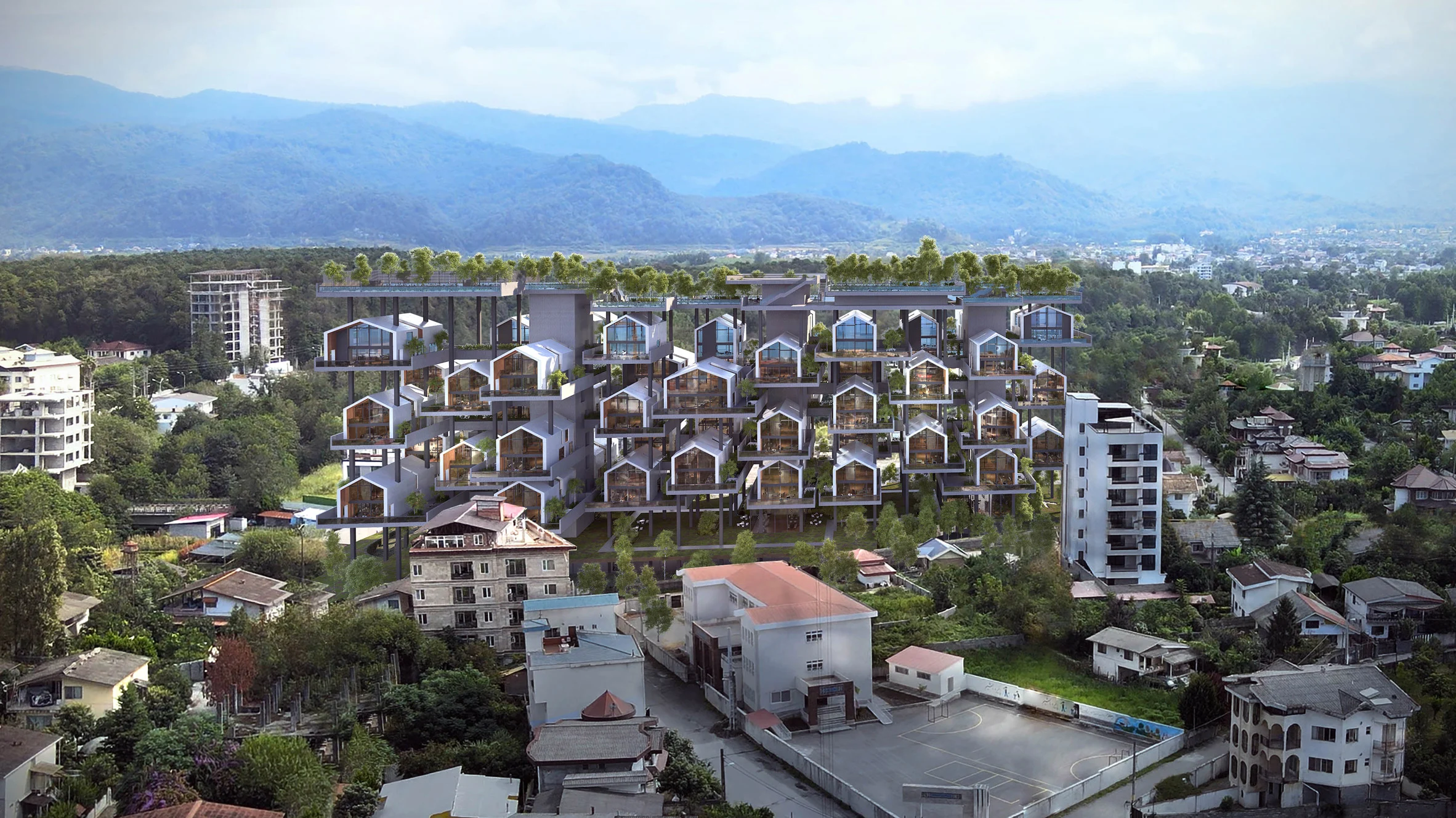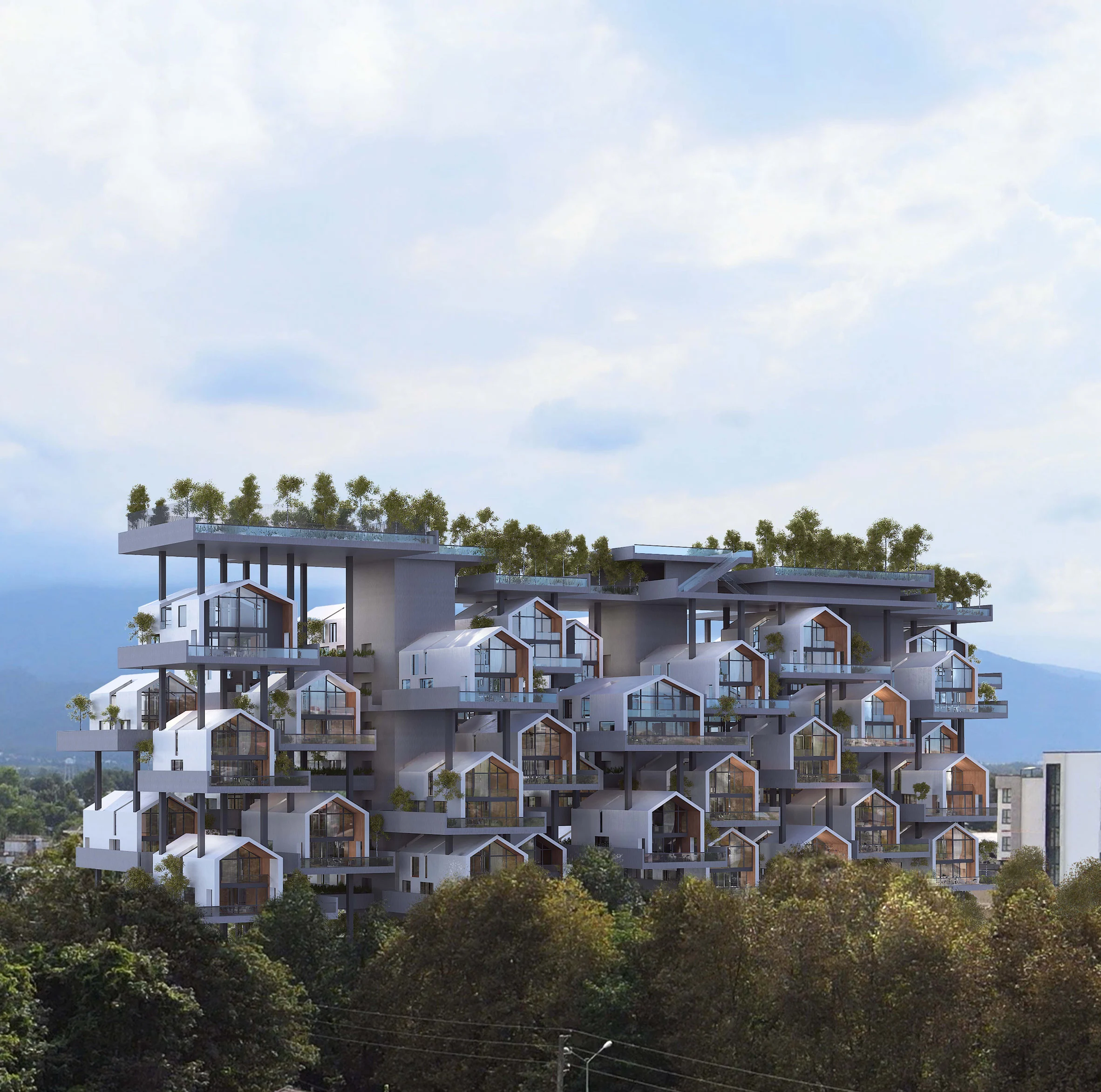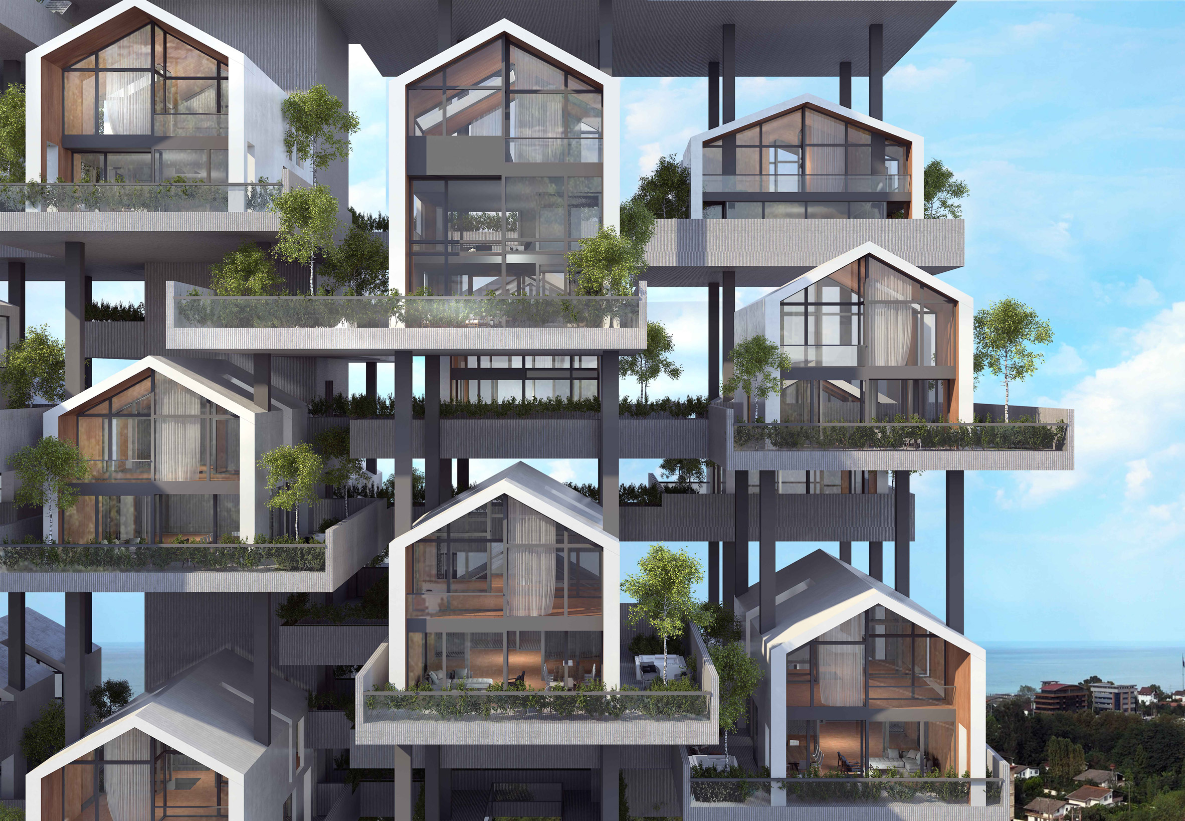 Każda z jednostek, różniących się szerokością i wysokością, zostanie wyposażona w duże przeszklenia, które prowadzą na zielone tarasy z widokiem na otoczenie. Dachy budynków zostaną połączone zewnętrznymi schodami, a ich przestrzenie będą ozdobione roślinnością, tworząc dodatkowe miejsca do użytku mieszkańców.