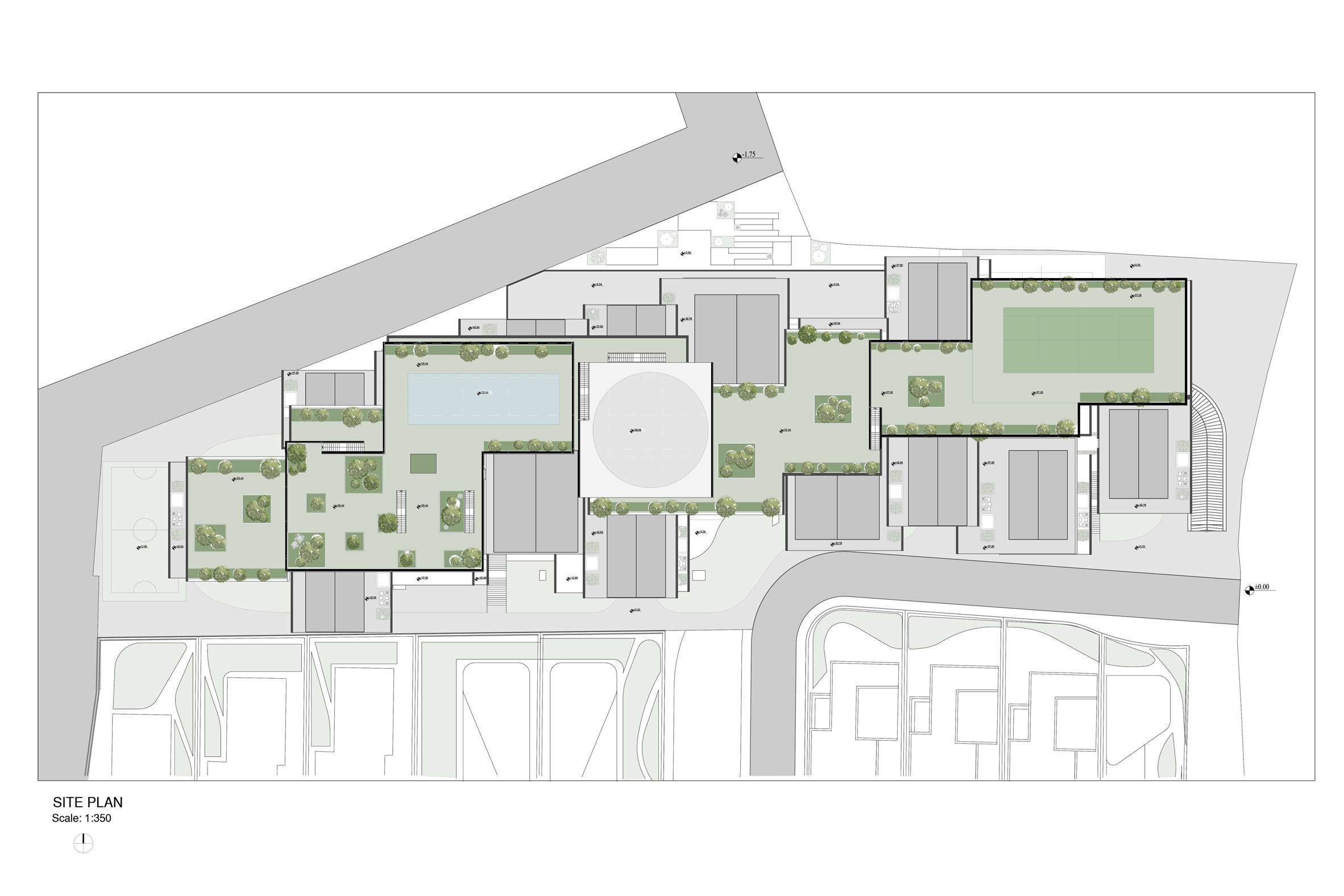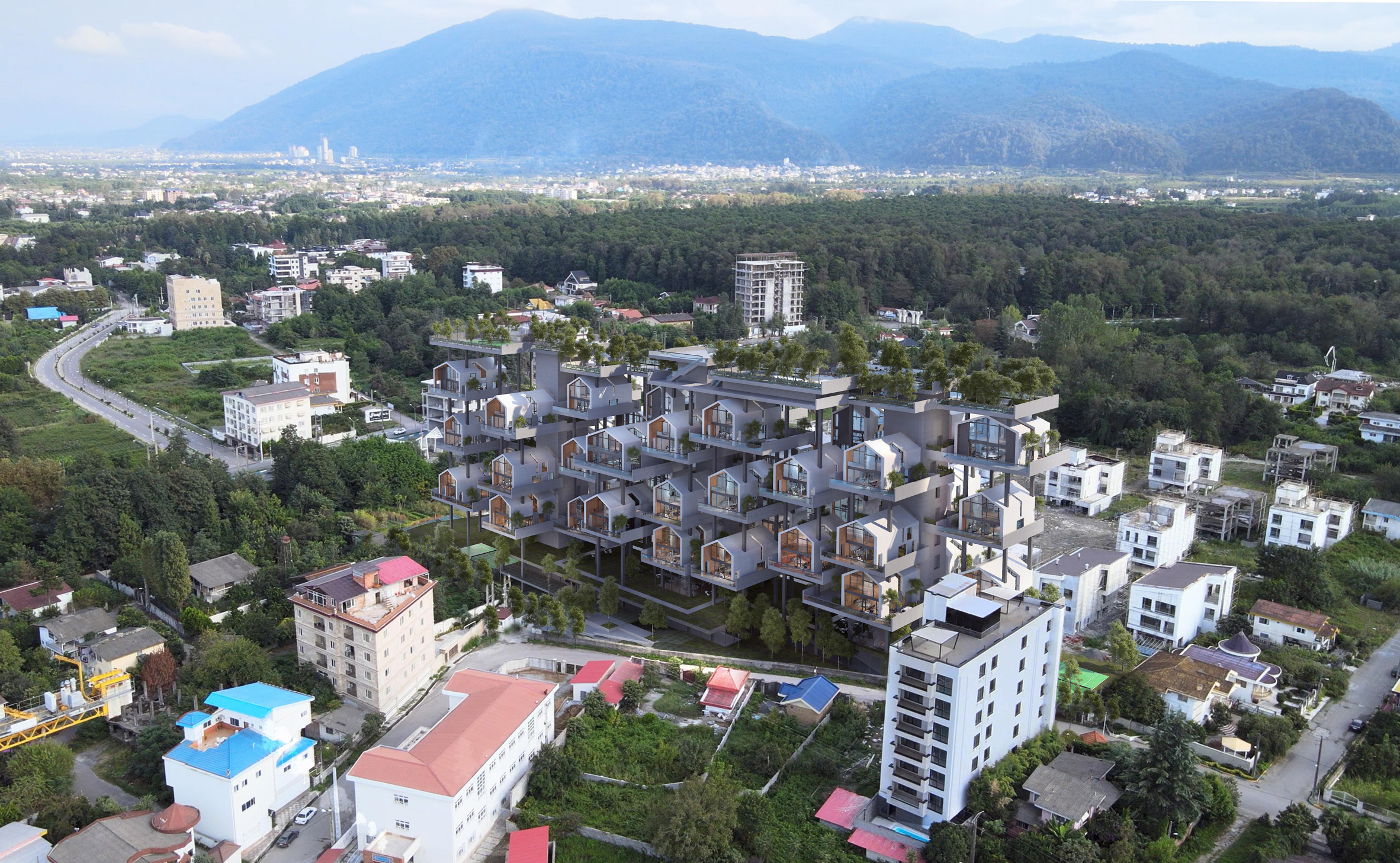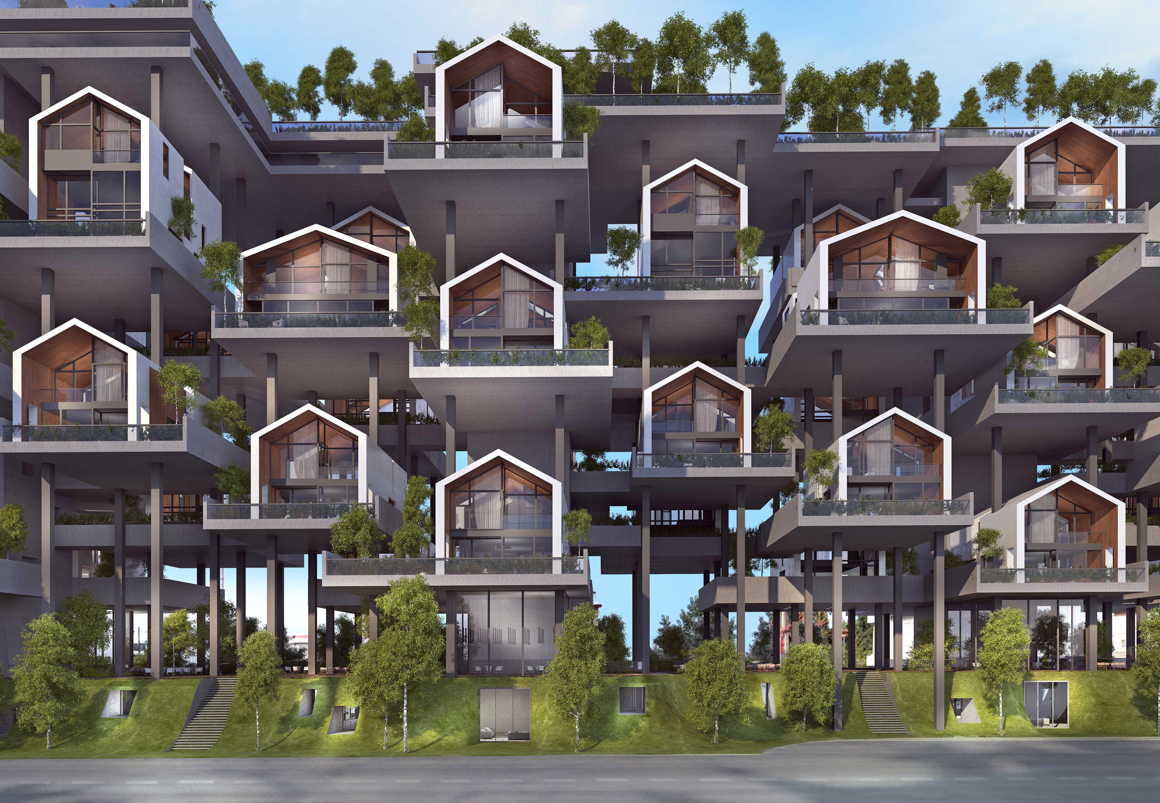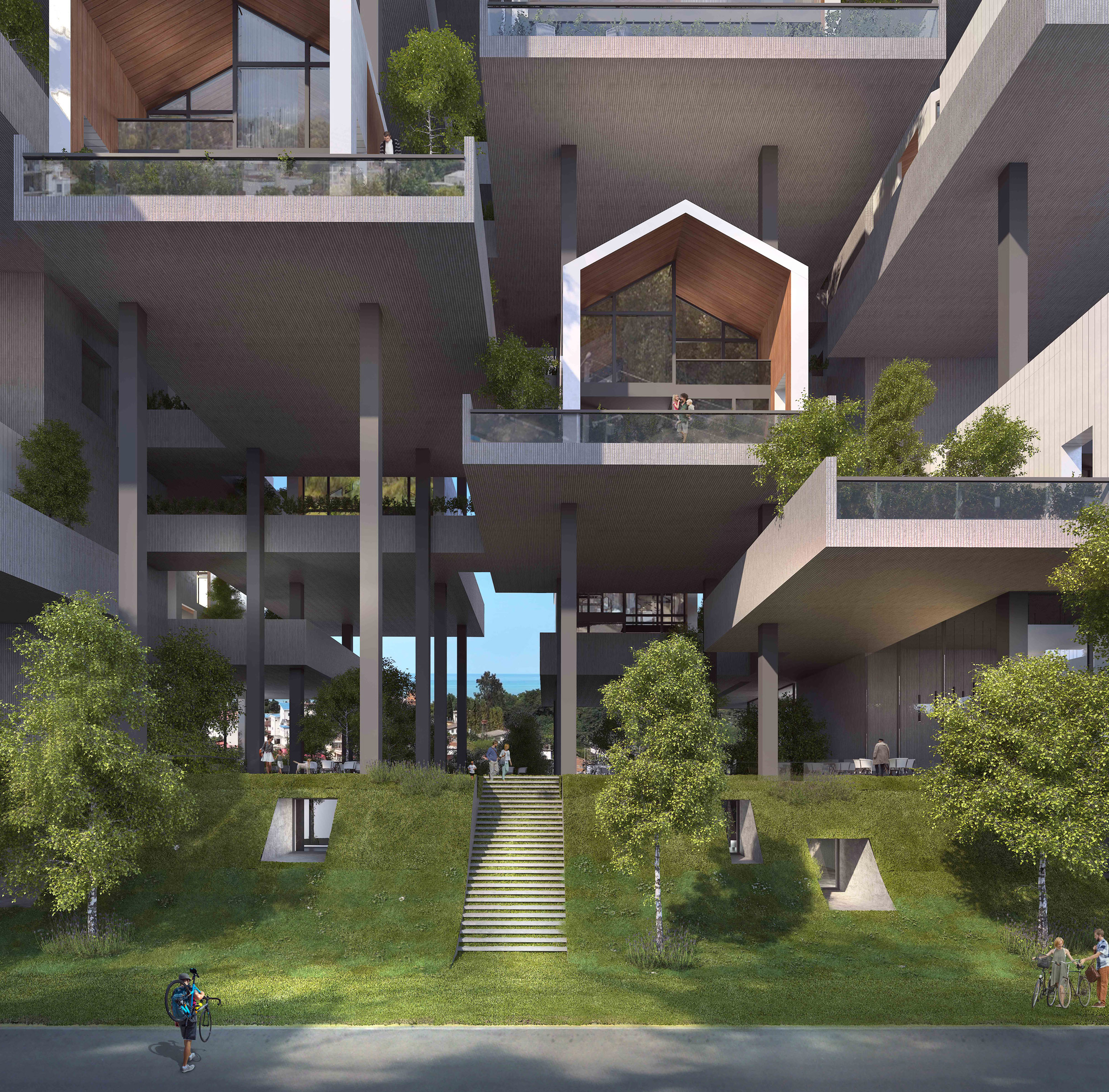 Wizualizacje projektu przedstawiają sieć podwyższonych brył o stromych dachach, wspartych na dużych kolumnach. Na poziomie gruntu znajdzie się rozległy trawiasty teren, uzupełniony dodatkowymi przestrzeniami wspólnymi. Powyżej, obszerne strefy wypoczynkowe będą osłonięte przez bryły willowe.