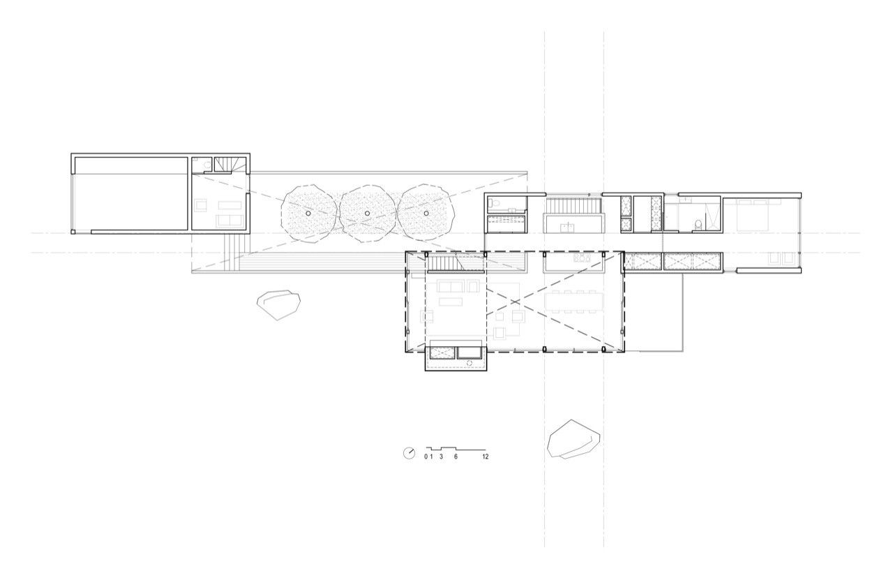 Projekt obejmuje cztery główne komponenty. Domek z dwuspadowym dachem dla gości i z miejscem garażowym, pawilon mieszkalny z dwuspadowym dachem, zwrócony na północ bar oraz dziedziniec, który łączy wszystkie elementy. Kierunek komunikacyjny, ustalony przez architektów, skierowano w stronę oceanu. Najpierw przechodzi się przez garaż, który stanowi pewnego rodzaju bramę ochronną. Następnie wchodzi się na osłonięty dziedziniec i dalej wzdłuż ławy przechodzi się do dwupoziomowego pawilonu mieszkalnego, z którego można przejść na taras z widokiem na wodę. Pawilon zwrócony w stronę południową wyposażono w wyróżniający się, betonowy kominek.