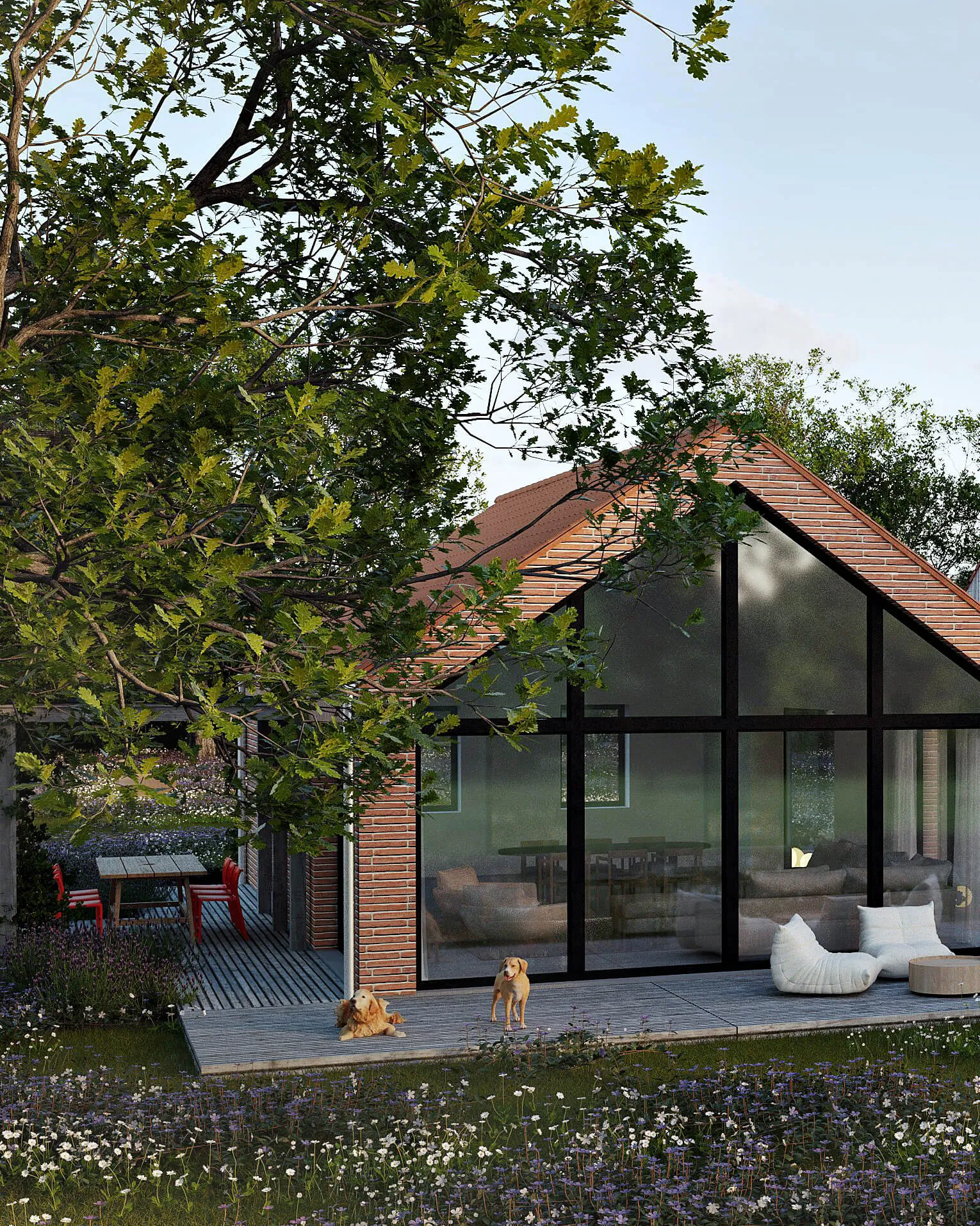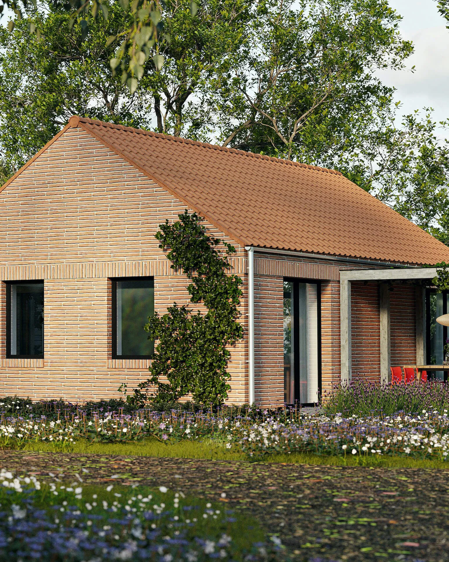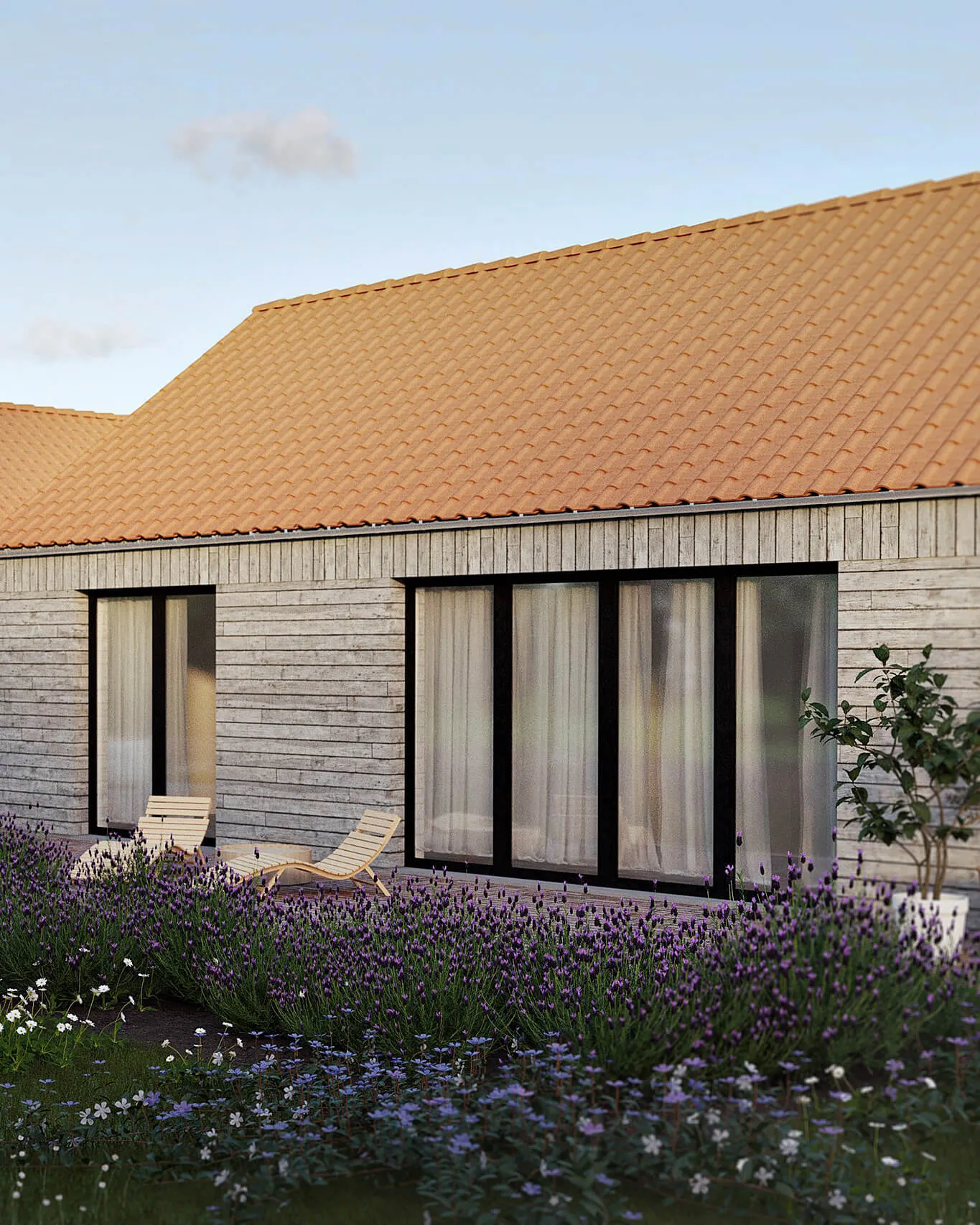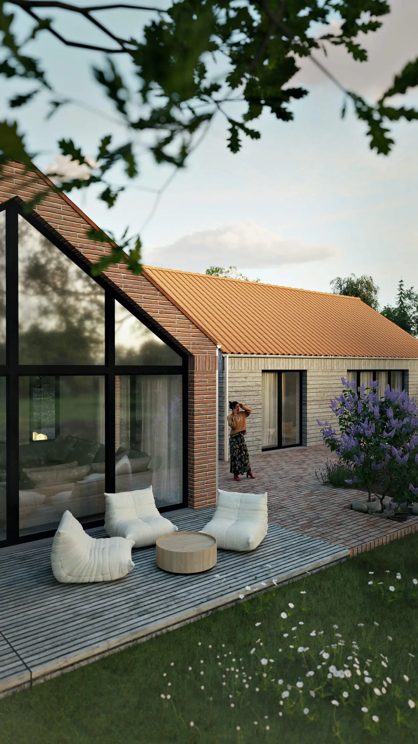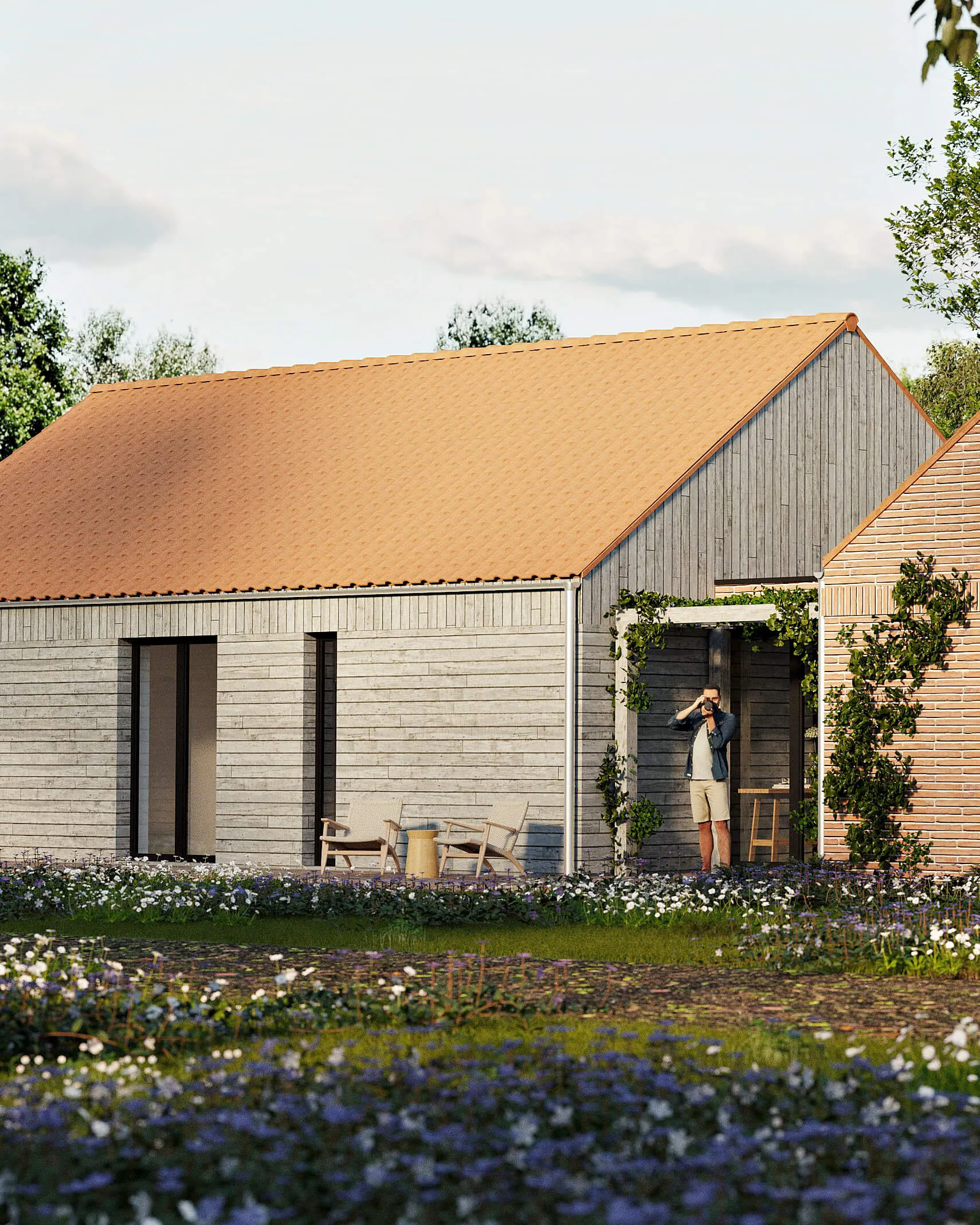 Charakter zabudowy naszego projektu doskonale wpisuje się w sielski klimat mazurskiej wsi. Tradycyjne materiały, takie jak drewno i cegła, w połączeniu z nowoczesnymi elementami architektonicznymi, jak duże przeszklenia, tworzą spójną i estetyczną całość. Budynek harmonijnie komponuje się z otaczającym krajobrazem, nie przytłaczając go, a jedynie go dopełniając.