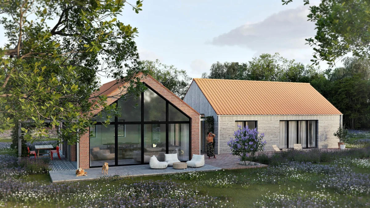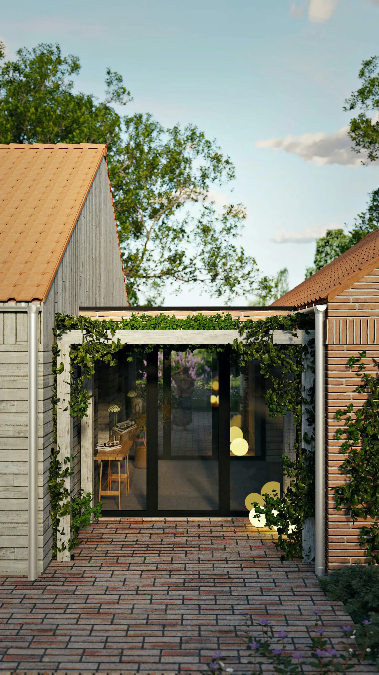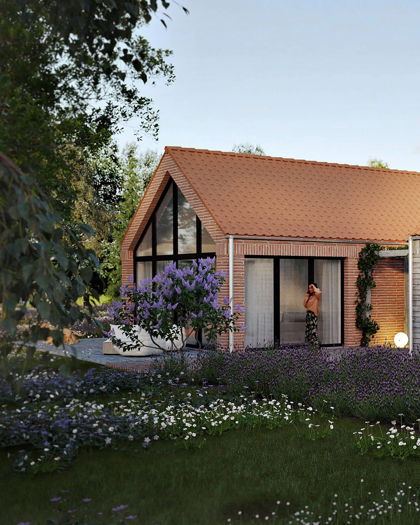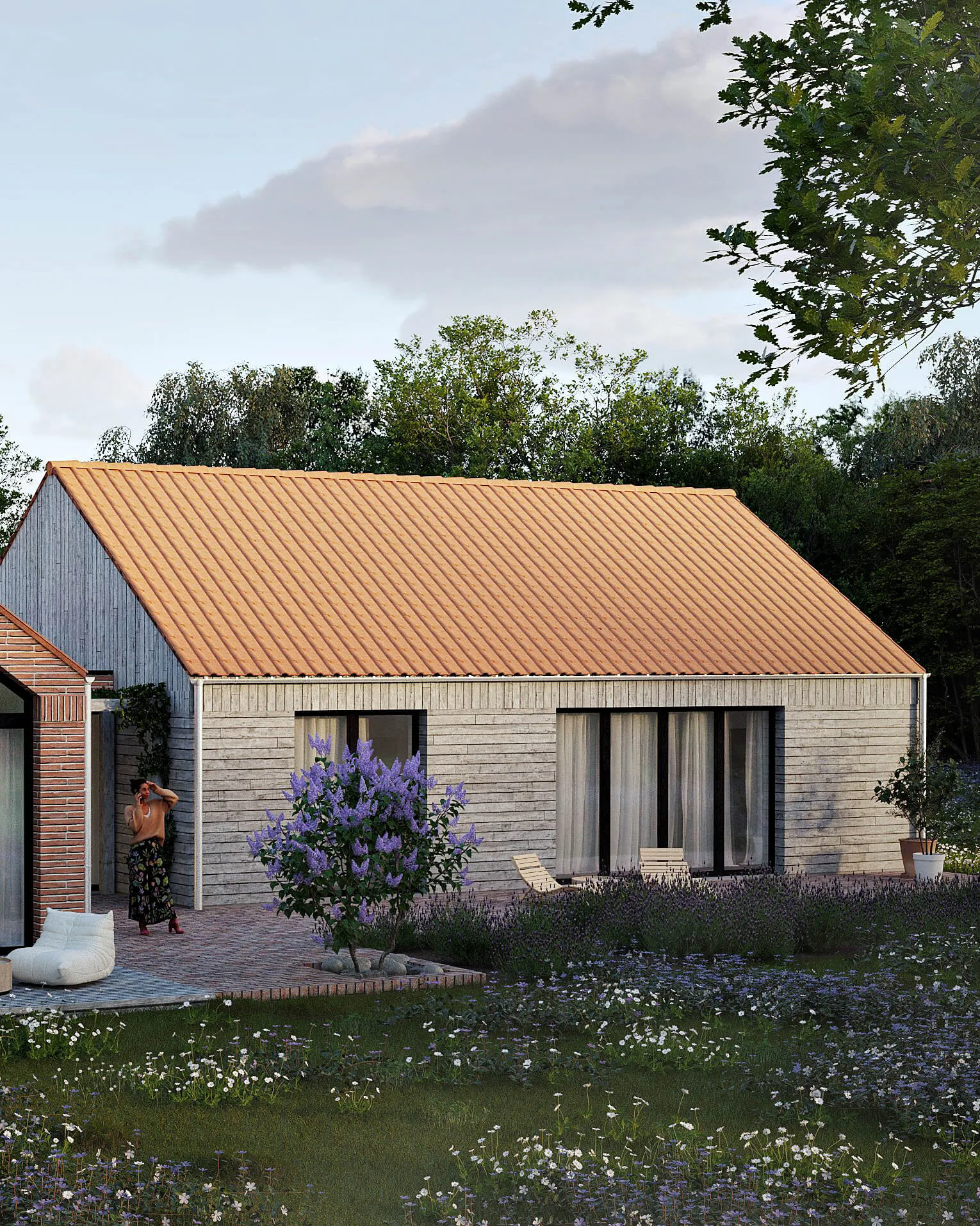 Charakter zabudowy naszego projektu doskonale wpisuje się w sielski klimat mazurskiej wsi. Tradycyjne materiały, takie jak drewno i cegła, w połączeniu z nowoczesnymi elementami architektonicznymi, jak duże przeszklenia, tworzą spójną i estetyczną całość. Budynek harmonijnie komponuje się z otaczającym krajobrazem, nie przytłaczając go, a jedynie go dopełniając.