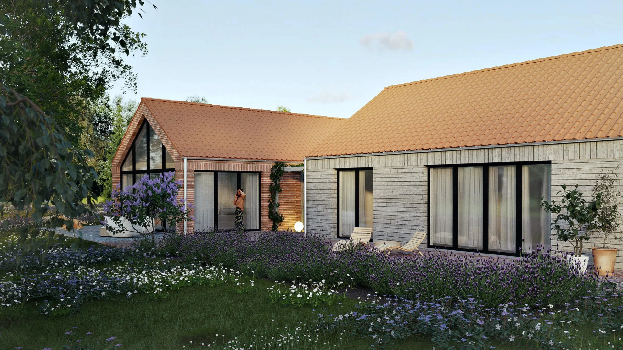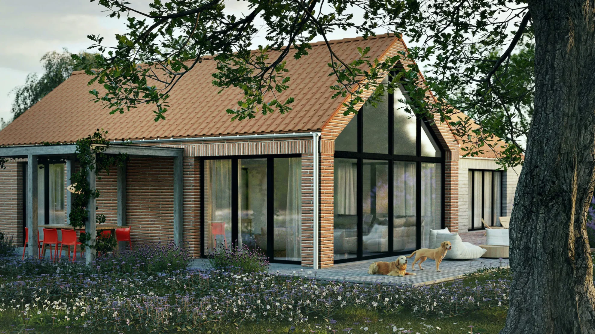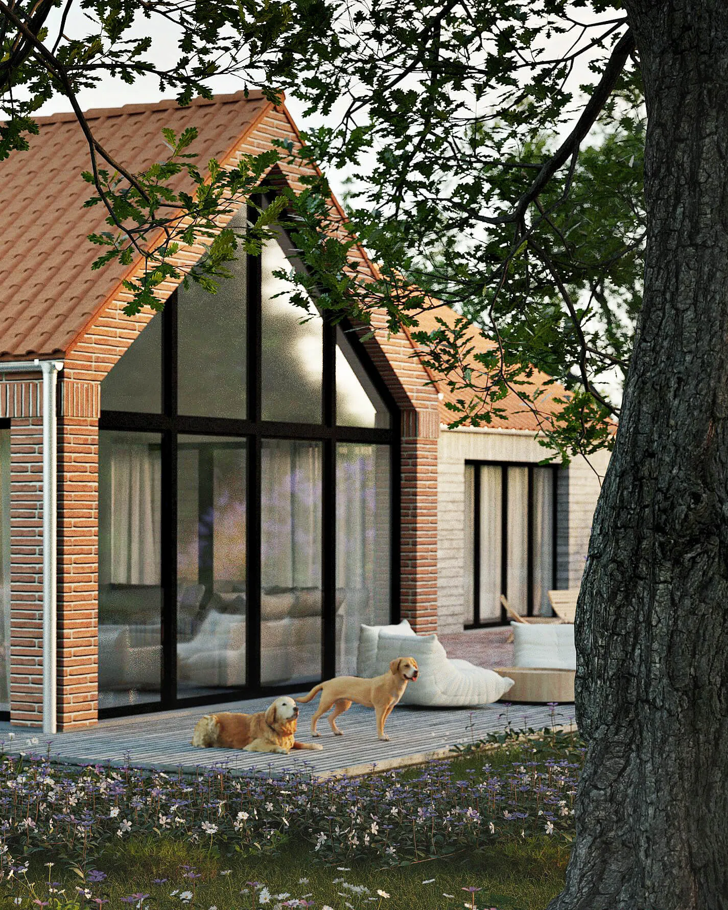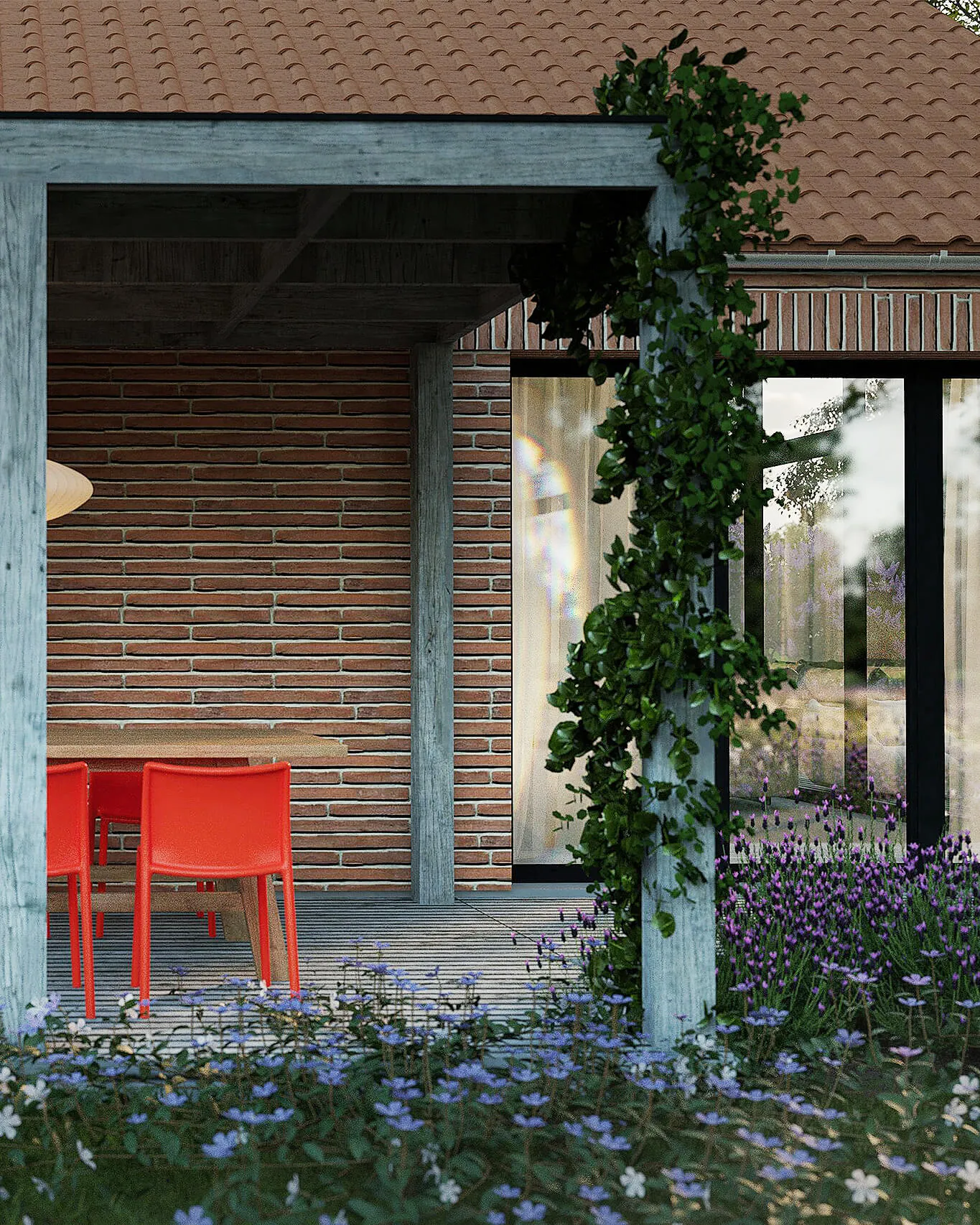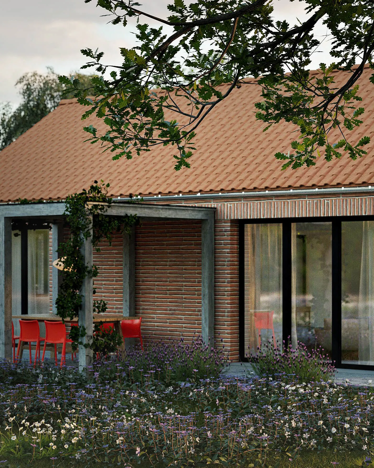 Charakter zabudowy naszego projektu doskonale wpisuje się w sielski klimat mazurskiej wsi. Tradycyjne materiały, takie jak drewno i cegła, w połączeniu z nowoczesnymi elementami architektonicznymi, jak duże przeszklenia, tworzą spójną i estetyczną całość. Budynek harmonijnie komponuje się z otaczającym krajobrazem, nie przytłaczając go, a jedynie go dopełniając.