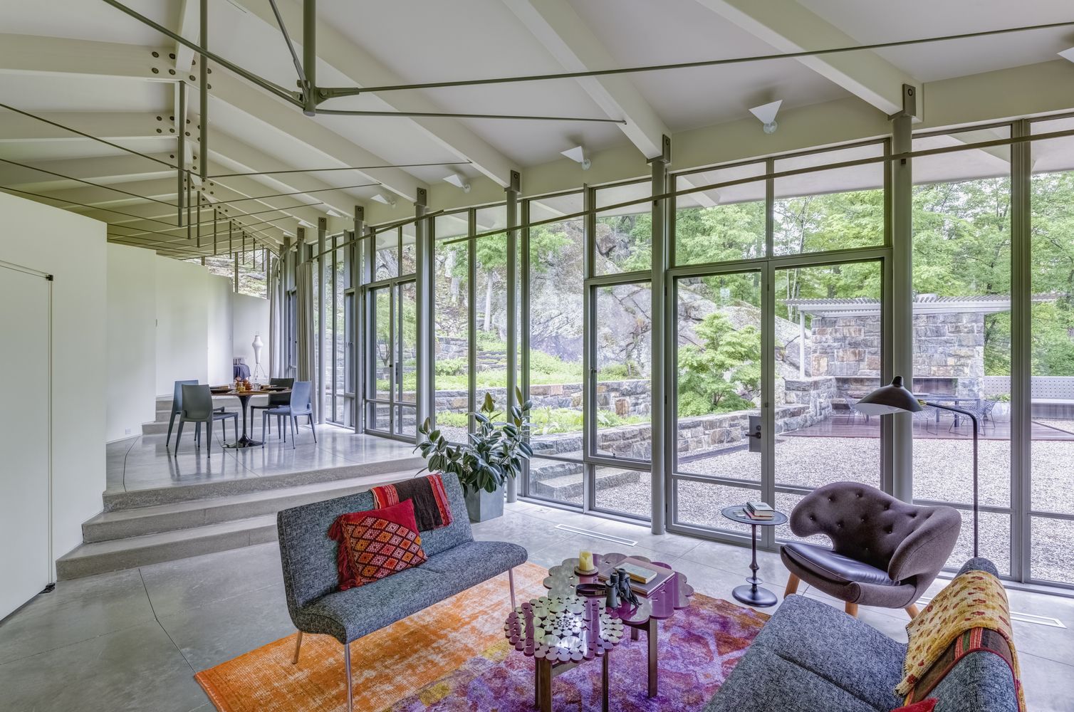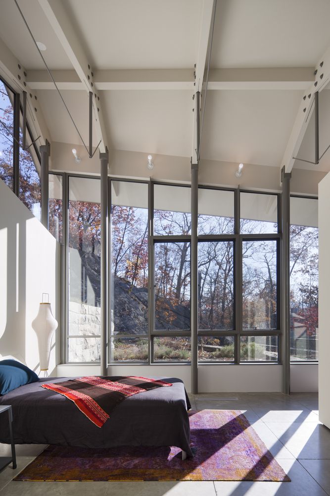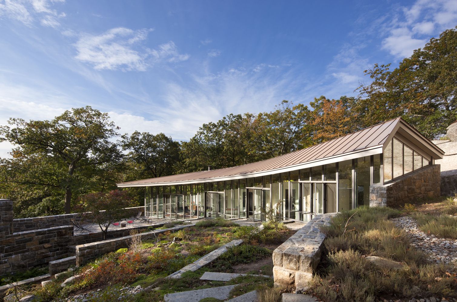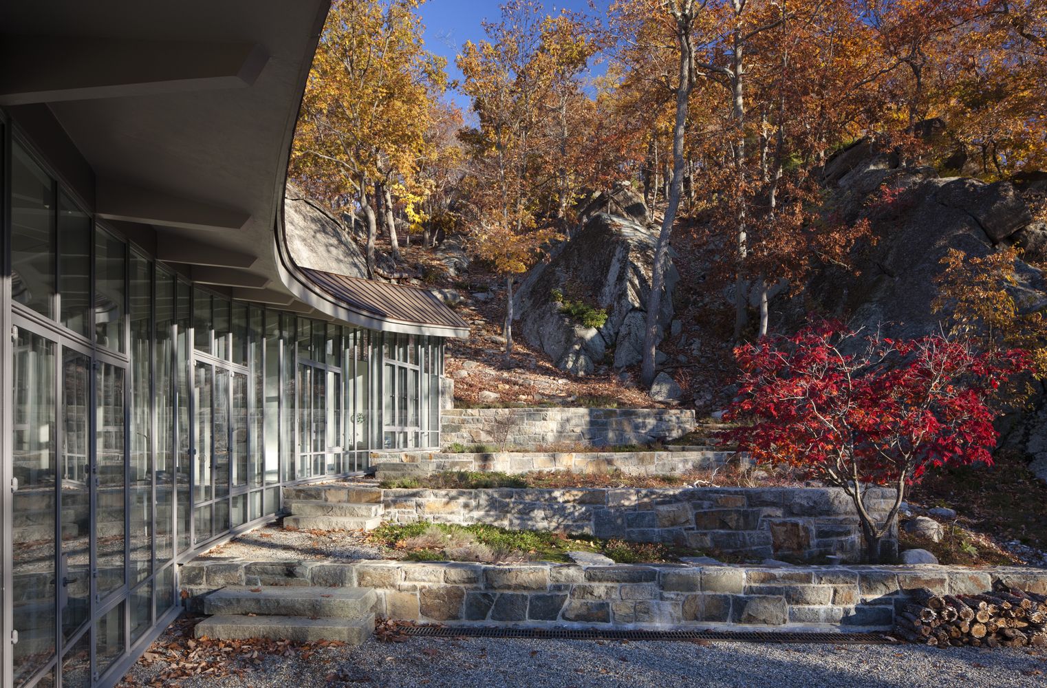 Dom składa się z trzech zamkniętych poziomów mieszkalnych oraz sekwencji tarasów zewnętrznych, które tworzą opadającą ścieżkę wzdłuż zbocza. Najniższy poziom pełni funkcję ogrodowego salonu z dziedzińcem wejściowym, wyżej znajdują się hall, biblioteka i sypialnia gościnna, a całość wieńczy przeszklony pawilon o podwójnej wysokości z panoramicznym widokiem na jezioro Tuxedo. Ten poziom obejmuje salon, kuchnię, jadalnię oraz sypialnię główną, połączone z tarasowymi ogrodami wpisanymi w łuk bryły i naturalne wychodnie skalne. Zastosowane materiały – trwałe, szlachetnie starzejące się pod wpływem czasu i pogody – podkreślają ideę architektury zintegrowanej z naturą, zacierając granice między wnętrzem a krajobrazem.