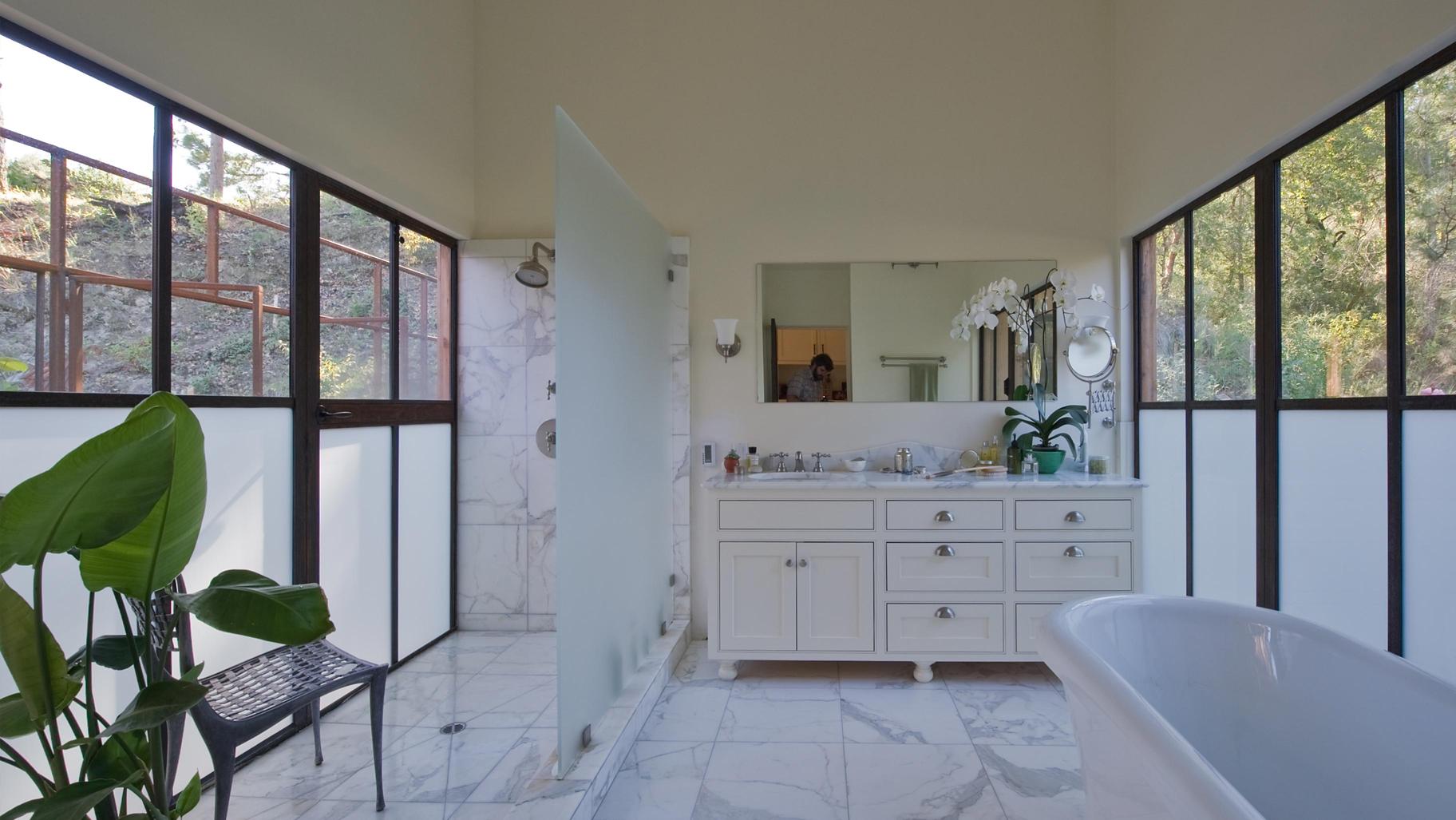 - łazienkę „zamkniętą w szklanym pudełku”, tworzącą wrażenie kąpieli na łonie natury.