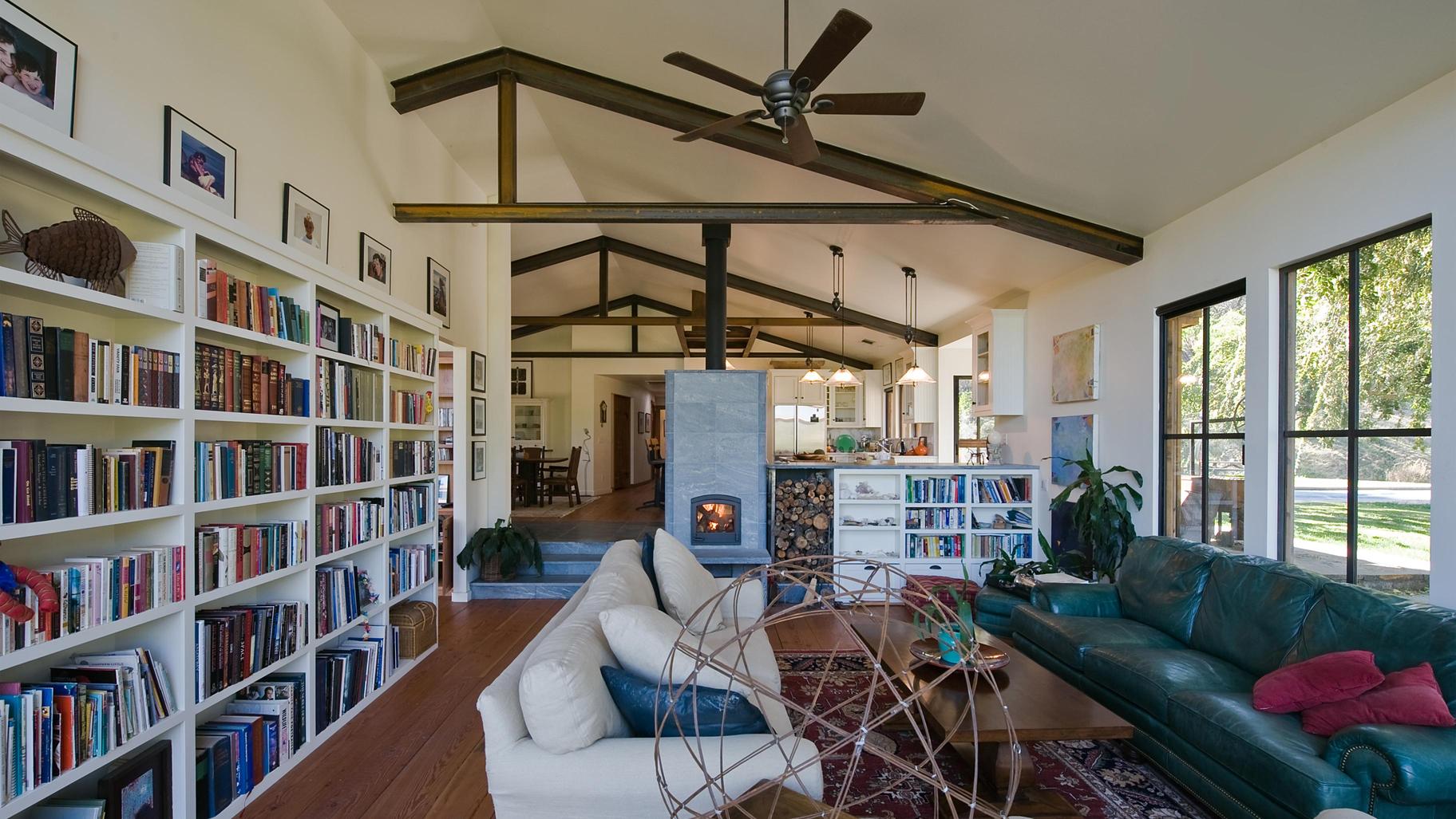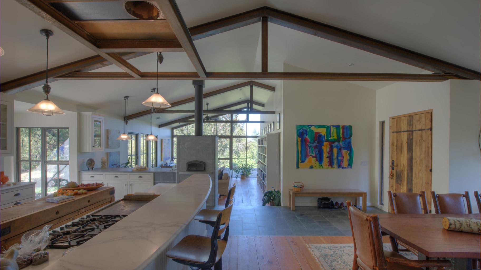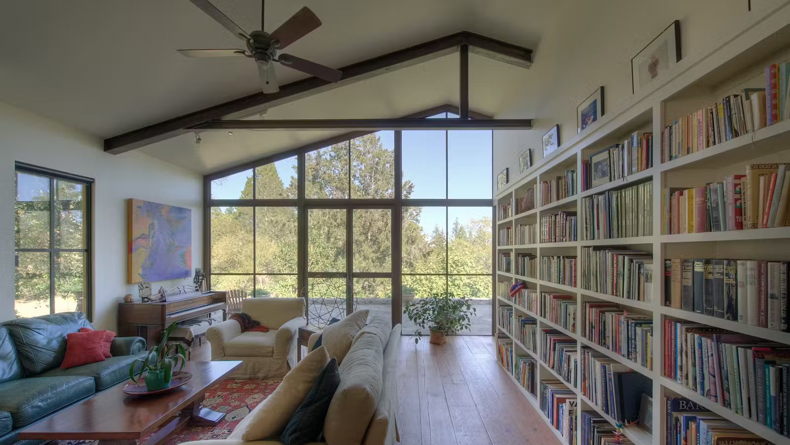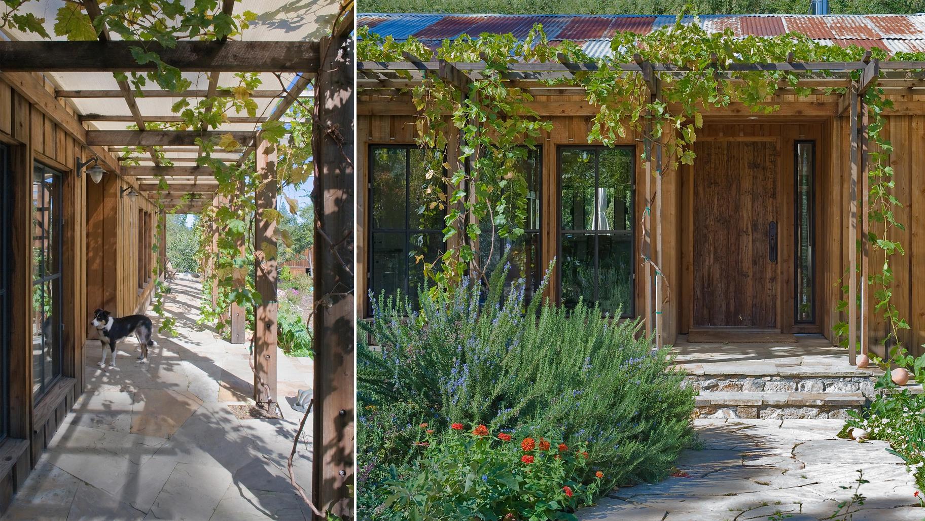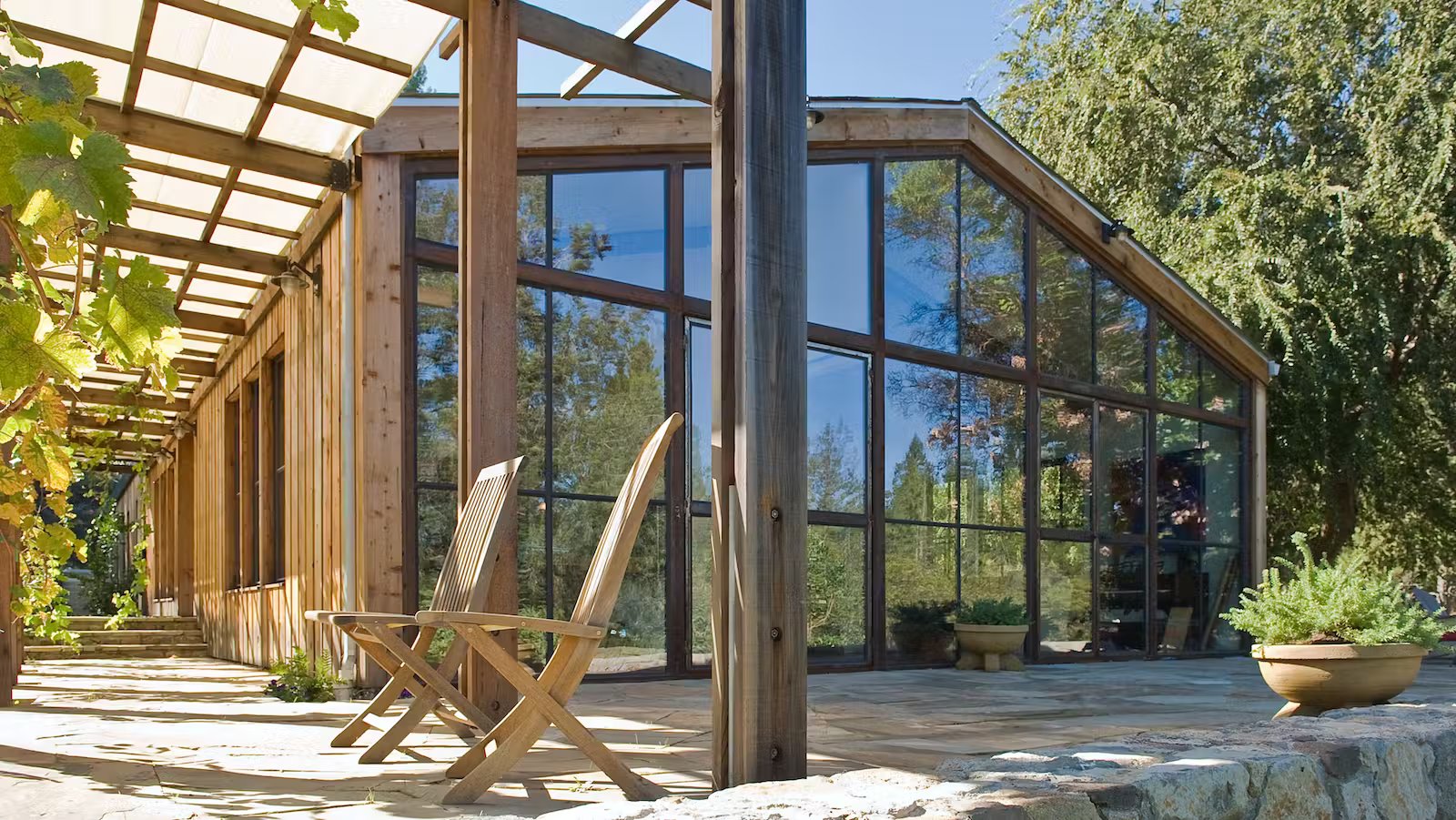 McDonald’s Residence to przykład nowoczesnej stodoły, która zyskała nowe życie na ranczu z lat 90. w Angwin (Północna Kalifornia). Dzięki projektowi Lundberg Design, dom został przekształcony z ponurego stucco ranch burgera w jasną, ciepłą rezydencję wychodzącą na wzgórza i staw. Kluczowa zmiana: zamiana sztukaterii na naturalną sekwoję — ciepłą, trwałą i ekologiczną. Pionowa okładzina, belki i kratownice z sekwoi nadają fasadzie głębię i integrują ją z otoczeniem. Drewniana struktura współgra z ciemnymi elementami stalowymi, tworząc wyrazisty kontrast.