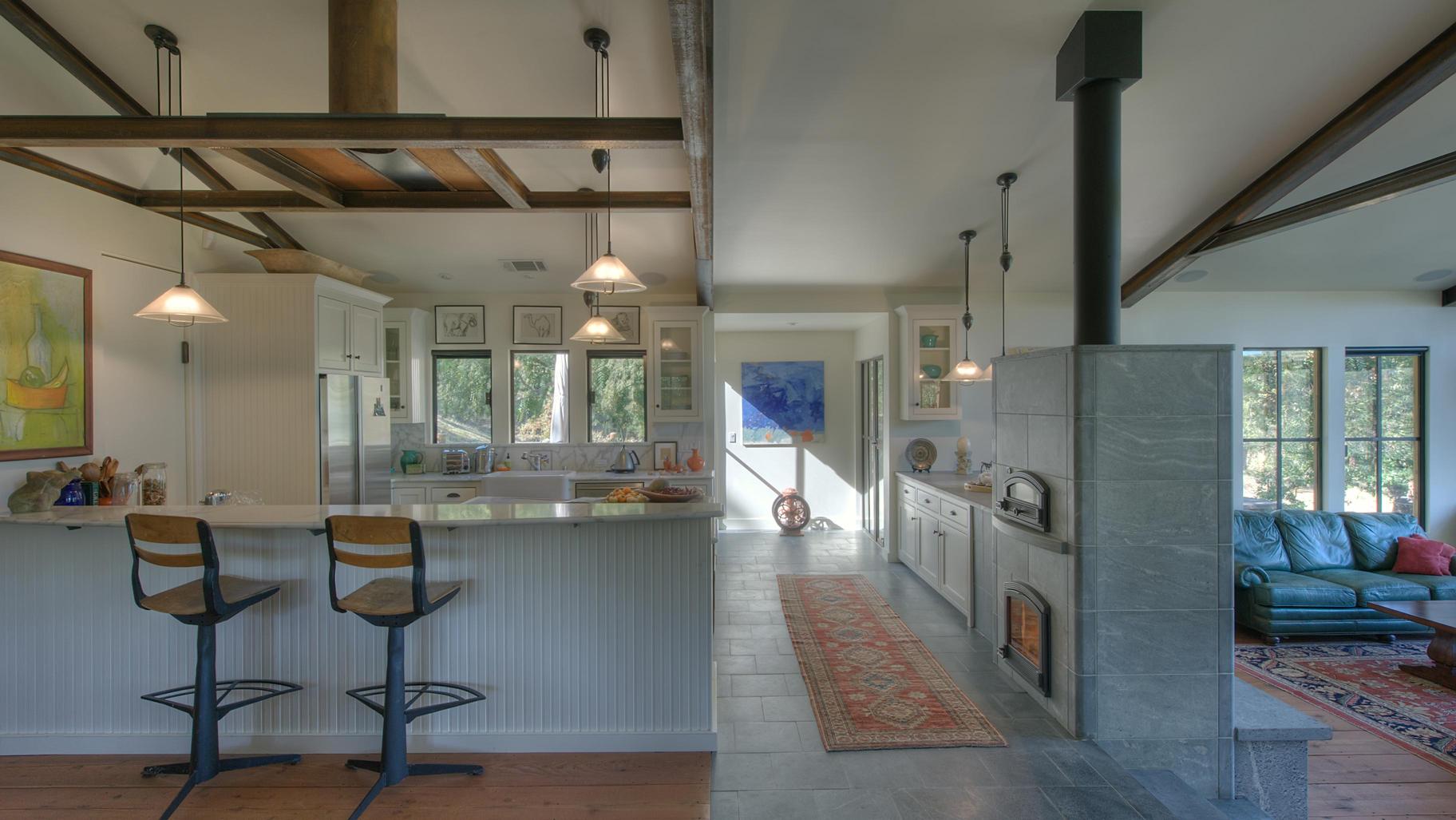 Wnętrze zyskało wysokość dzięki obniżeniu podłogi w salonie i usunięciu sufitu – przestrzeń nabrała lekkości. Zmiana czterospadowego dachu na dwuspadowy i dodanie przeszklonej elewacji oraz tarasu całkowicie otworzyły dom na krajobraz. W centrum wnętrza znajduje się fiński piec ze steatytu, który ogrzewa przestrzeń publiczną w zimie.