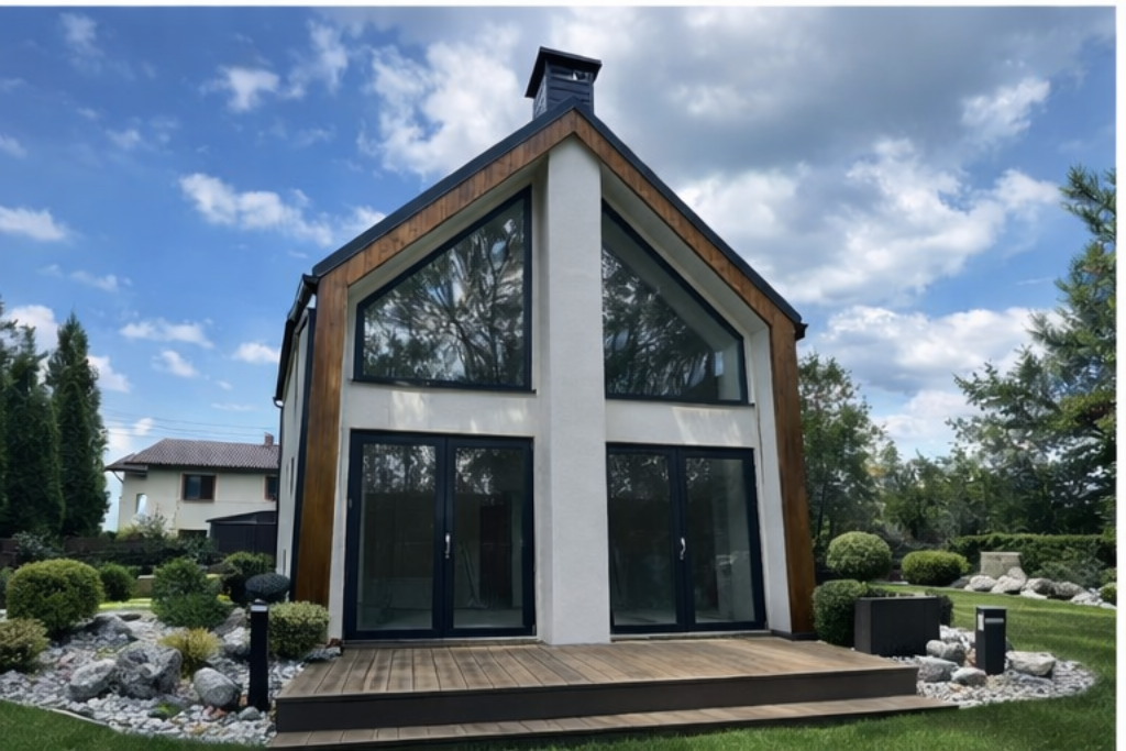 Minimalistyczna bryła, naturalne drewno i imponujące, dwukondygnacyjne przeszklenie od strony ogrodu. MDDOM 41 to kompaktowy dom, który pokazuje, że komfort nie jest funkcją metrażu, lecz proporcji i światła.
