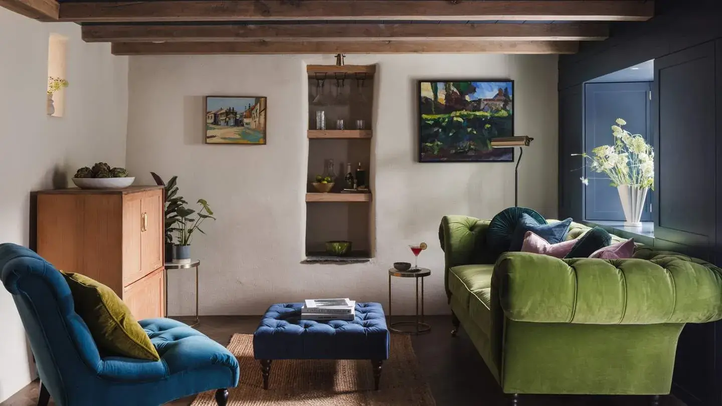 Przytulny salon z kamiennym kominkiem, wnękami i zabytkowymi belkami oddają hołd architektonicznemu dziedzictwu Melynsy. Niebieska, stylowa boazeria kontrastuje z dziełami sztuki eksponowanymi na neutralnych ścianach, oferując kojące tło do wspólnego wypoczynku. W Melynsy znajdują się cztery stylowe sypialnie. Pierwsza sypialnia na parterze promieniuje złotymi odcieniami i dębowymi panelami. Obok znajduje się łazienka z prysznicem, ozdobiona kafelkami ze złoconymi akcentami. Na górze znajduje się druga sypialnia z pudrowo-różowymi akcentami. Centralnym punktem jest łóżko king-size, podczas gdy urocze siedzisko przy oknie jest najprzytulniejszym z porannych miejsc na kawę. Równie czarująca, z oszałamiającymi odcieniami turkusu, botaniczną tapetą i oryginalnym wiktoriańskim kominkiem, jest trzecia sypialnia. Obok znajduje się rodzinna łazienka, ozdobiona luksusowym ciemnym marmurem i misternymi, złotymi płytkami inspirowanymi syrenami. W wystawnej sypialni głównej królują ziemiste odcienie, ze sklepionymi drewnianymi belkami i tapetą w stylu leśnym.