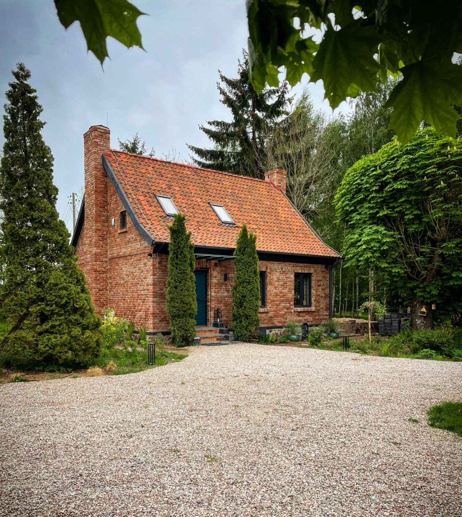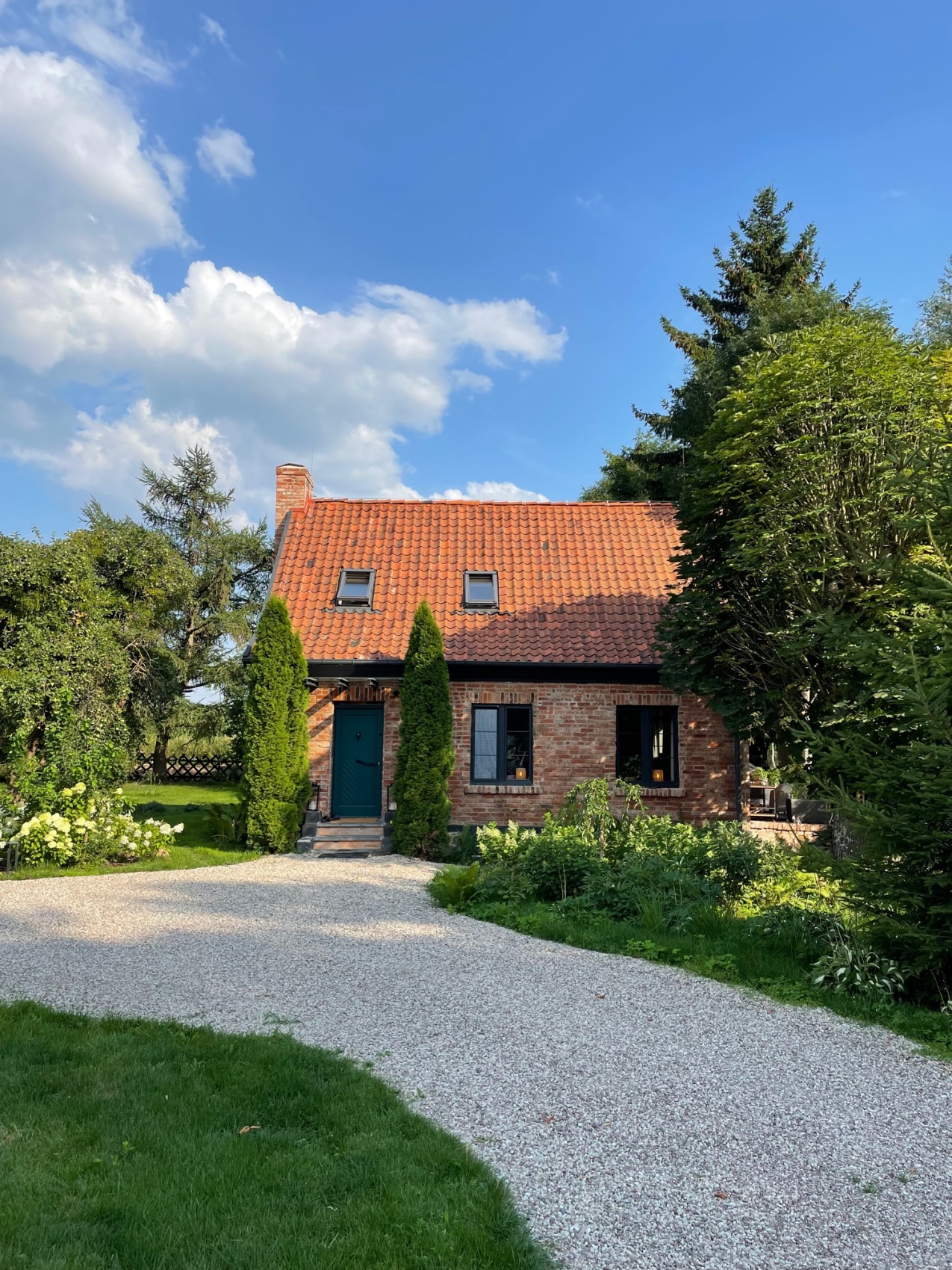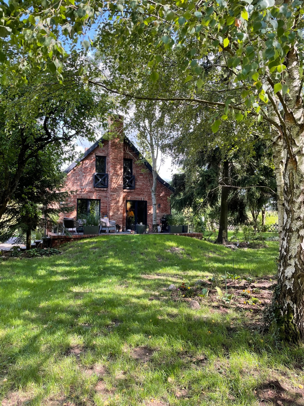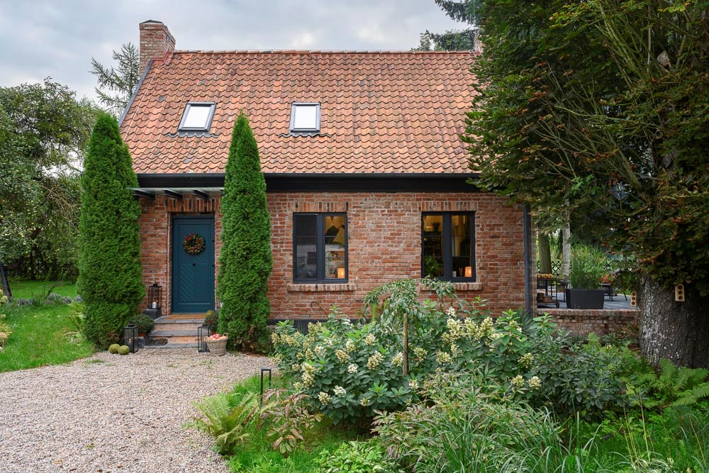 Budynek, choć dobrze utrzymany, wymagał przekształcenia, aby nabrać wyjątkowego charakteru. Z elewacji usunięto żółte tynki, odsłaniając naturalną cegłę, której struktura stała się głównym elementem kompozycji. Centralny komin zastąpiono dwoma nowymi, zbudowanymi z cegły rozbiórkowej, co poprawiło proporcje domu i nadało mu bardziej smukły wygląd. Wnętrza otwarto na światło – małe okna powiększono, a od strony południowej wprowadzono duże przeszklenia tarasowe. Dzięki temu parter domu zyskał przestronność i lepsze powiązanie z ogrodem. Od tej strony powstał również taras, który latem staje się naturalnym przedłużeniem salonu.