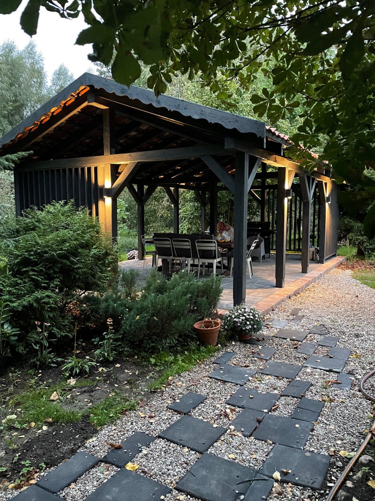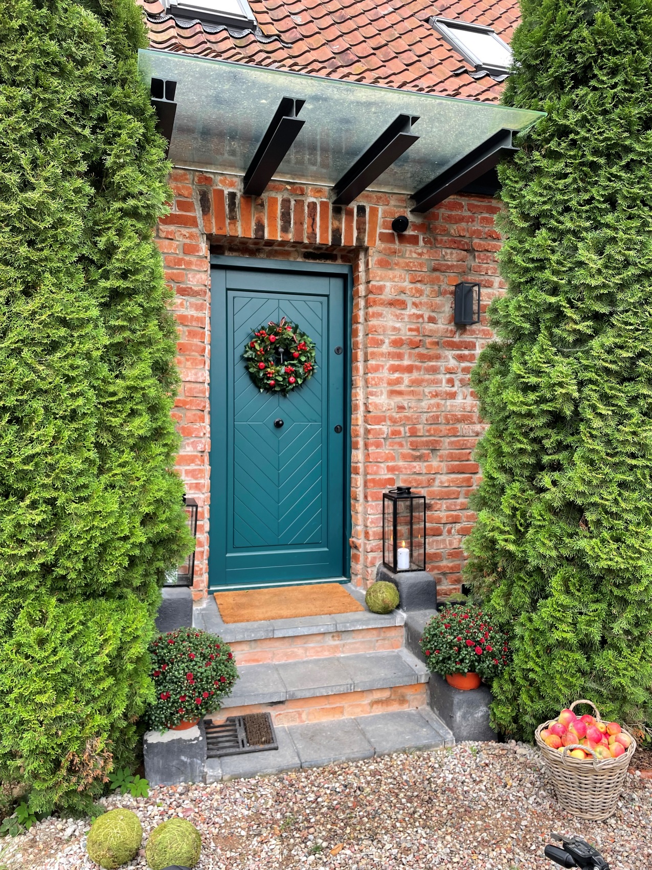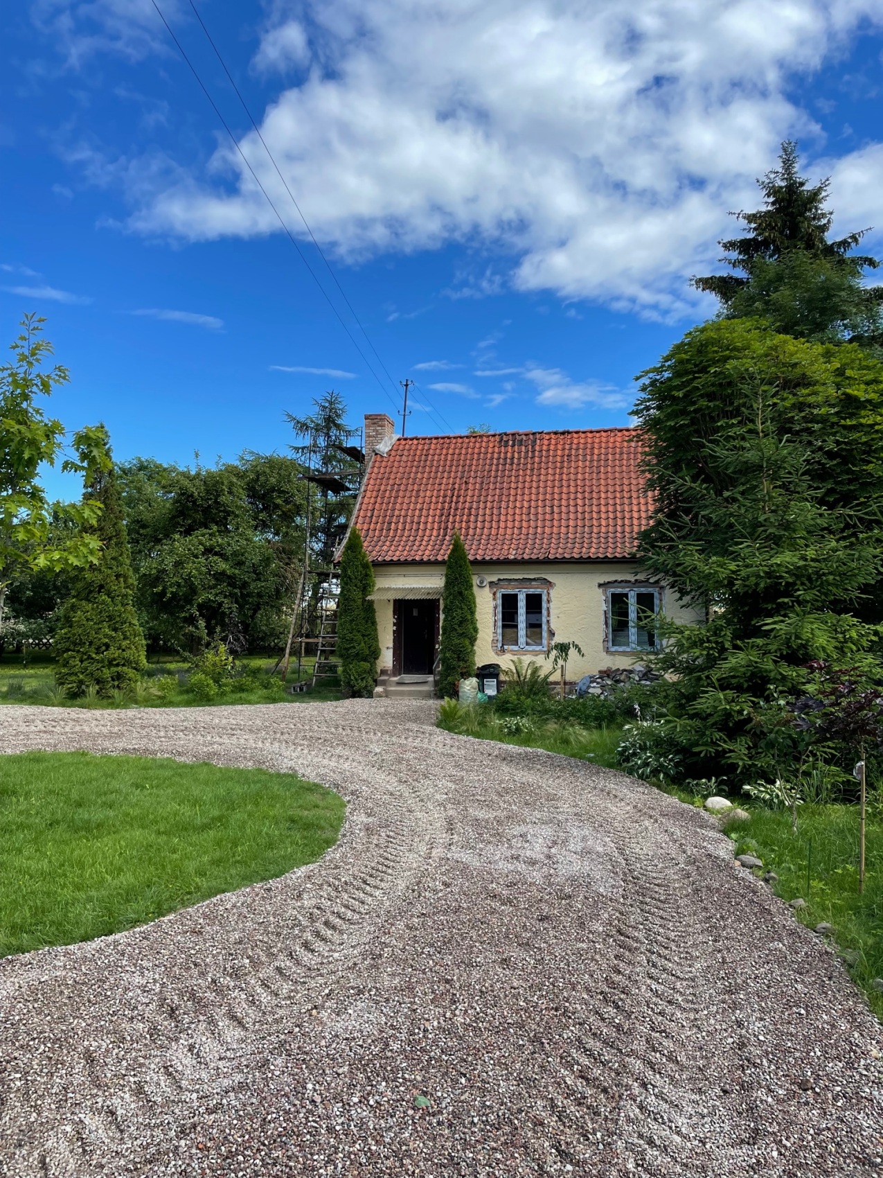 Budynek, choć dobrze utrzymany, wymagał przekształcenia, aby nabrać wyjątkowego charakteru. Z elewacji usunięto żółte tynki, odsłaniając naturalną cegłę, której struktura stała się głównym elementem kompozycji. Centralny komin zastąpiono dwoma nowymi, zbudowanymi z cegły rozbiórkowej, co poprawiło proporcje domu i nadało mu bardziej smukły wygląd. Wnętrza otwarto na światło – małe okna powiększono, a od strony południowej wprowadzono duże przeszklenia tarasowe. Dzięki temu parter domu zyskał przestronność i lepsze powiązanie z ogrodem. Od tej strony powstał również taras, który latem staje się naturalnym przedłużeniem salonu.