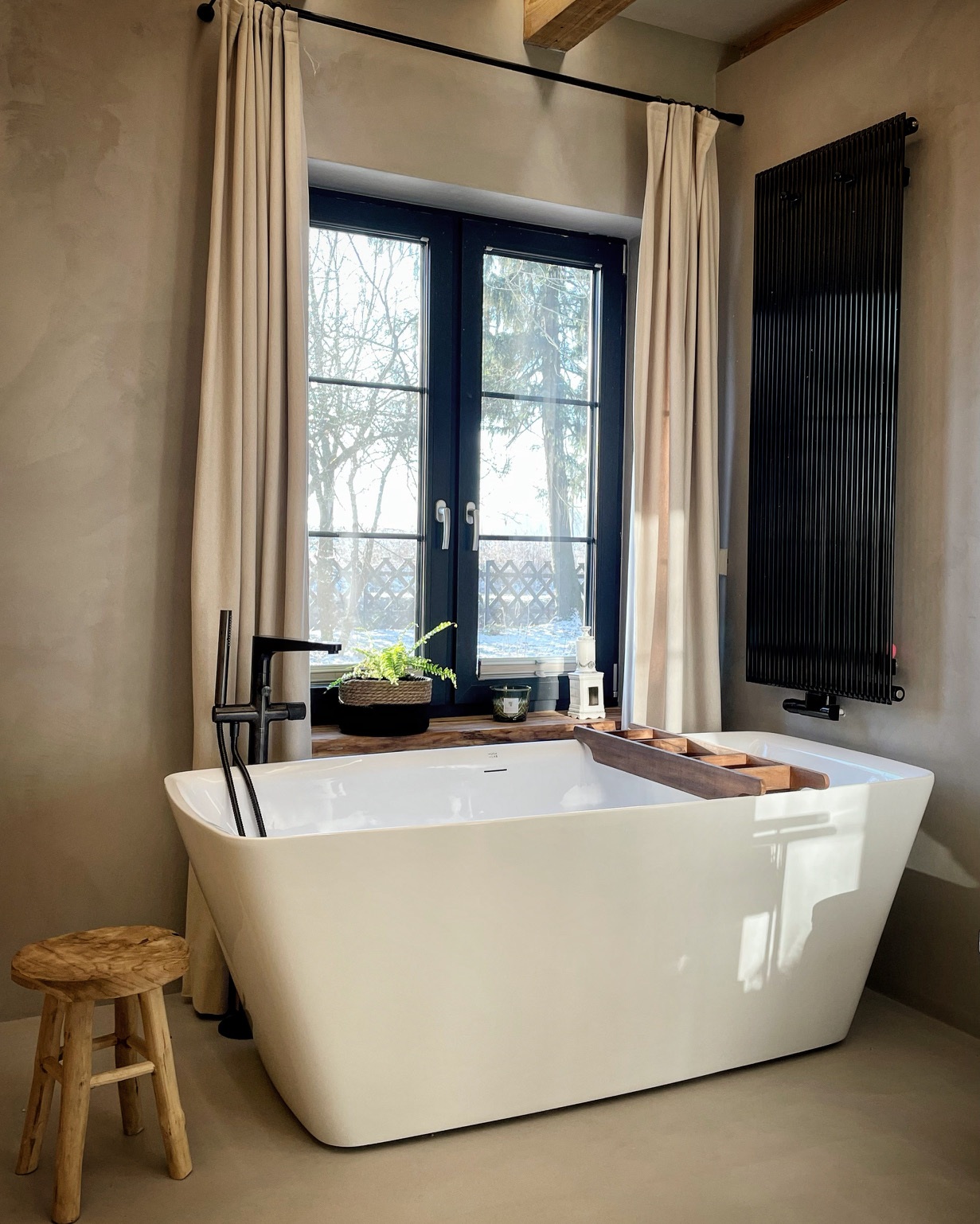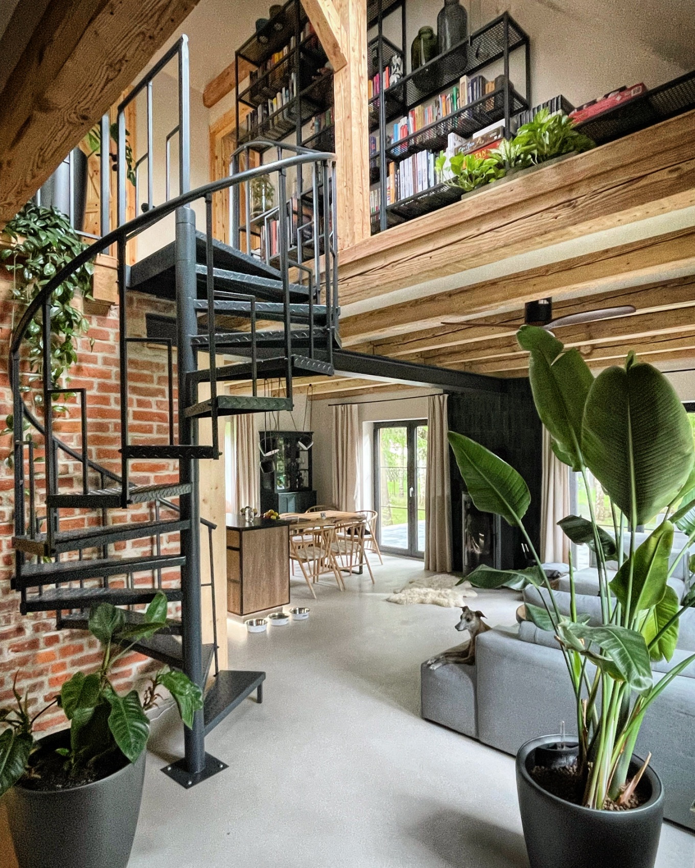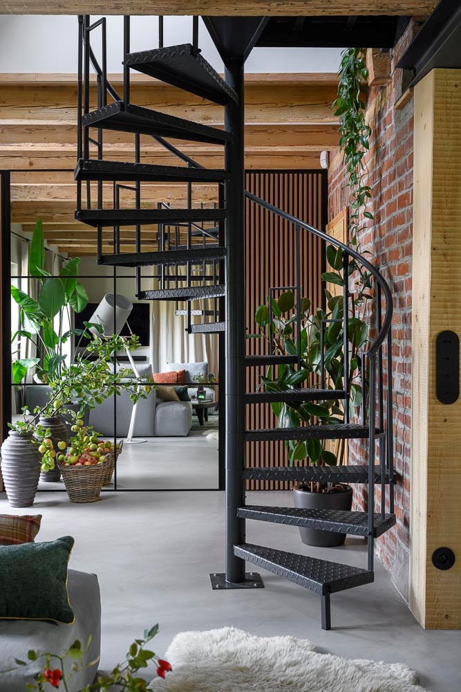 Ważnym elementem projektu było wykorzystanie materiałów odzyskanych. Stare lipowe drewno znalezione na dziedzińcu stało się blatem, stołem i parapetami. Oczyszczone, oryginalne drzwi zyskały nową funkcję wieszaka, a dawne okna przemieniono w lustra. Poddasze zdobią odsłonięte belki i stare deski podłogowe, które przeplatają się z elementami odzyskanymi z podsufitki. Dzięki takim rozwiązaniom we wnętrzach wciąż czuć ducha dawnego domu, mimo że ich charakter został zdefiniowany na nowo.
