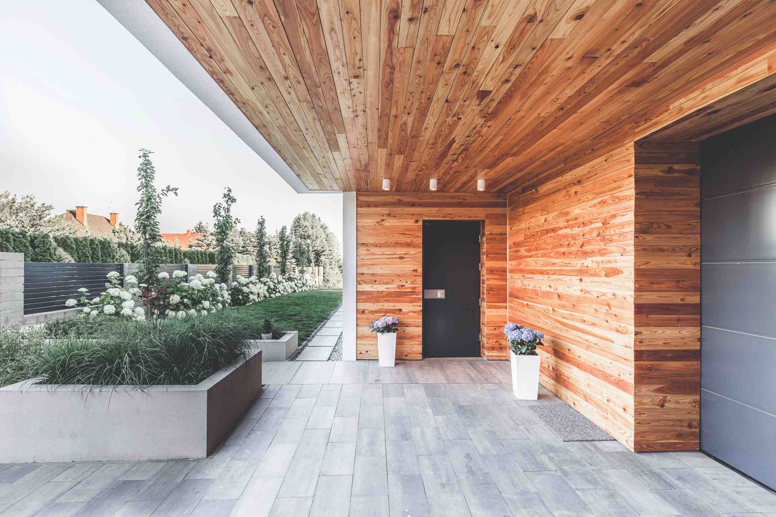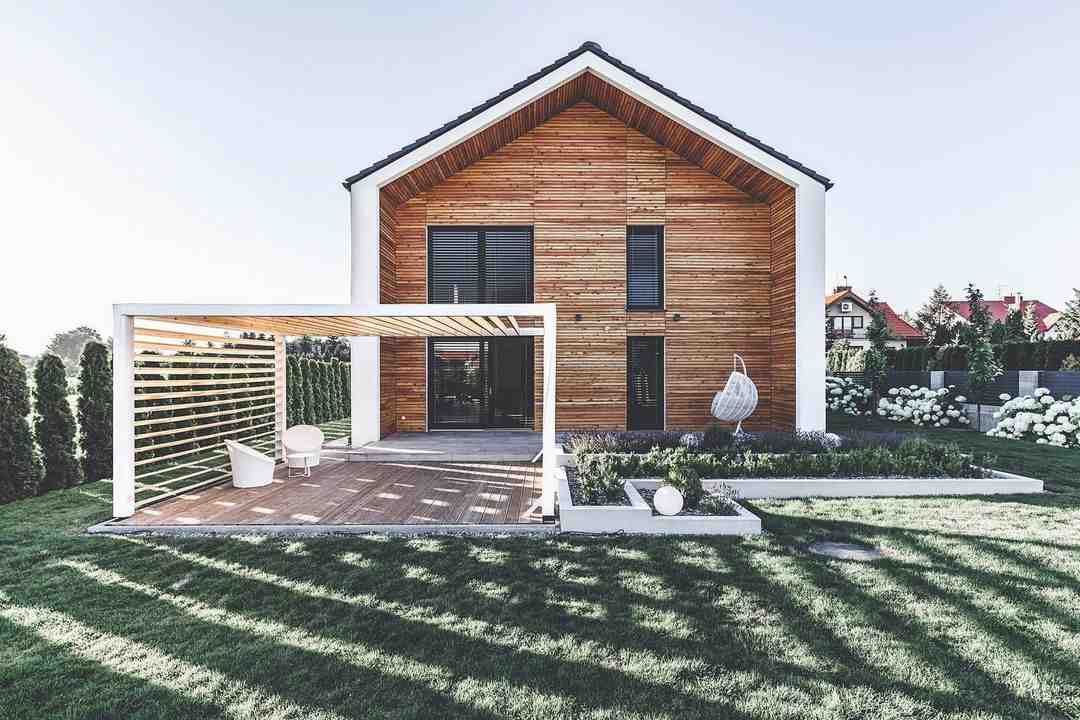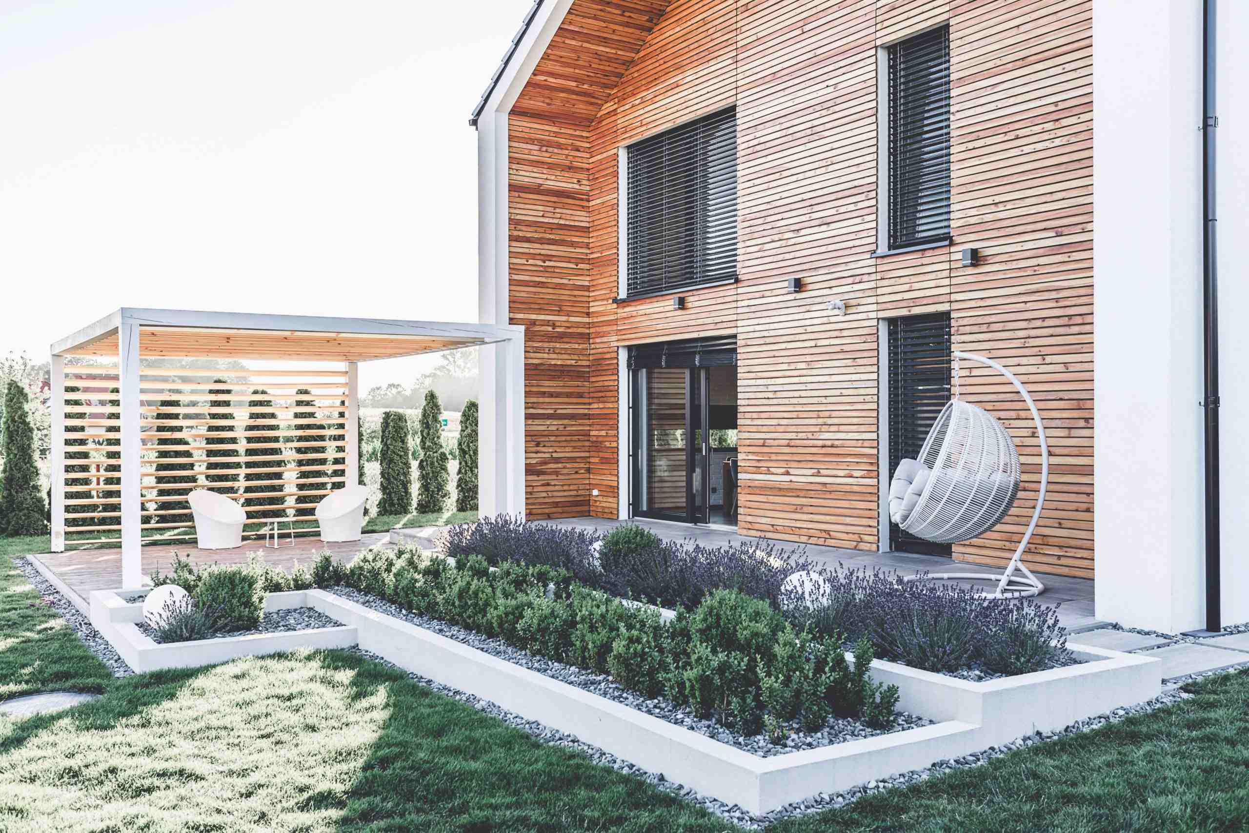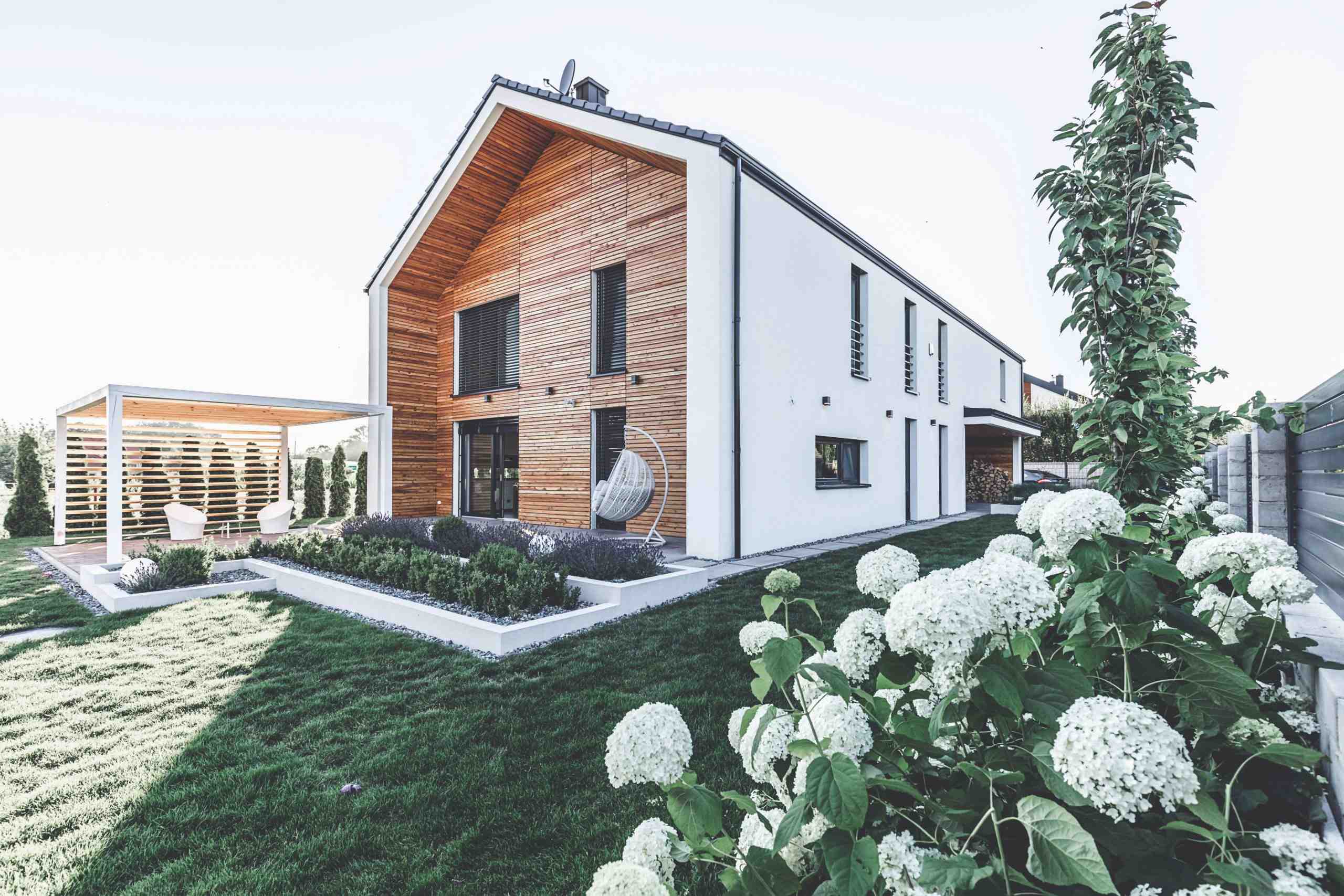 Kluczowym elementem projektu stały się wnęki wykończone deską z modrzewia syberyjskiego, które pojawiają się zarówno na elewacji frontowej, jak i na ścianie szczytowej budynku. Na prośbę inwestorów zaprojektowano zadaszone przejście z garażu do wejścia głównego, co zaowocowało wycięciem kubika w bryle oraz zastosowaniem zadaszenia na całej długości wnęki. Analogiczne rozwiązanie zastosowano od strony bocznej, tworząc ponadmetrową przestrzeń wypoczynkową przed domem. Zamiast kosztownej, w pełni przeszklonej elewacji, architekci zdecydowali się na mniejsze okna rozmieszczone w rytmicznym podziale, co pozwoliło zoptymalizować budżet. Całość dopełnia altana przed domem, która formą i materiałami nawiązuje do budynku, tworząc spójną i konsekwentną kompozycję architektoniczną.